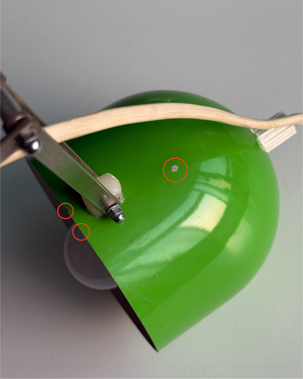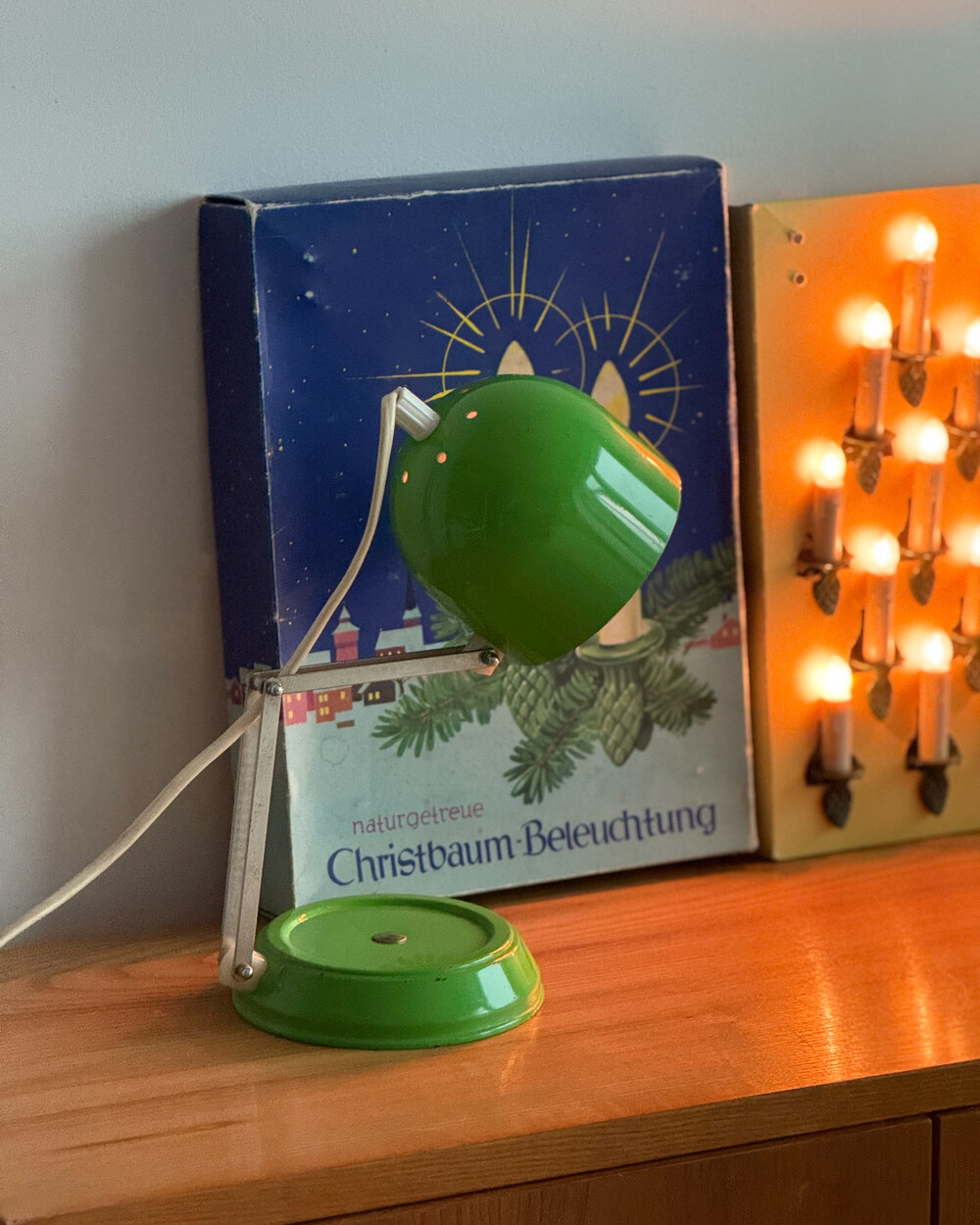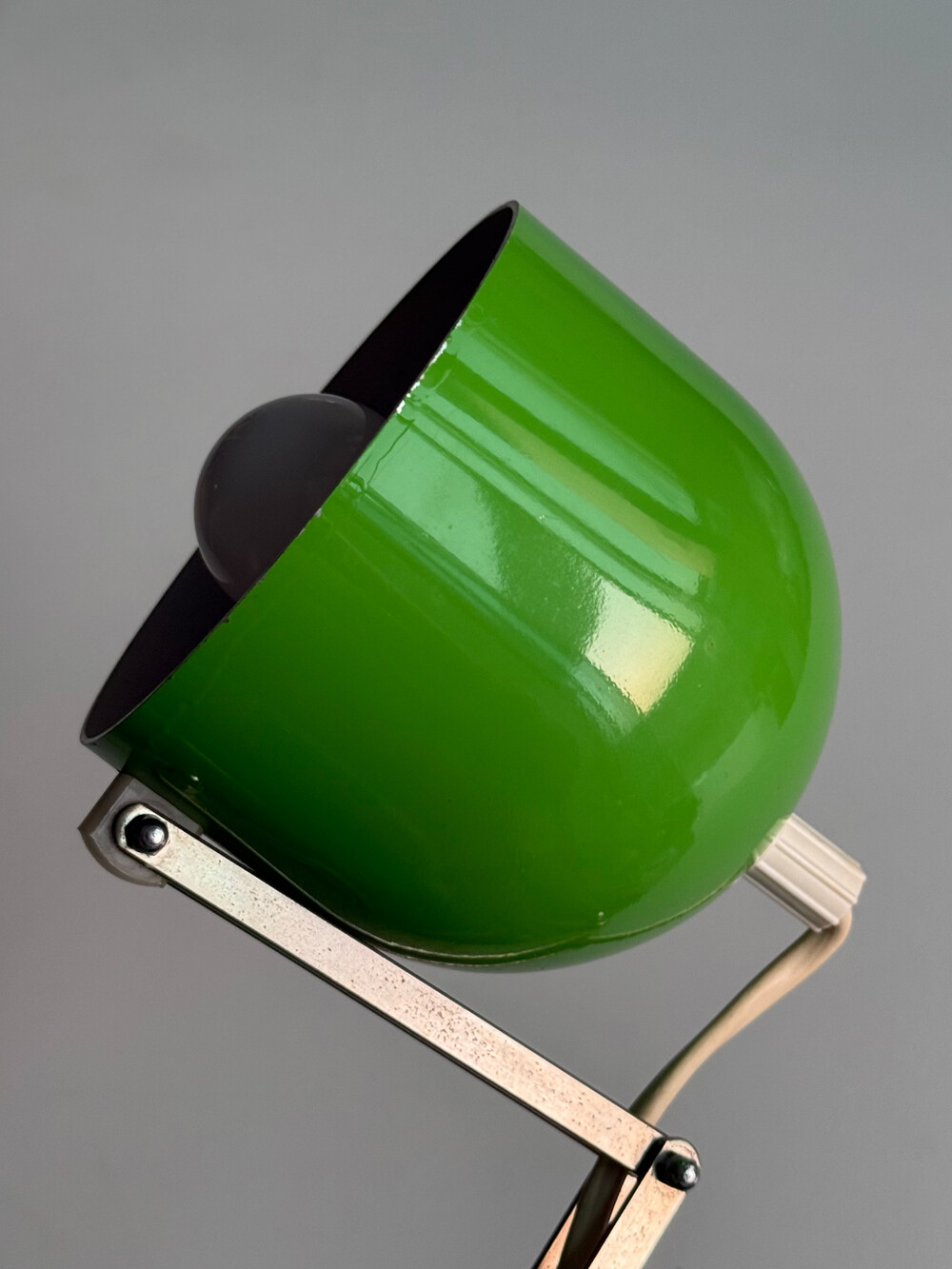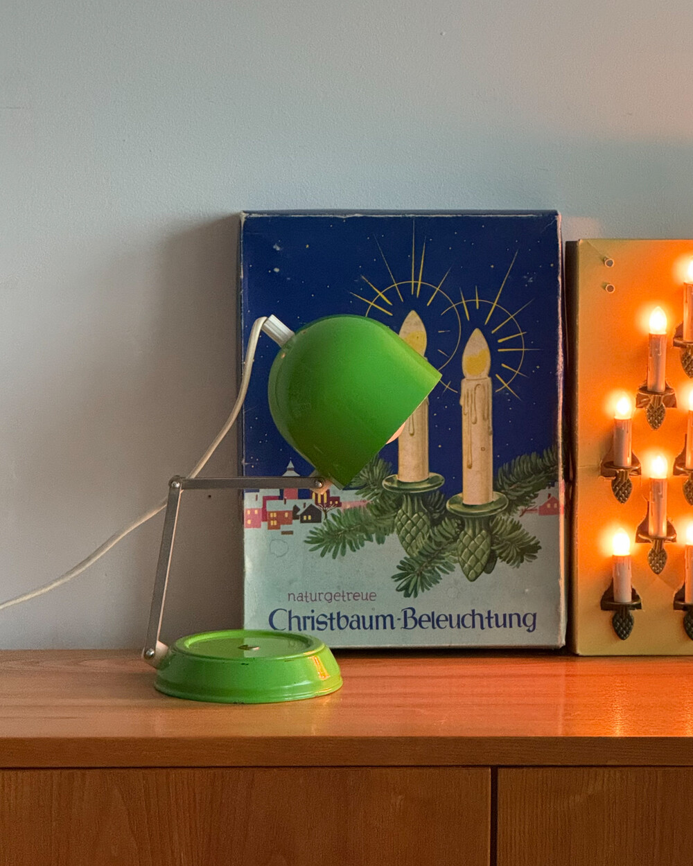 1970년대 독일에서 제작된 빈티지 데스크 램프입니다. 그린 컬러의 원형 메탈 베이스로 이루어져 있습니다. 접이식으로 각도 조절이 자유로운 암 구조로 다양한 연출이 가능합니다.