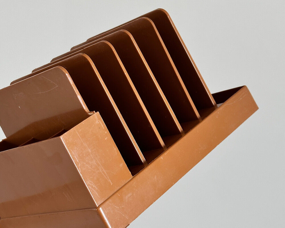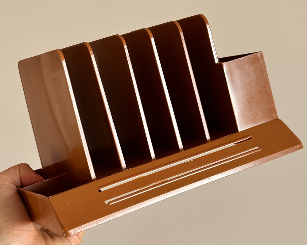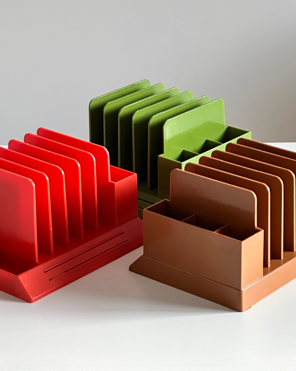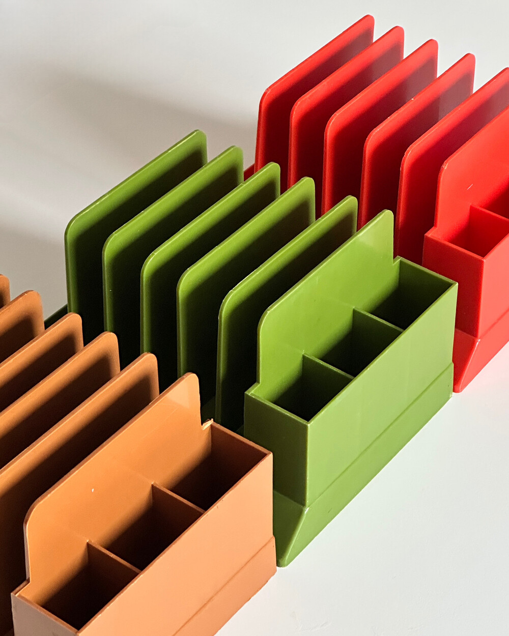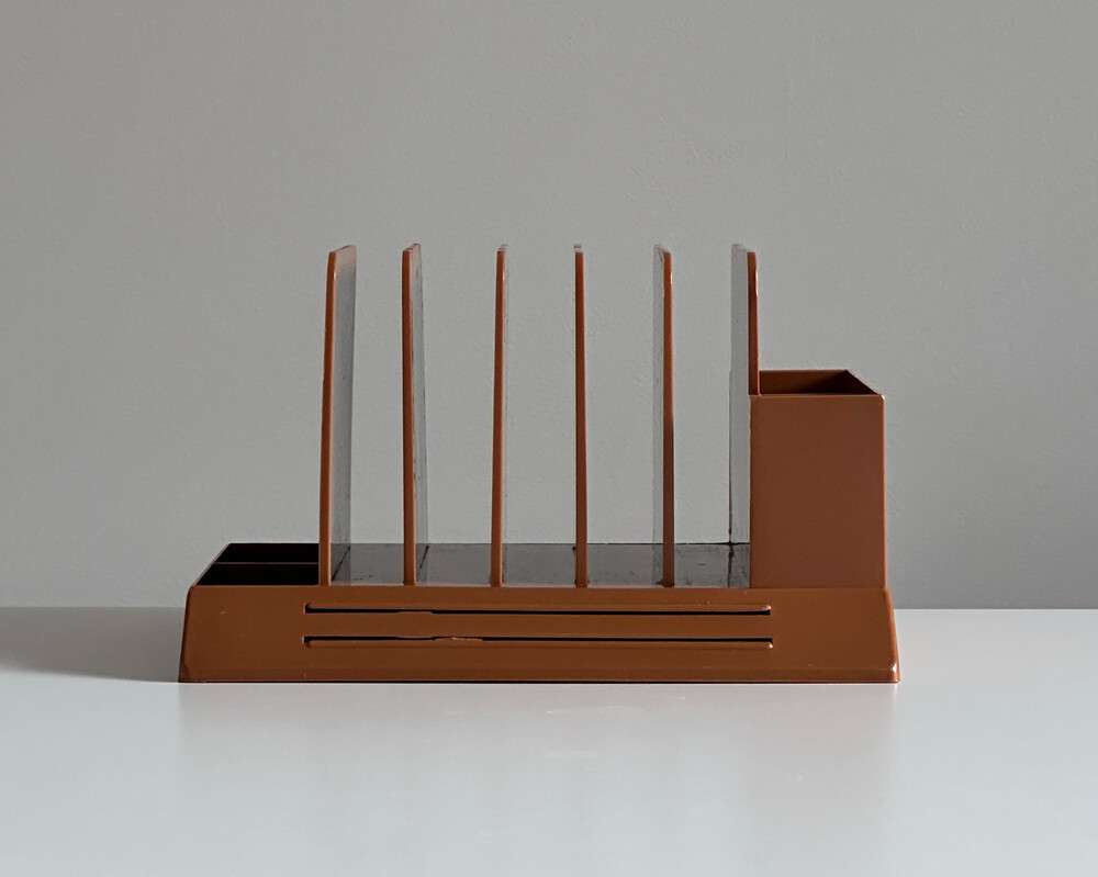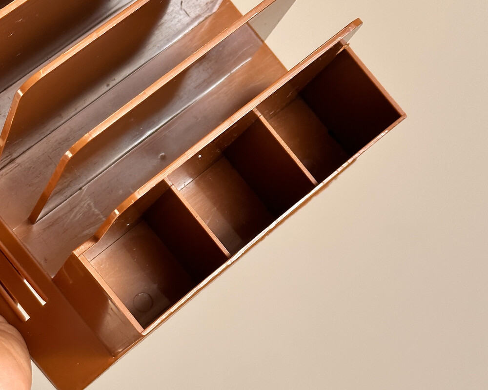 70년도 생산되었던 빈티지 데스크 오거나이저입니다. 필기구 꽃이, 엽서 보관함 등 공간의 용도에 따라 보관할 수 있는 다양한 수납공간으로 나누어져 있습니다. 오렌지, 그린, 브라운 3가지 색상으로 입고되었습니다.