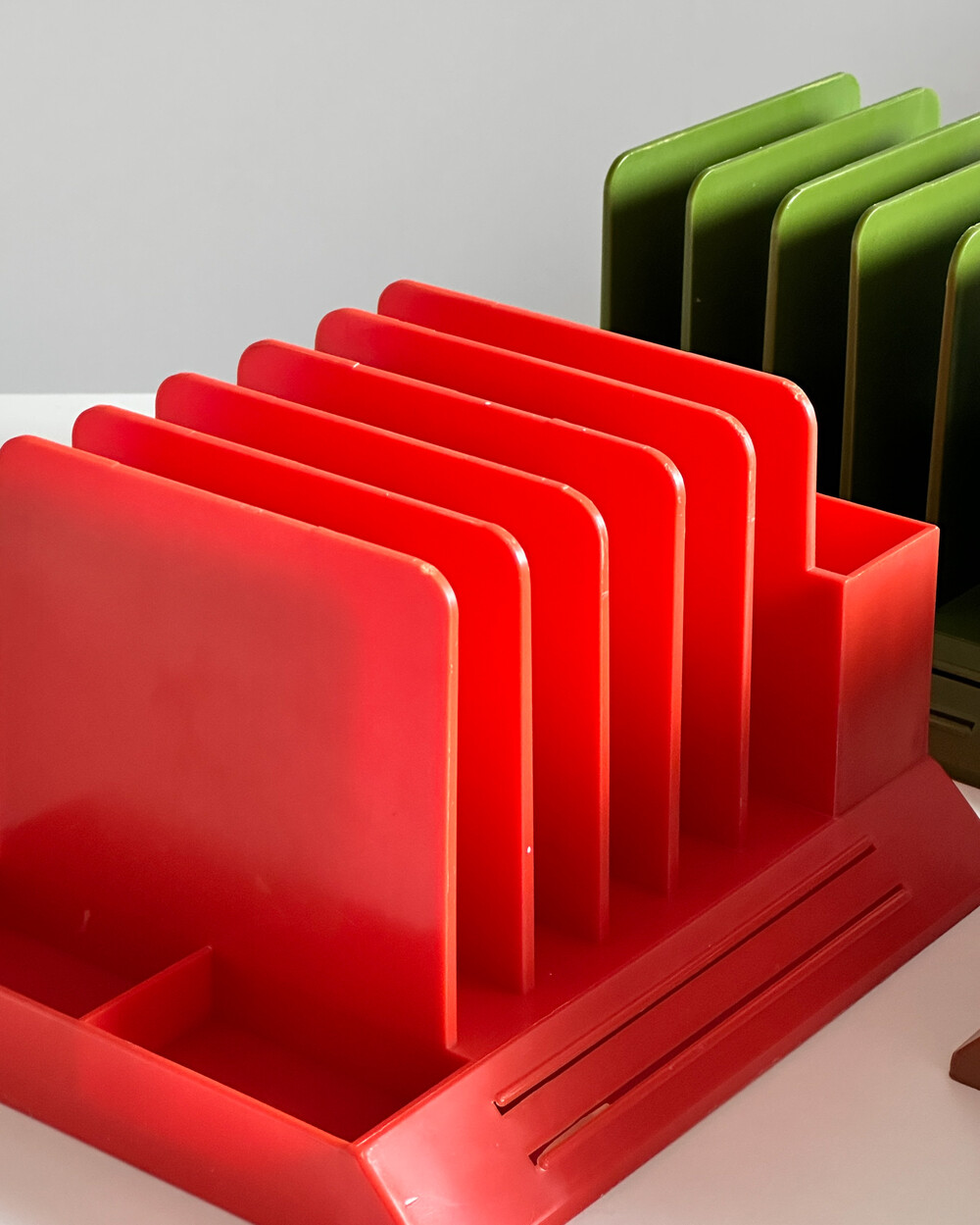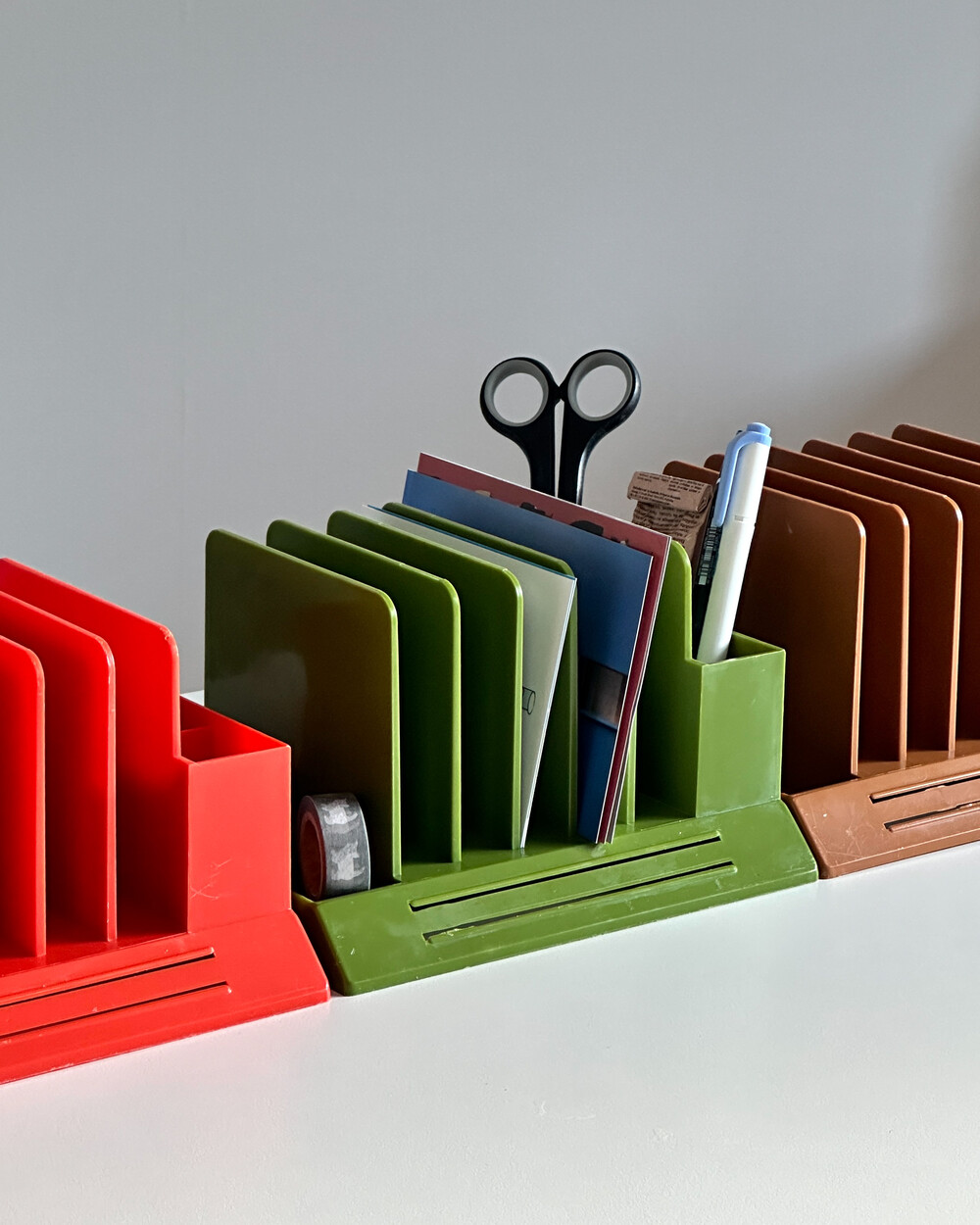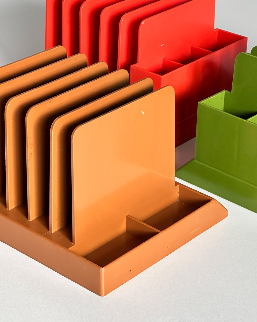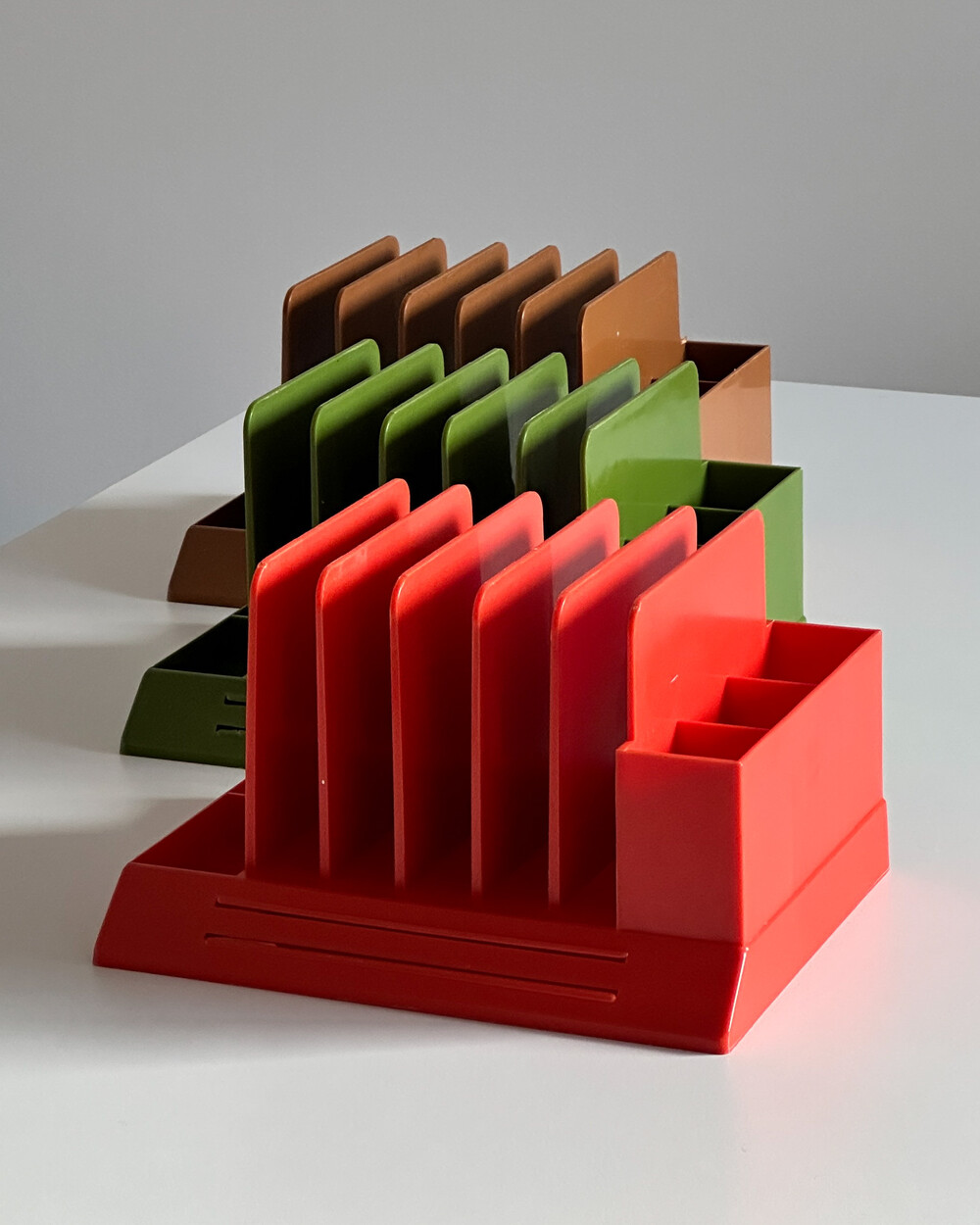 70년도 생산되었던 빈티지 데스크 오거나이저입니다. 필기구 꽃이, 엽서 보관함 등 공간의 용도에 따라 보관할 수 있는 다양한 수납공간으로 나누어져 있습니다. 오렌지, 그린, 브라운 3가지 색상으로 입고되었습니다.