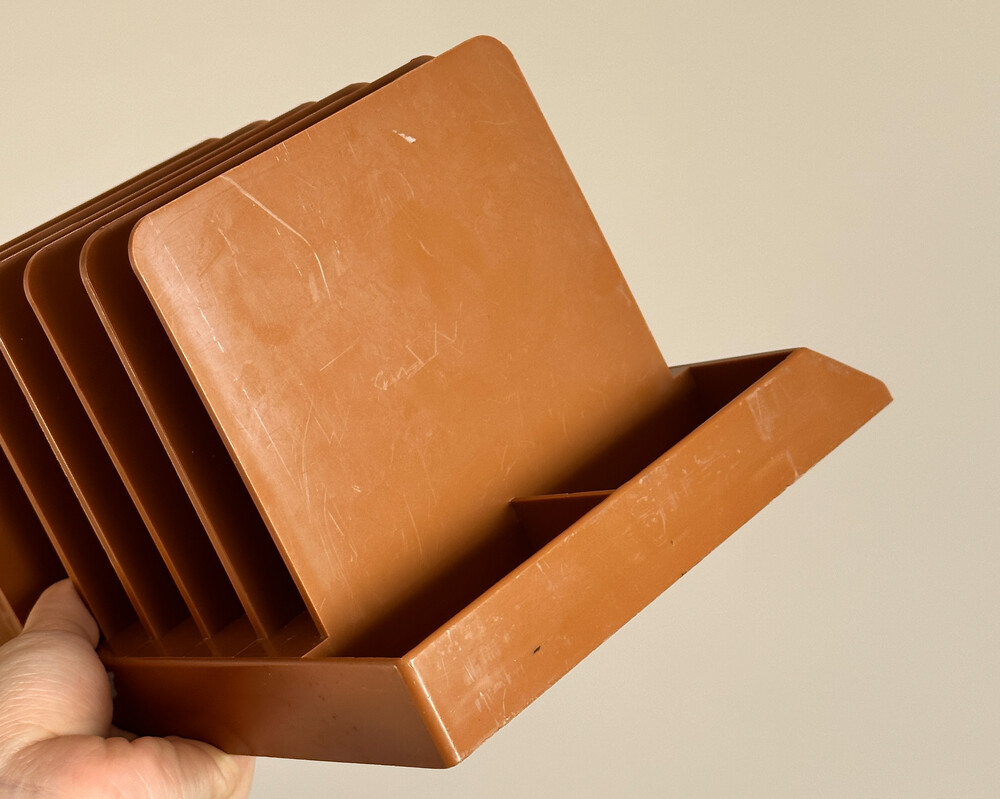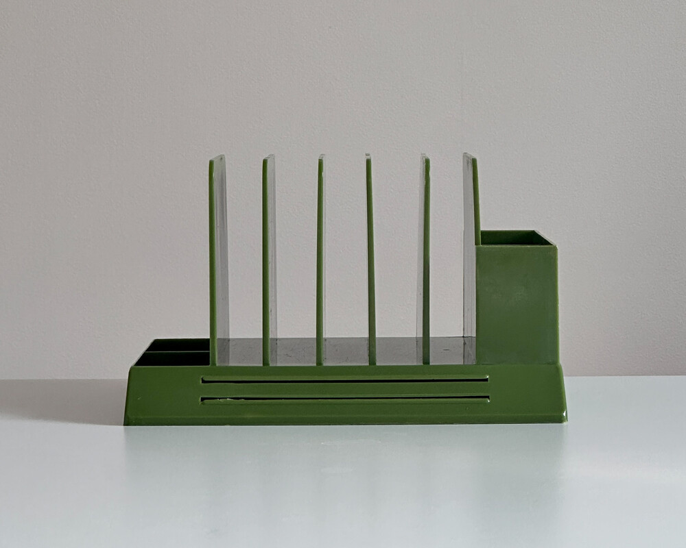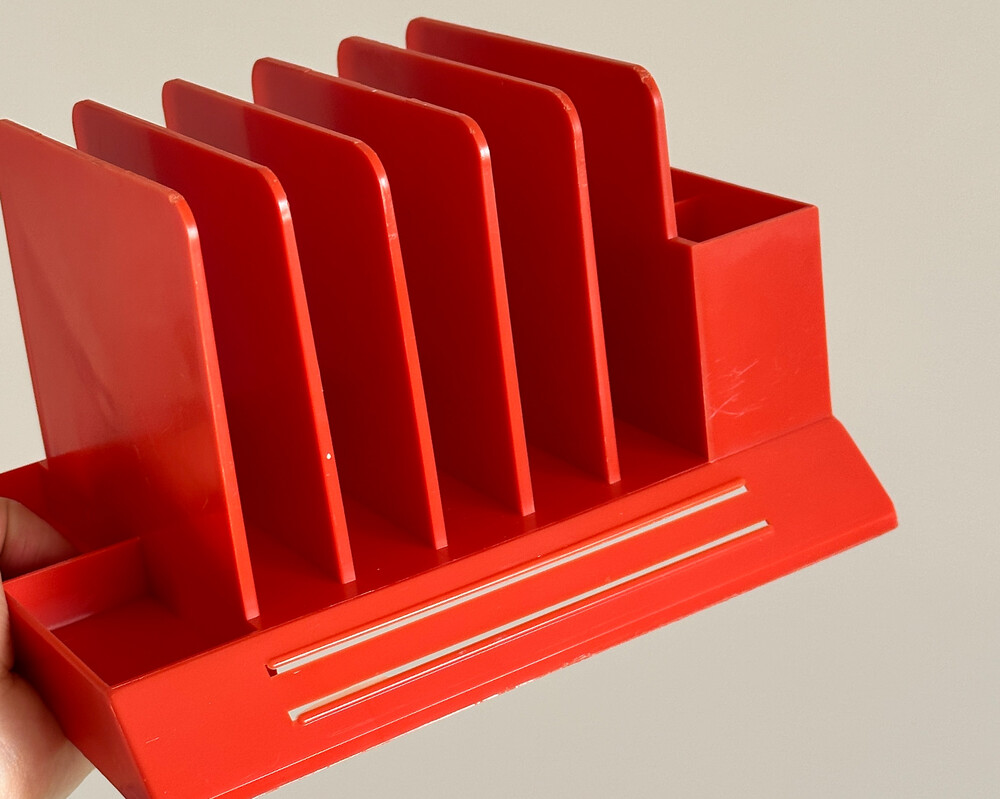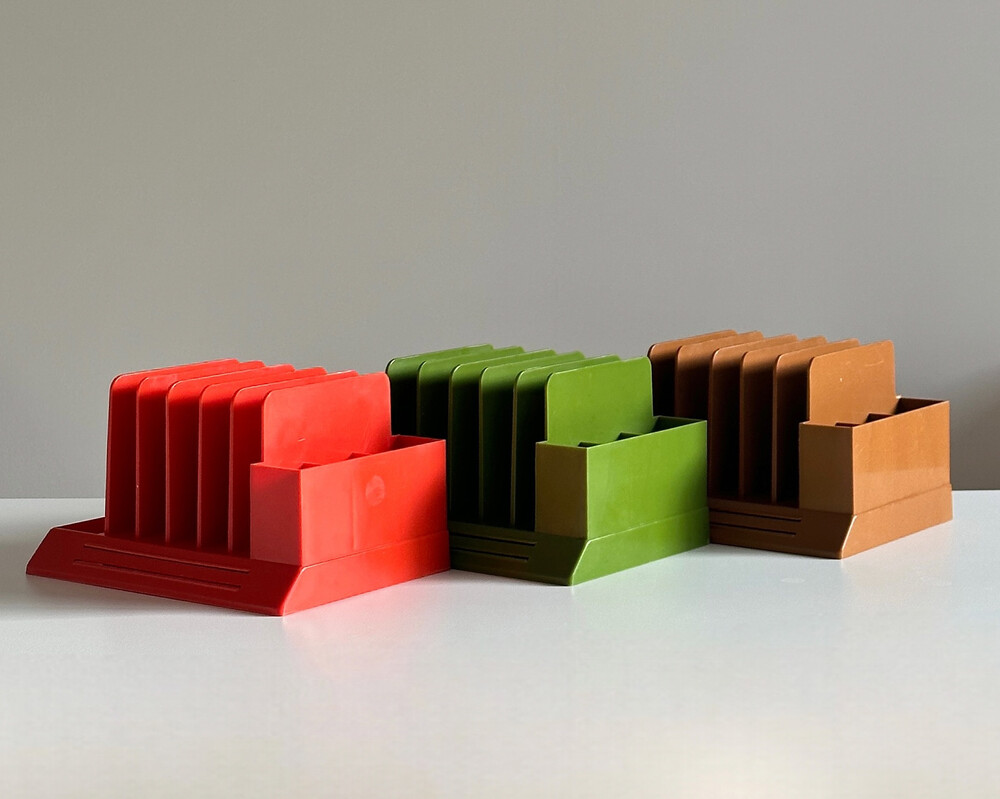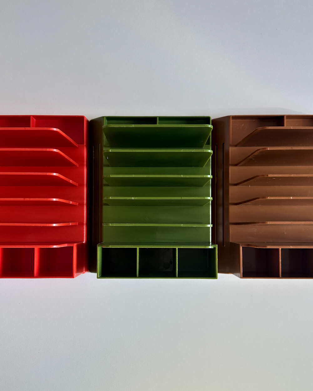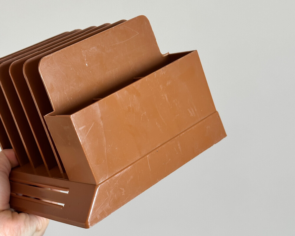 70년도 생산되었던 빈티지 데스크 오거나이저입니다. 필기구 꽃이, 엽서 보관함 등 공간의 용도에 따라 보관할 수 있는 다양한 수납공간으로 나누어져 있습니다. 오렌지, 그린, 브라운 3가지 색상으로 입고되었습니다.