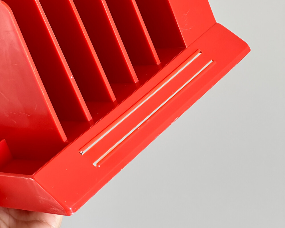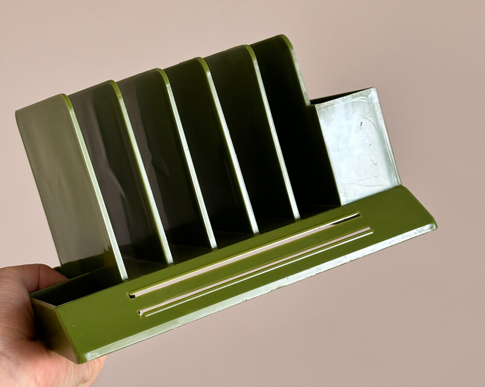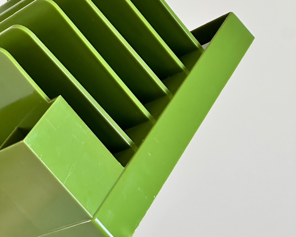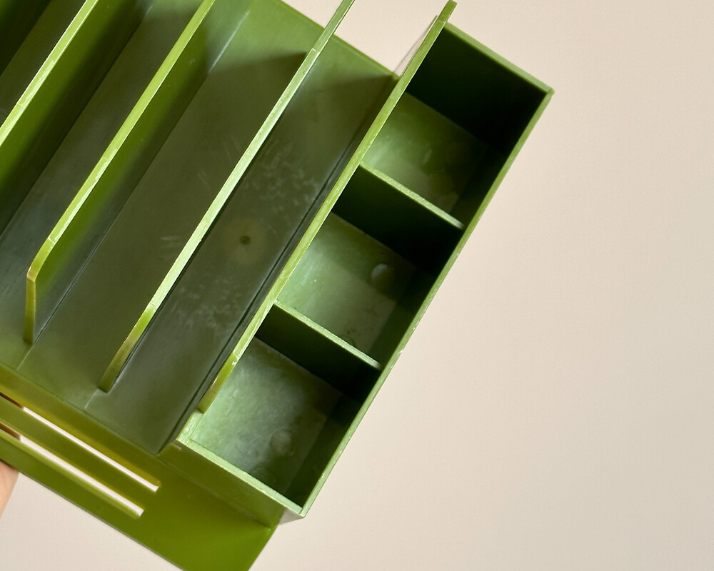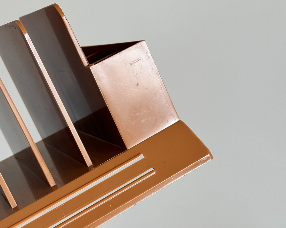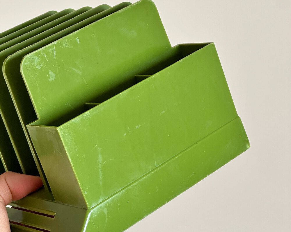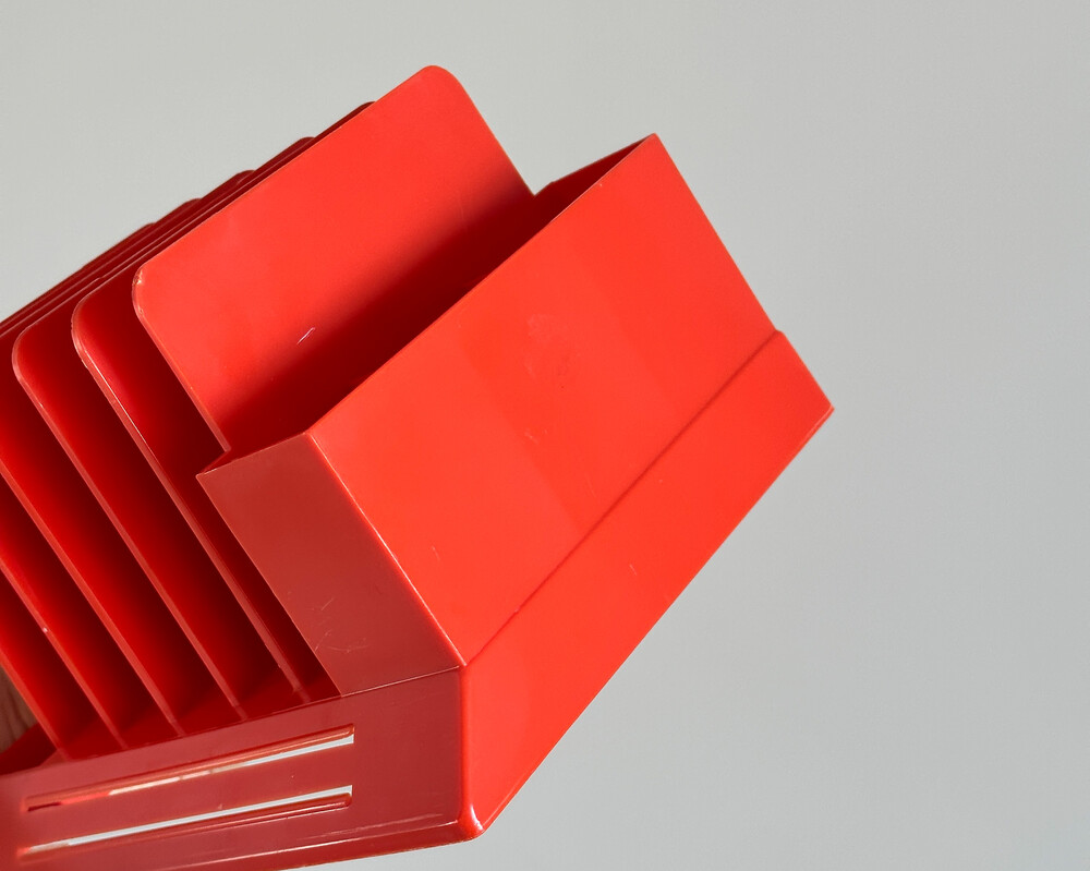 70년도 생산되었던 빈티지 데스크 오거나이저입니다. 필기구 꽃이, 엽서 보관함 등 공간의 용도에 따라 보관할 수 있는 다양한 수납공간으로 나누어져 있습니다. 오렌지, 그린, 브라운 3가지 색상으로 입고되었습니다.