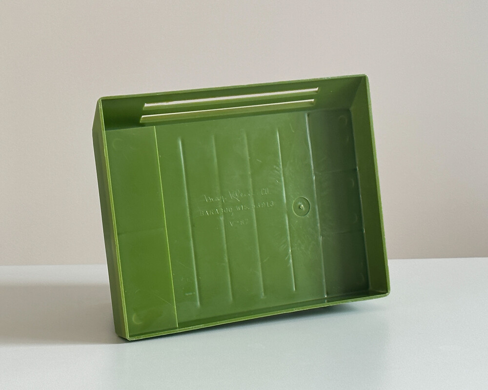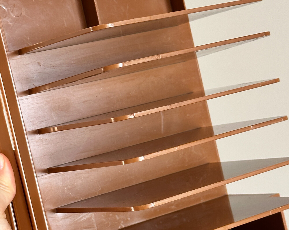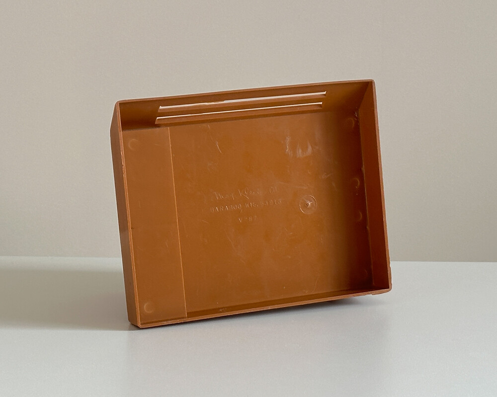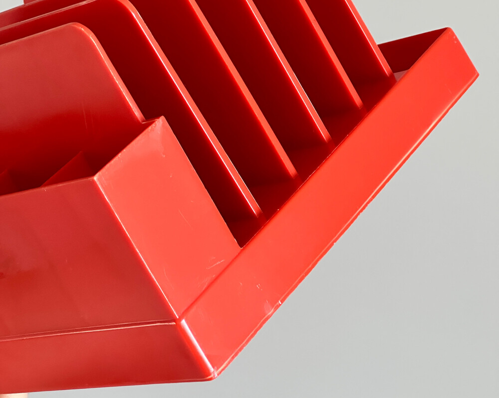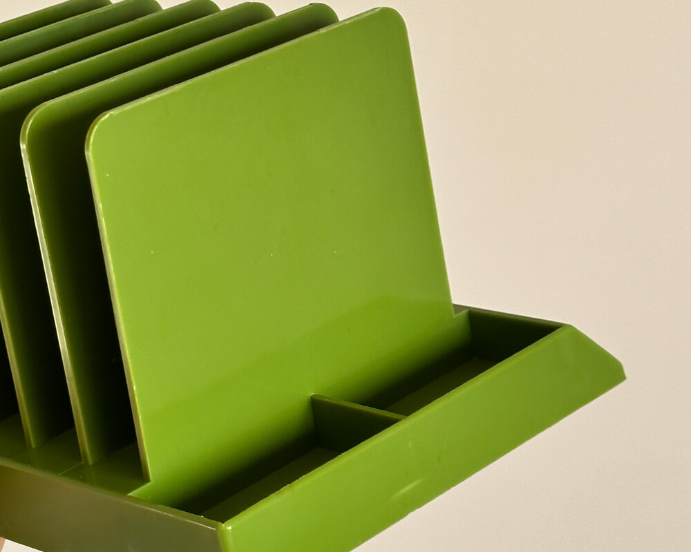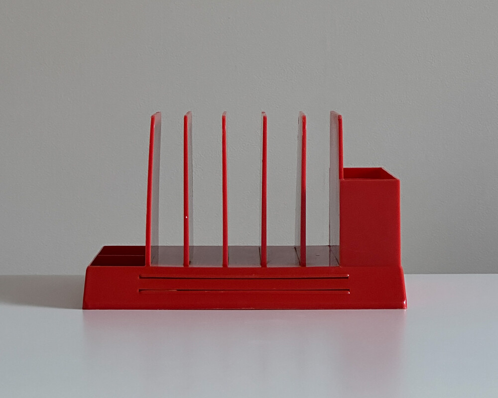 70년도 생산되었던 빈티지 데스크 오거나이저입니다. 필기구 꽃이, 엽서 보관함 등 공간의 용도에 따라 보관할 수 있는 다양한 수납공간으로 나누어져 있습니다. 오렌지, 그린, 브라운 3가지 색상으로 입고되었습니다.