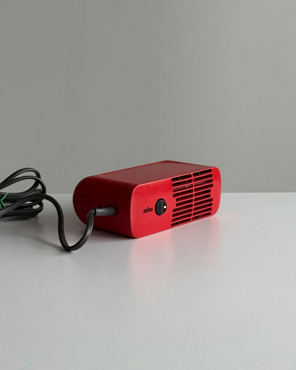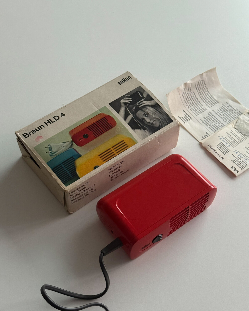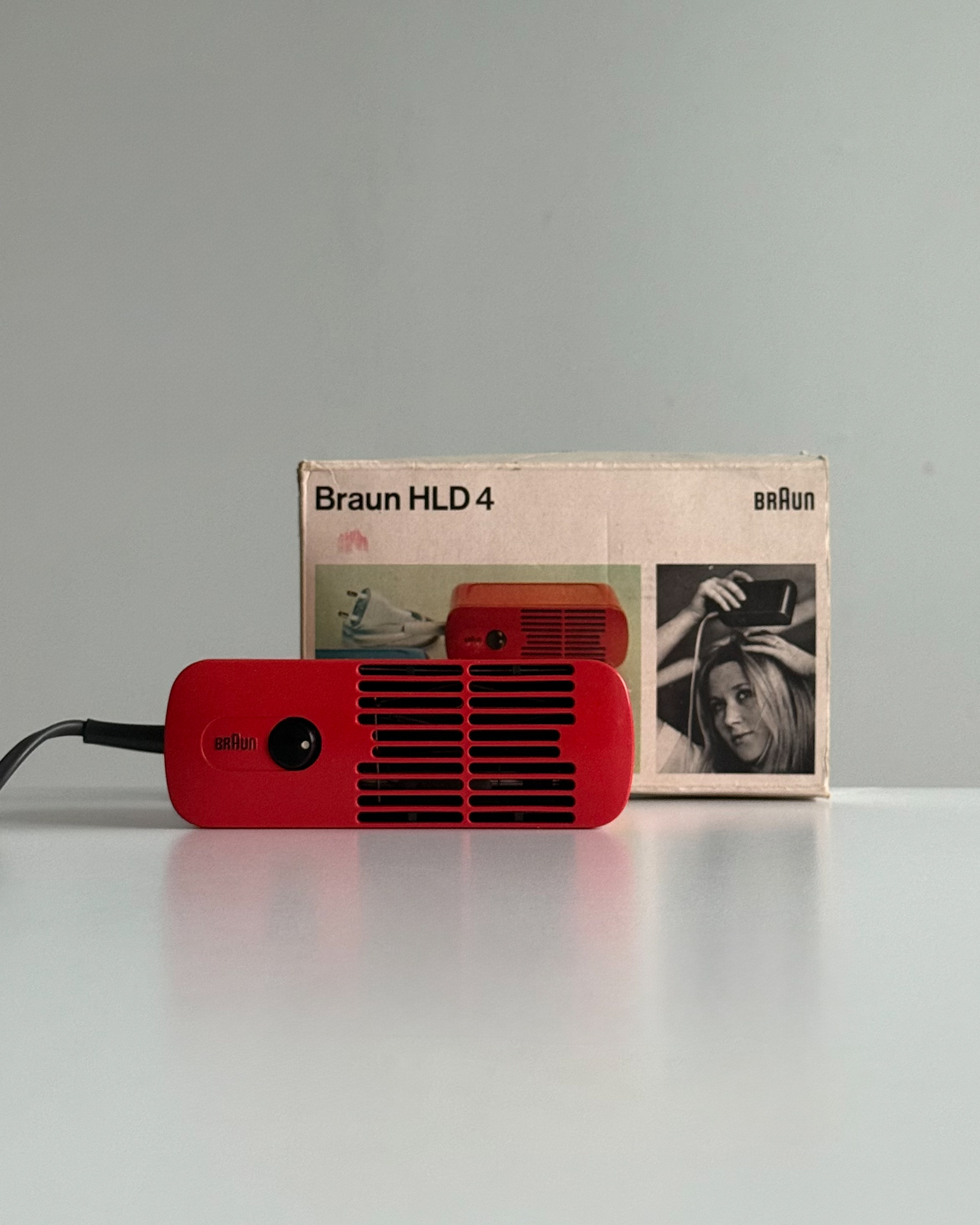 1970년대 생산되었던 BRAUN 사의 빈티지 헤어 드라이어입니다. 브라운은 1960년대부터 기존의 무겁고 투박했던 드라이어와 다른, 가볍고 실용적인 핸드헬드형 모델을 선보이며 새로운 기준을 제시했습니다. HLD 4는 1963년 Reinhold Weiss가 디자인한 HLD 2를 기반으로 람스가 재해석한 모델로, 불필요한 요소를 덜어내고 기능만을 남긴 그의 디자인 철학이 뚜렷하게 반영되어 있습니다. 전면에는 하나의 전원 스위치만 두어 누구나 직관적으로 사용할 수 있도록 설계되었으며, 단순하지만 완성도 높은 조형이 특징입니다. 레드, 블루, 옐로우의 세 가지 컬러로 출시되었으며, 지금까지도 브라운 컬렉터들 사이에서 높은 선호도를 가진 아이코닉한 모델 중 하나입니다.