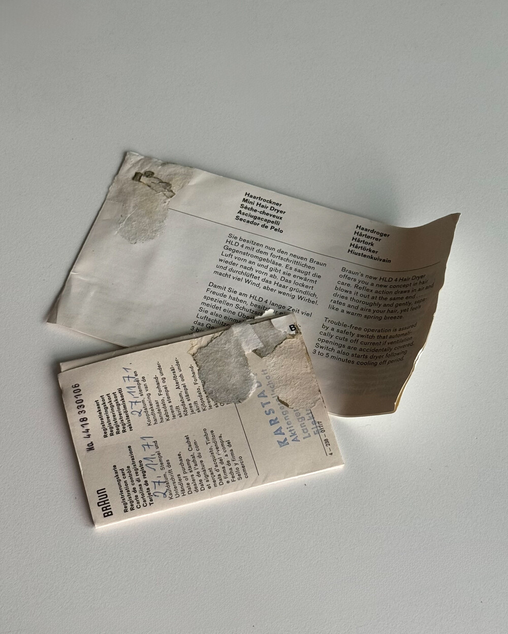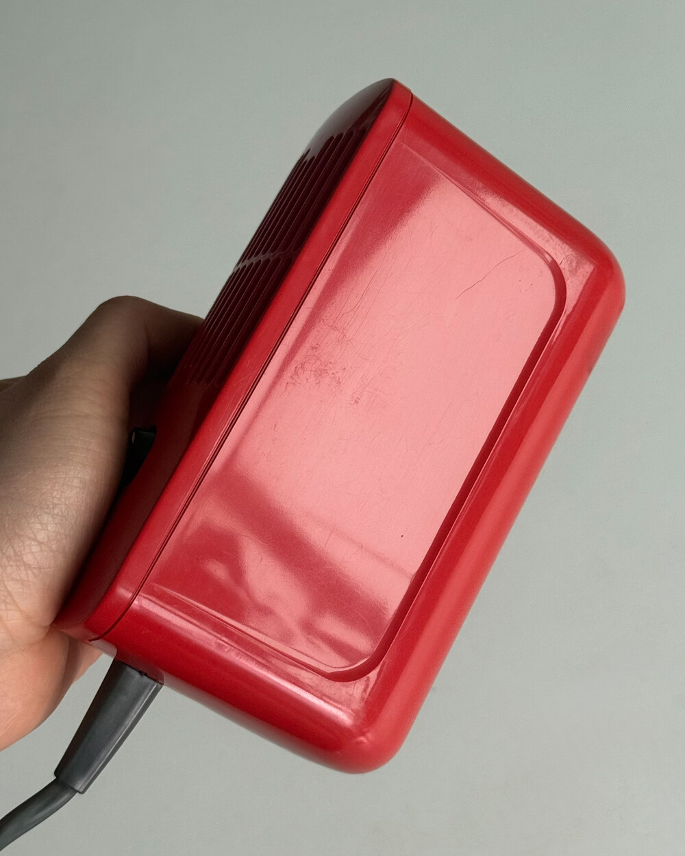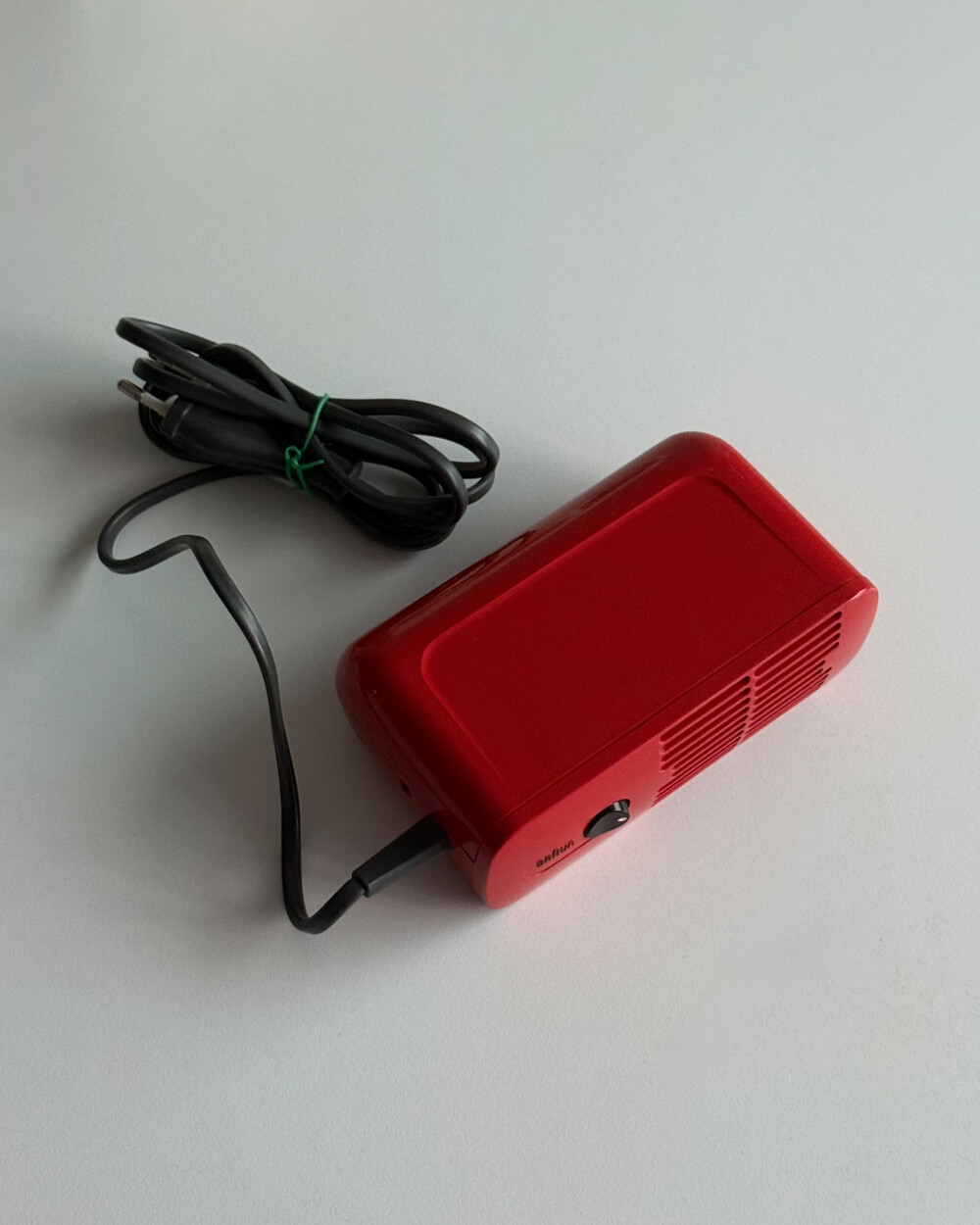 1970년대 생산되었던 BRAUN 사의 빈티지 헤어 드라이어입니다. 브라운은 1960년대부터 기존의 무겁고 투박했던 드라이어와 다른, 가볍고 실용적인 핸드헬드형 모델을 선보이며 새로운 기준을 제시했습니다. HLD 4는 1963년 Reinhold Weiss가 디자인한 HLD 2를 기반으로 람스가 재해석한 모델로, 불필요한 요소를 덜어내고 기능만을 남긴 그의 디자인 철학이 뚜렷하게 반영되어 있습니다. 전면에는 하나의 전원 스위치만 두어 누구나 직관적으로 사용할 수 있도록 설계되었으며, 단순하지만 완성도 높은 조형이 특징입니다. 레드, 블루, 옐로우의 세 가지 컬러로 출시되었으며, 지금까지도 브라운 컬렉터들 사이에서 높은 선호도를 가진 아이코닉한 모델 중 하나입니다.