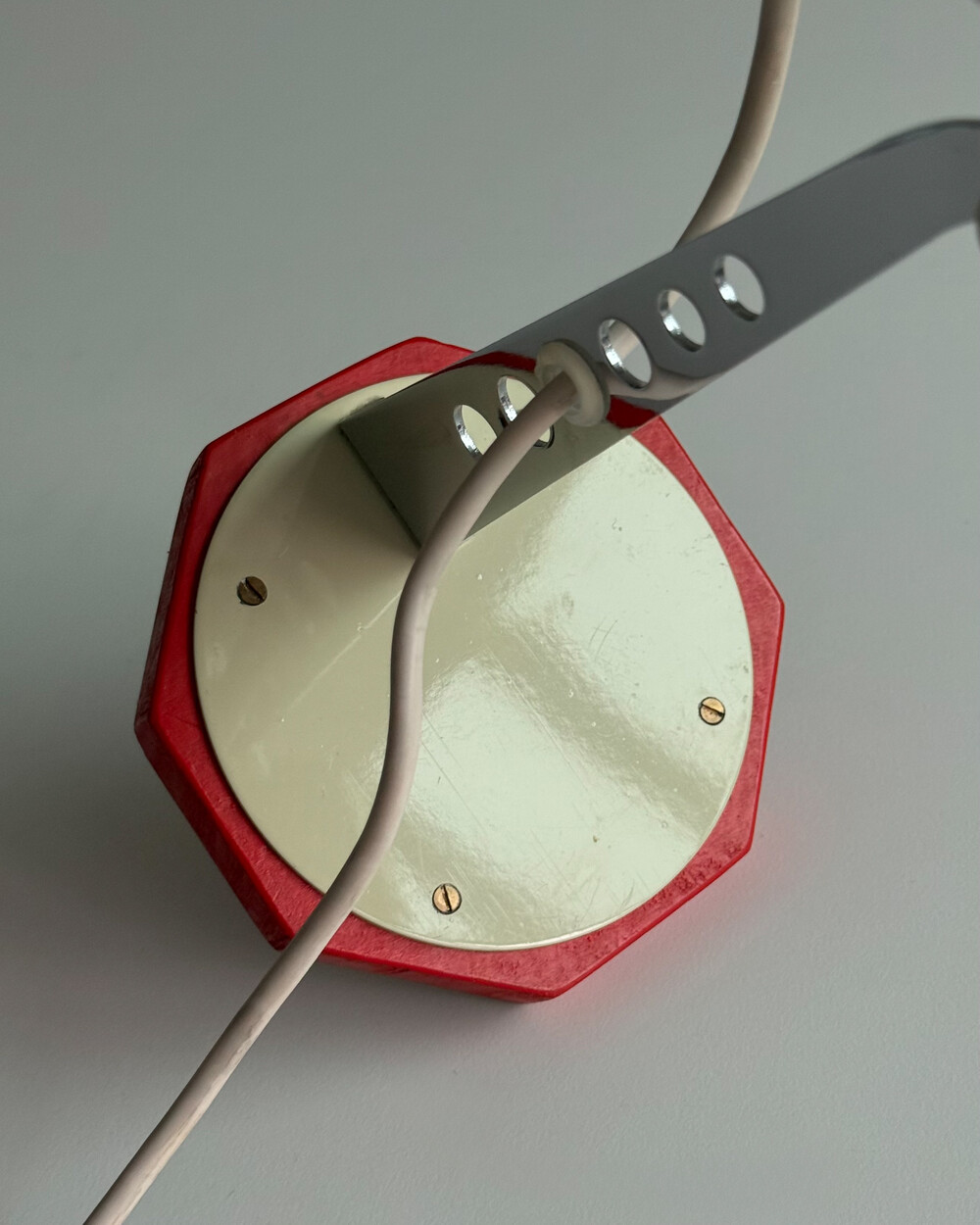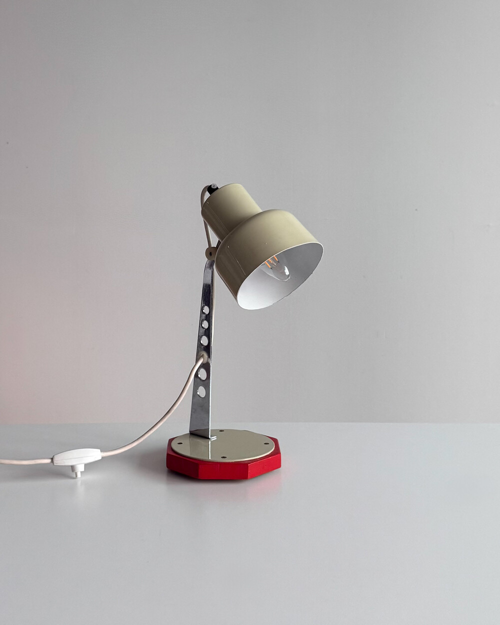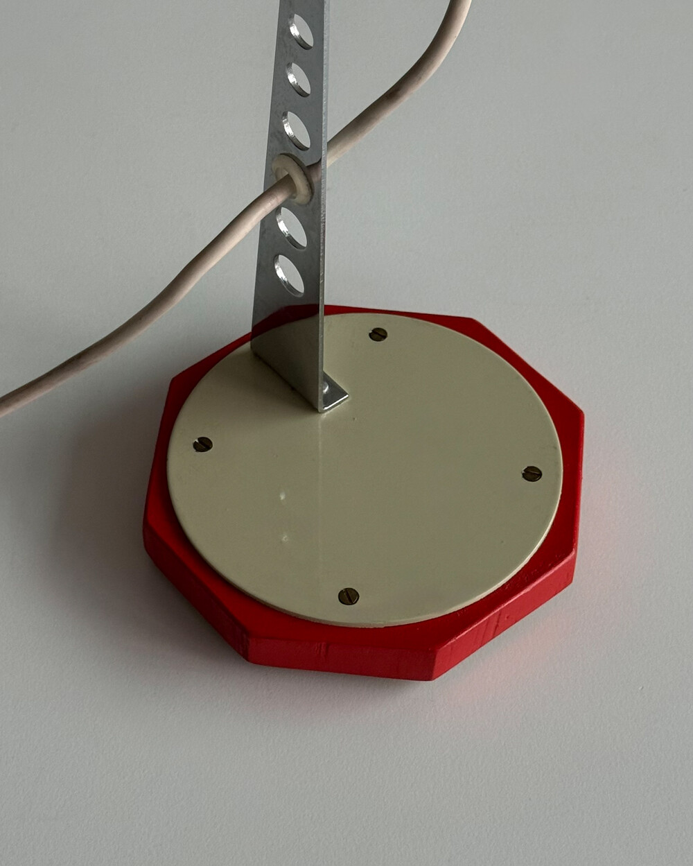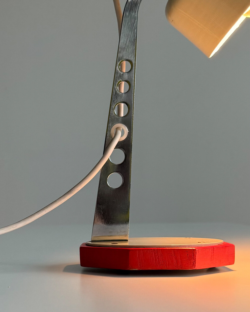1970년대 라트비아(구 소련) VEF 에서 제작된 빈티지 데스크 램프입니다. 베이지 톤의 메탈 셰이드와 팔각형 레드 베이스가 조화를 이루며, 펀칭된 브라켓을 따라 드러나는 전선 구조가 특징적입니다. 차분한 베이지와 강렬한 레드의 대비는 USSR 디자인 특유의 실용성과 실험적 감각을 잘 보여줍니다. 데스크 위에서 포인트가 되는 매력적인 디자인입니다.