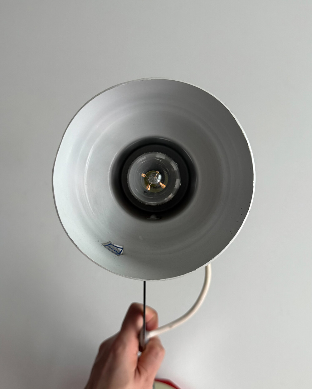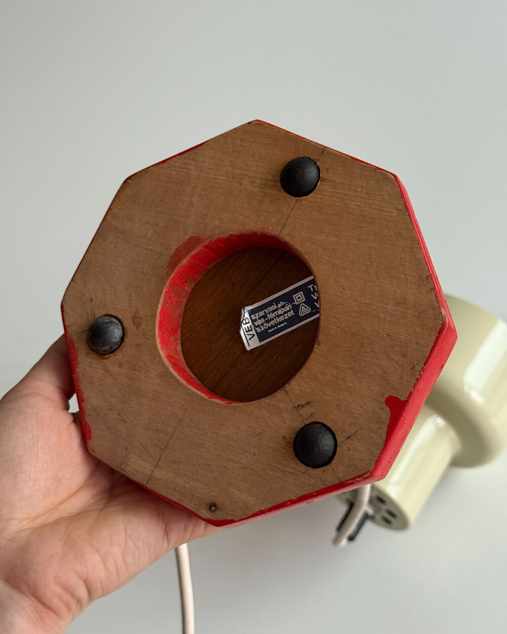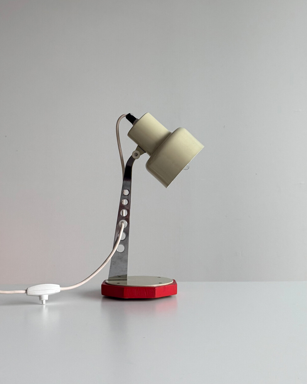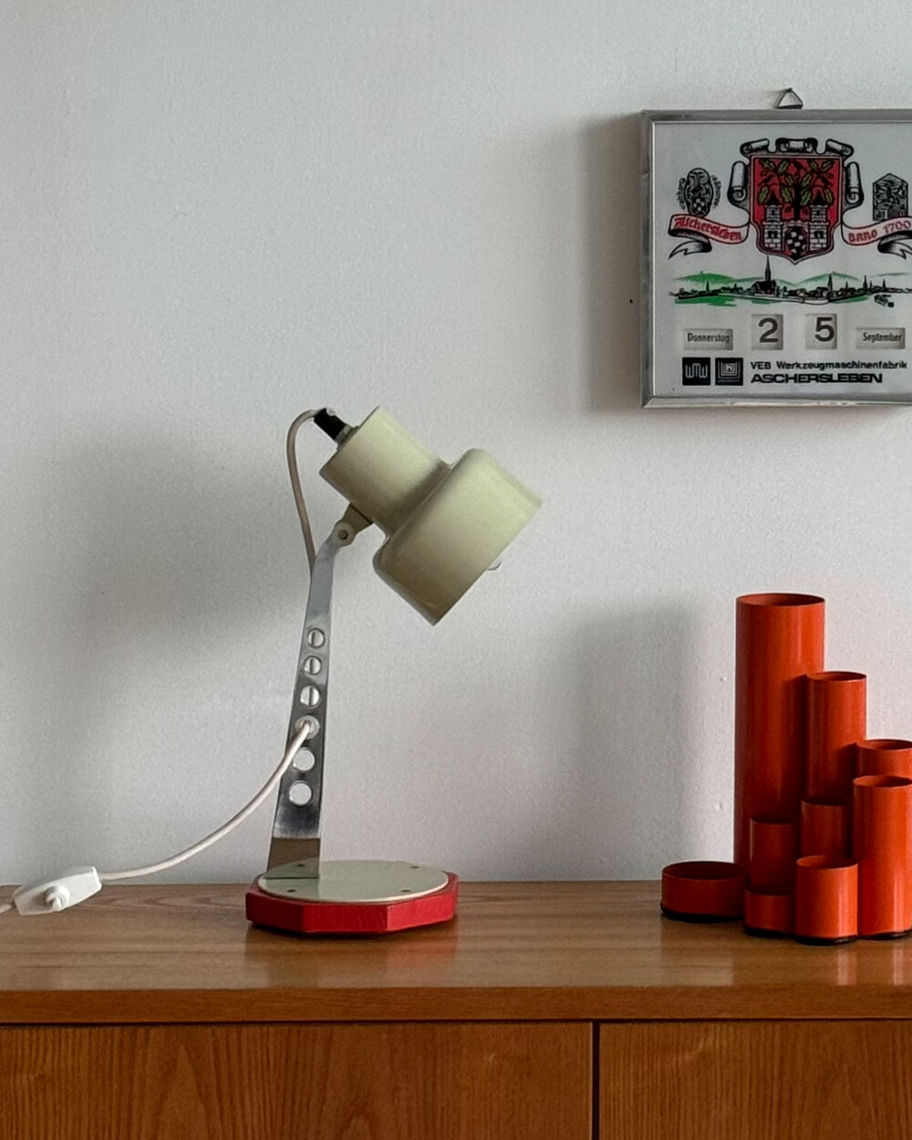 1970년대 라트비아(구 소련) VEF 에서 제작된 빈티지 데스크 램프입니다. 베이지 톤의 메탈 셰이드와 팔각형 레드 베이스가 조화를 이루며, 펀칭된 브라켓을 따라 드러나는 전선 구조가 특징적입니다. 차분한 베이지와 강렬한 레드의 대비는 USSR 디자인 특유의 실용성과 실험적 감각을 잘 보여줍니다. 데스크 위에서 포인트가 되는 매력적인 디자인입니다.