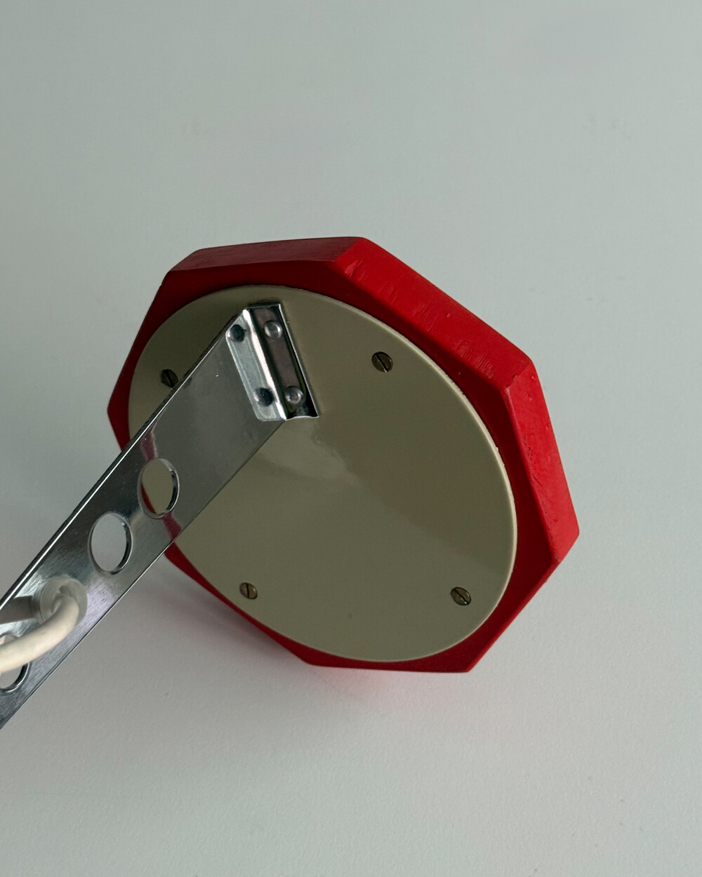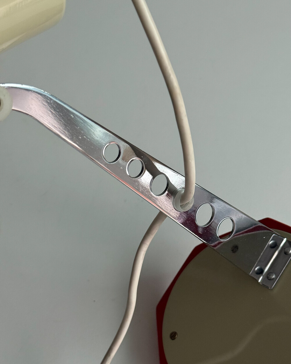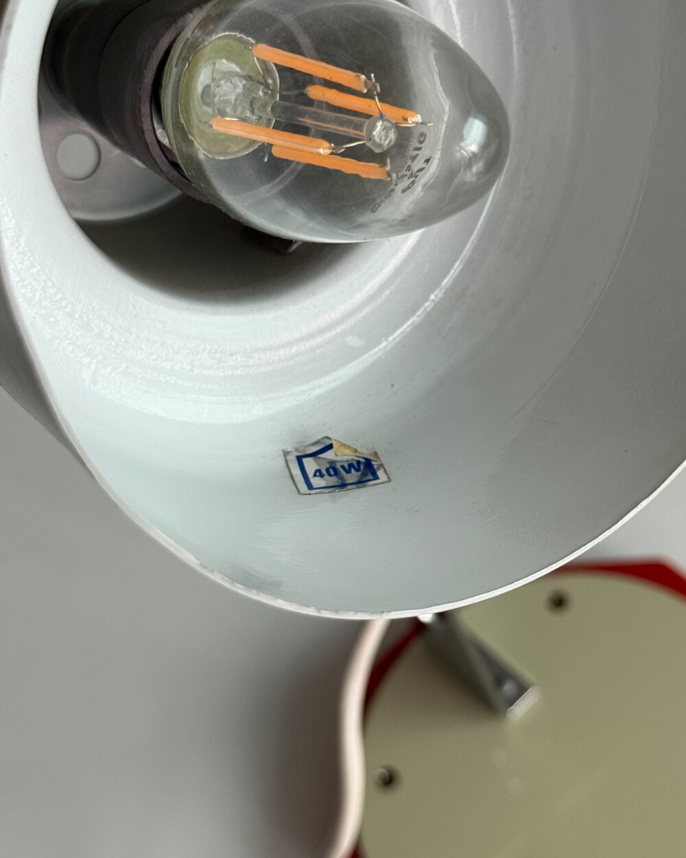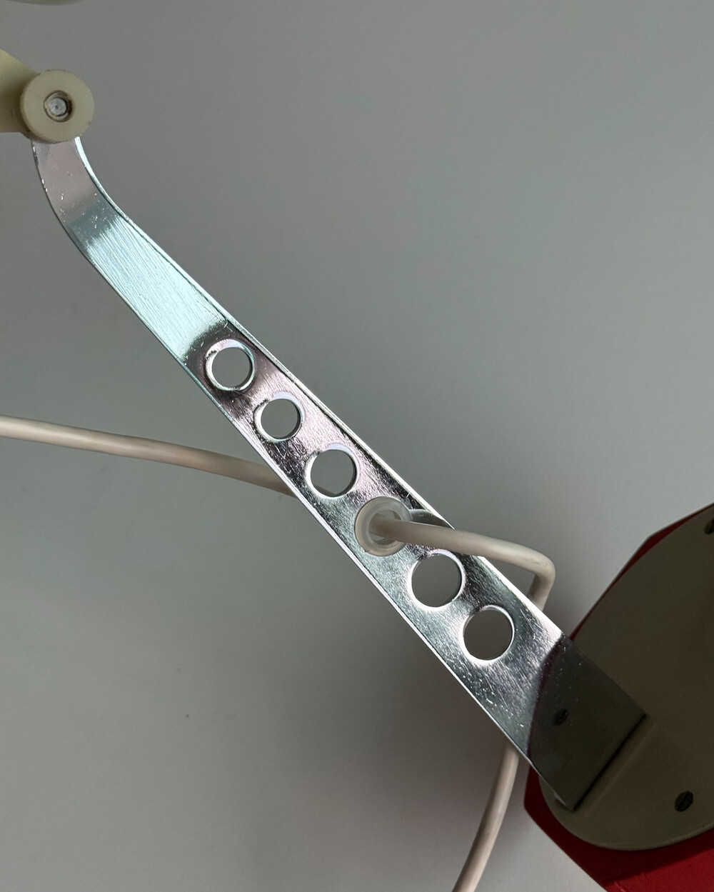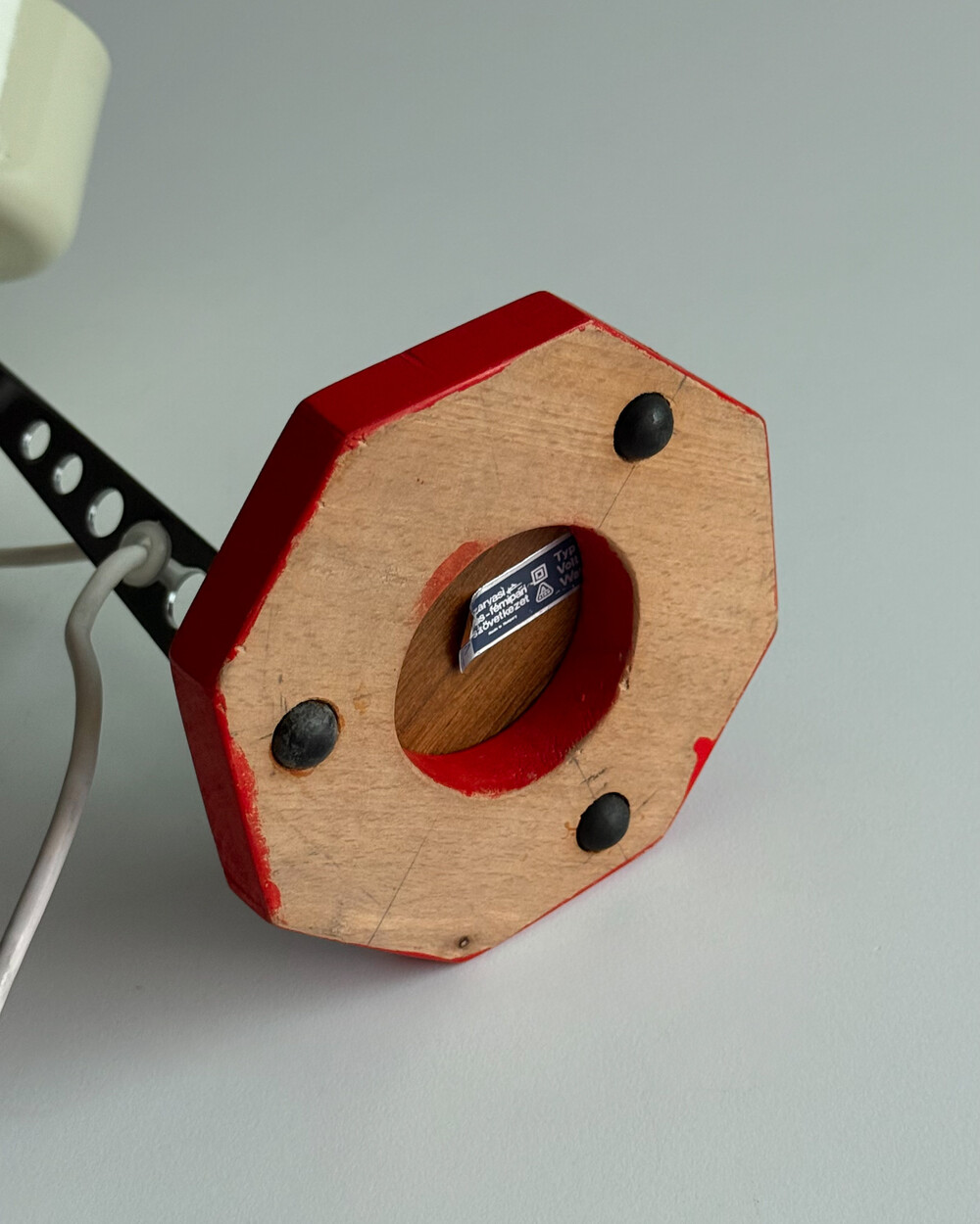 1970년대 라트비아(구 소련) VEF 에서 제작된 빈티지 데스크 램프입니다. 베이지 톤의 메탈 셰이드와 팔각형 레드 베이스가 조화를 이루며, 펀칭된 브라켓을 따라 드러나는 전선 구조가 특징적입니다. 차분한 베이지와 강렬한 레드의 대비는 USSR 디자인 특유의 실용성과 실험적 감각을 잘 보여줍니다. 데스크 위에서 포인트가 되는 매력적인 디자인입니다.