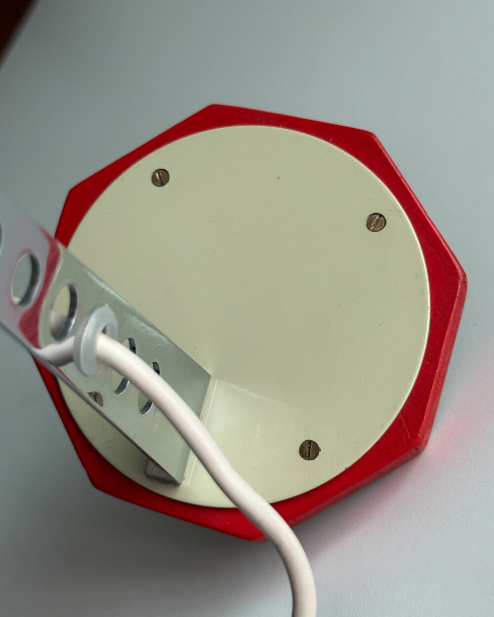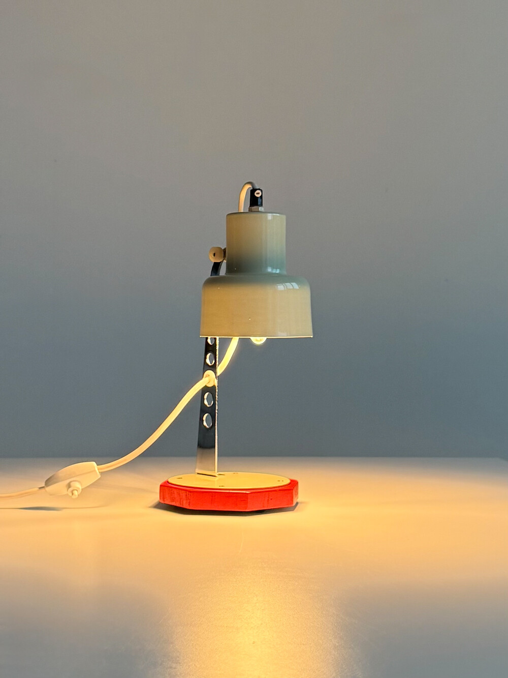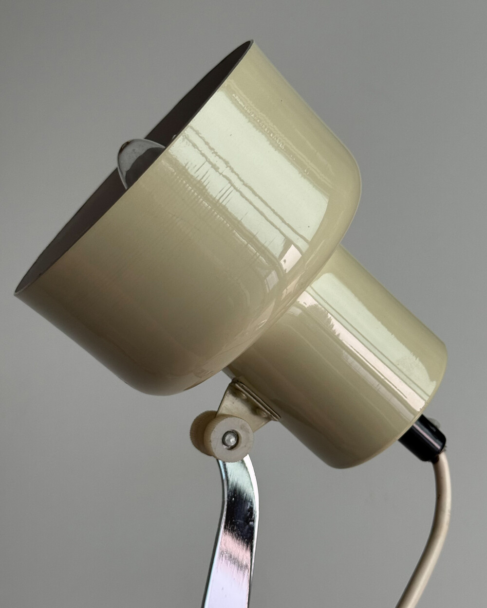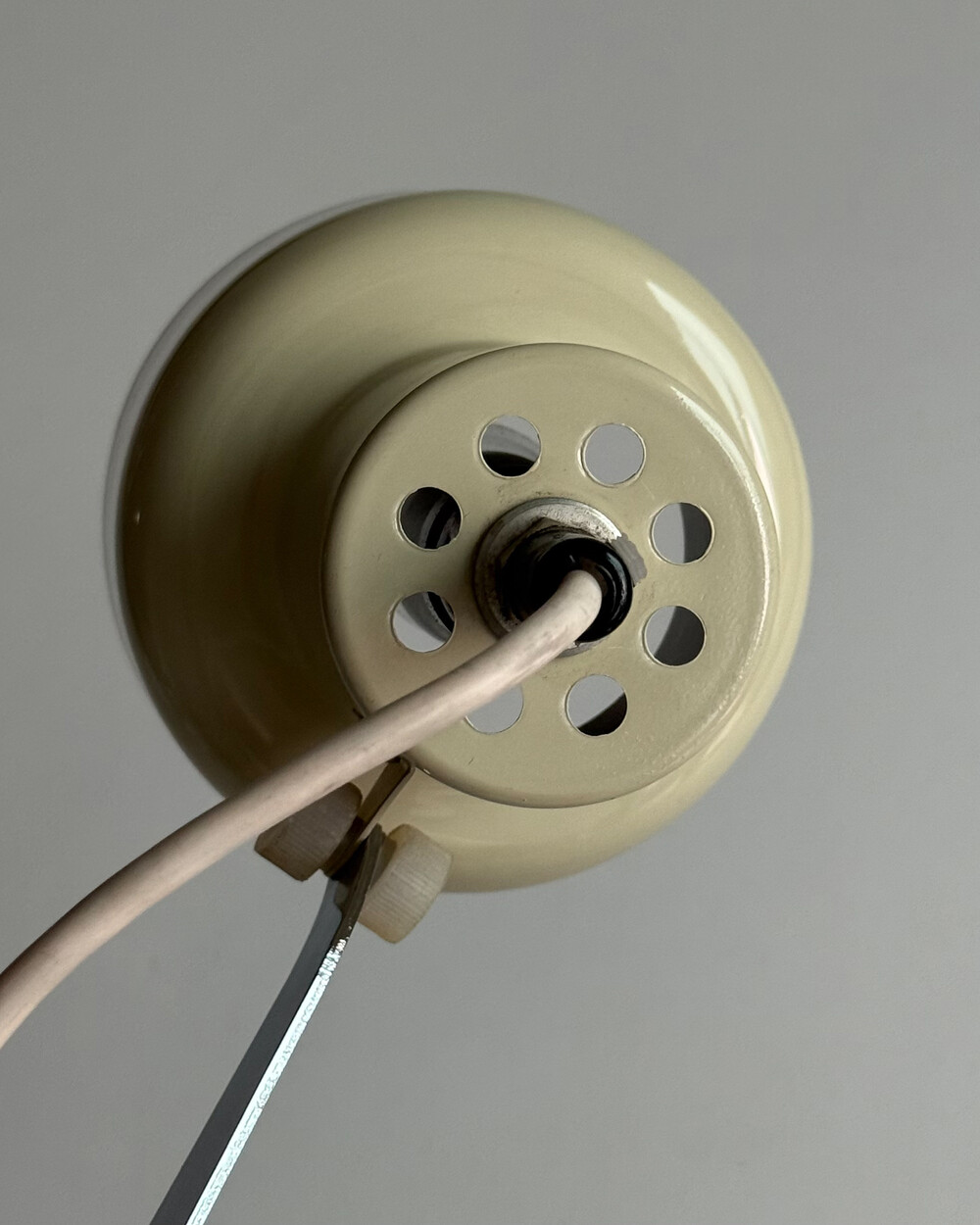 1970년대 라트비아(구 소련) VEF 에서 제작된 빈티지 데스크 램프입니다. 베이지 톤의 메탈 셰이드와 팔각형 레드 베이스가 조화를 이루며, 펀칭된 브라켓을 따라 드러나는 전선 구조가 특징적입니다. 차분한 베이지와 강렬한 레드의 대비는 USSR 디자인 특유의 실용성과 실험적 감각을 잘 보여줍니다. 데스크 위에서 포인트가 되는 매력적인 디자인입니다.