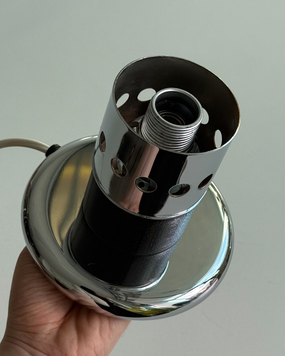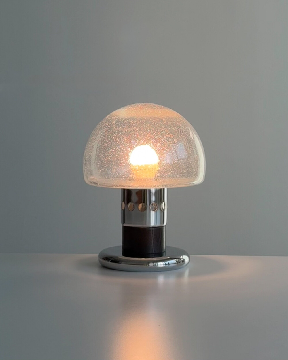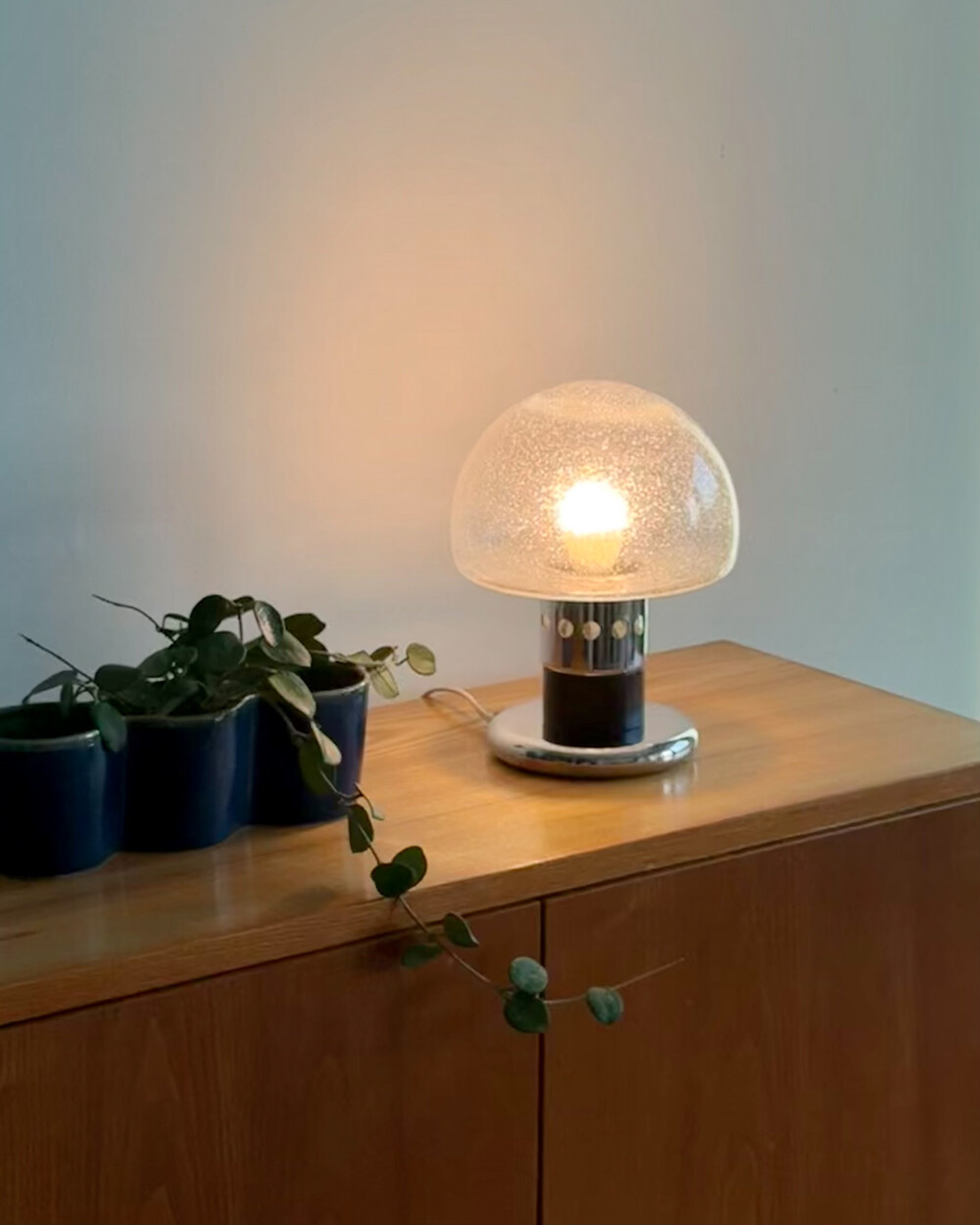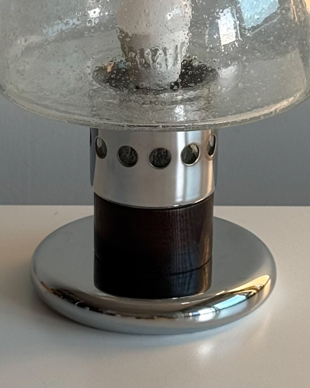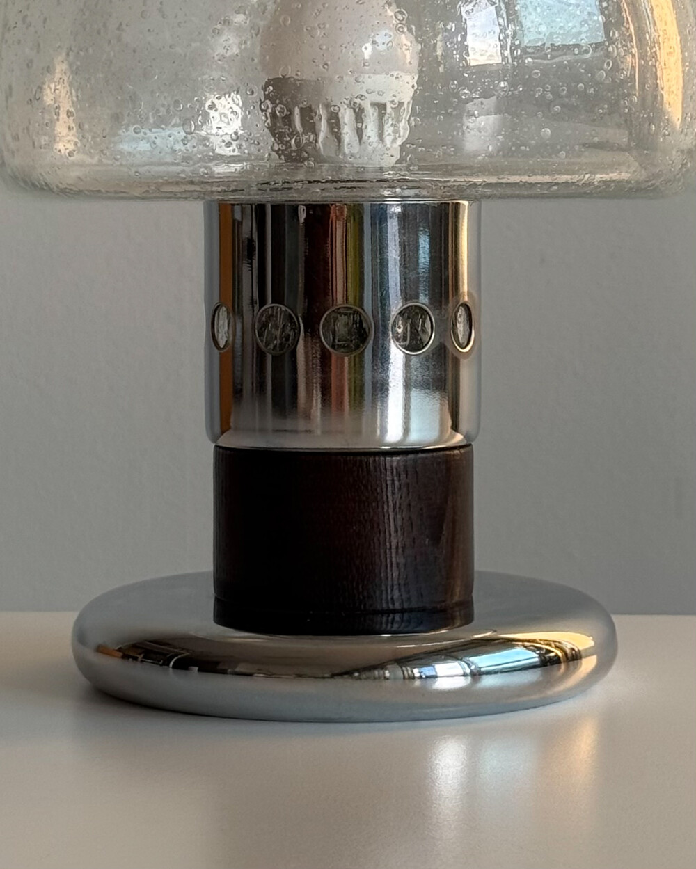 70년도 독일 BAUM-LEUCHTEN에서 생산되었던 빈티지 테이블 램프입니다. 크롬과 우드가 결합된 베이스 위로 입체감이 느껴지는 머쉬룸 쉐이드의 글라스가 결합되어 있습니다. 유니크한 디자인으로 공간에서 포인트가 되어주며, 점등 시 부드럽고 은은한 분위기를 연출해줍니다.