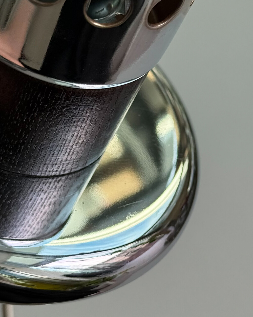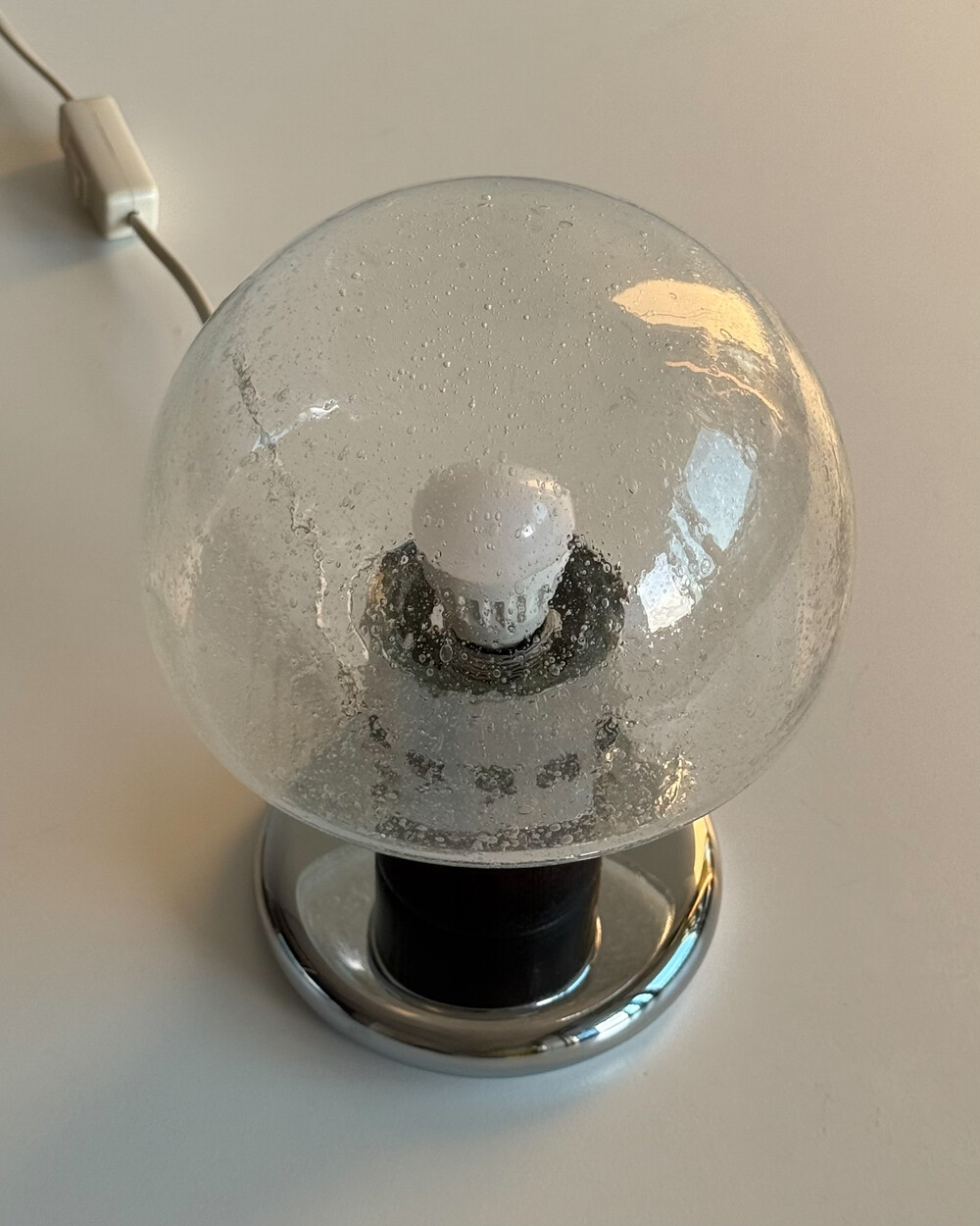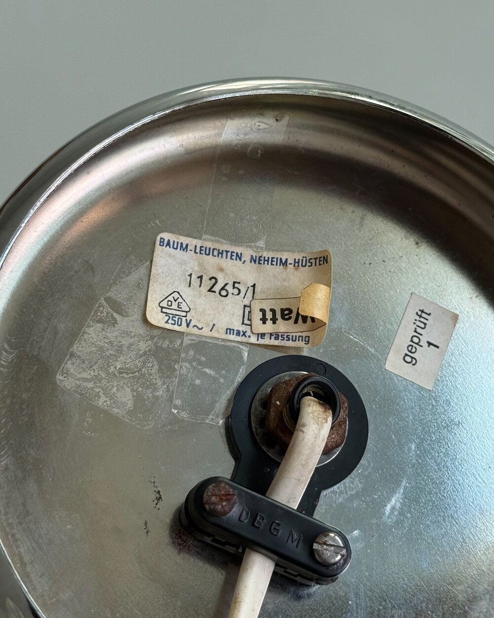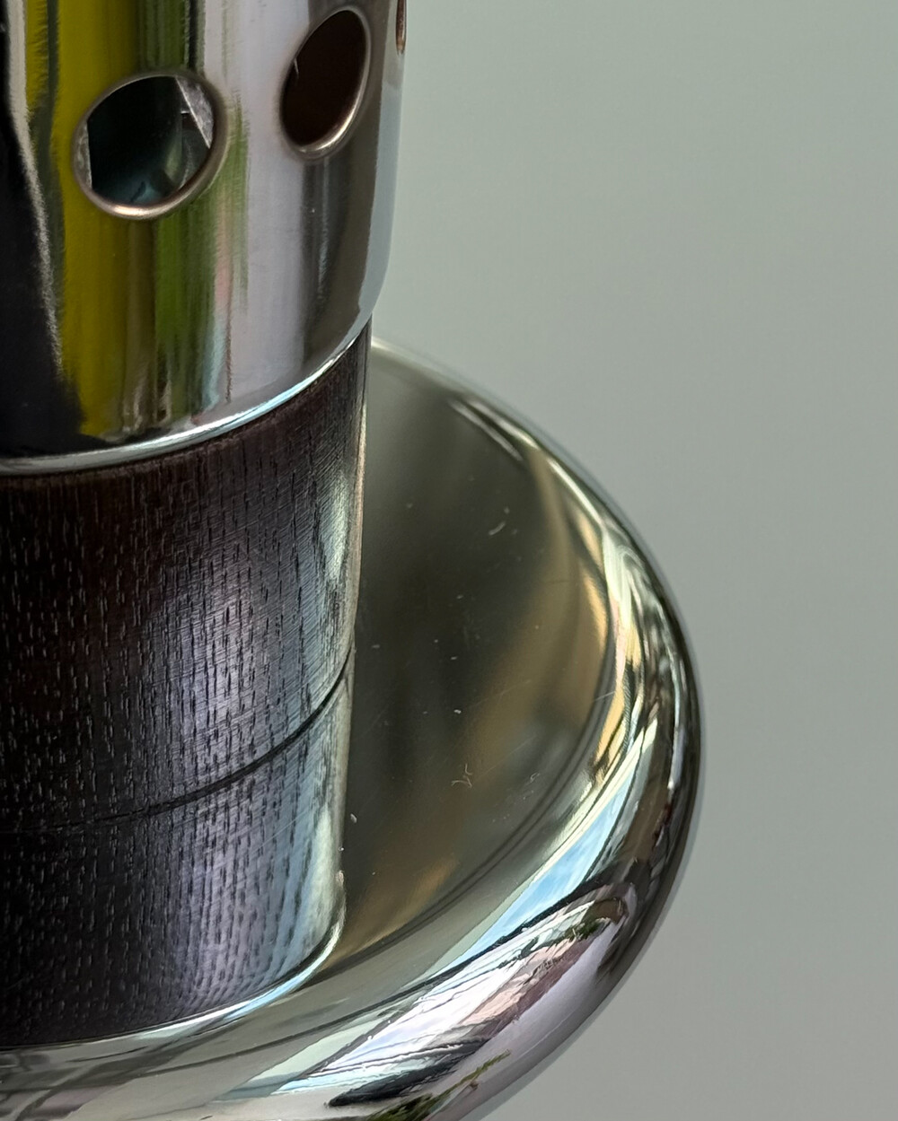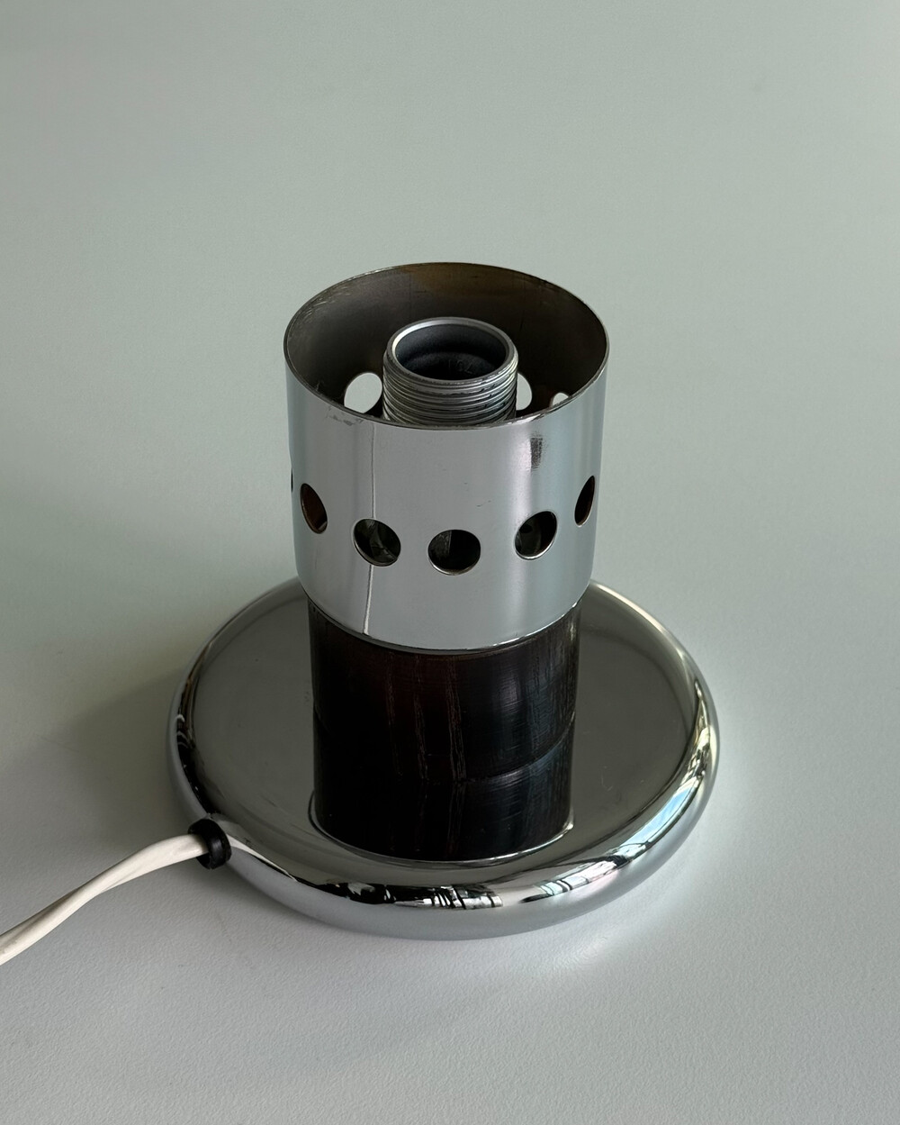 70년도 독일 BAUM-LEUCHTEN에서 생산되었던 빈티지 테이블 램프입니다. 크롬과 우드가 결합된 베이스 위로 입체감이 느껴지는 머쉬룸 쉐이드의 글라스가 결합되어 있습니다. 유니크한 디자인으로 공간에서 포인트가 되어주며, 점등 시 부드럽고 은은한 분위기를 연출해줍니다.