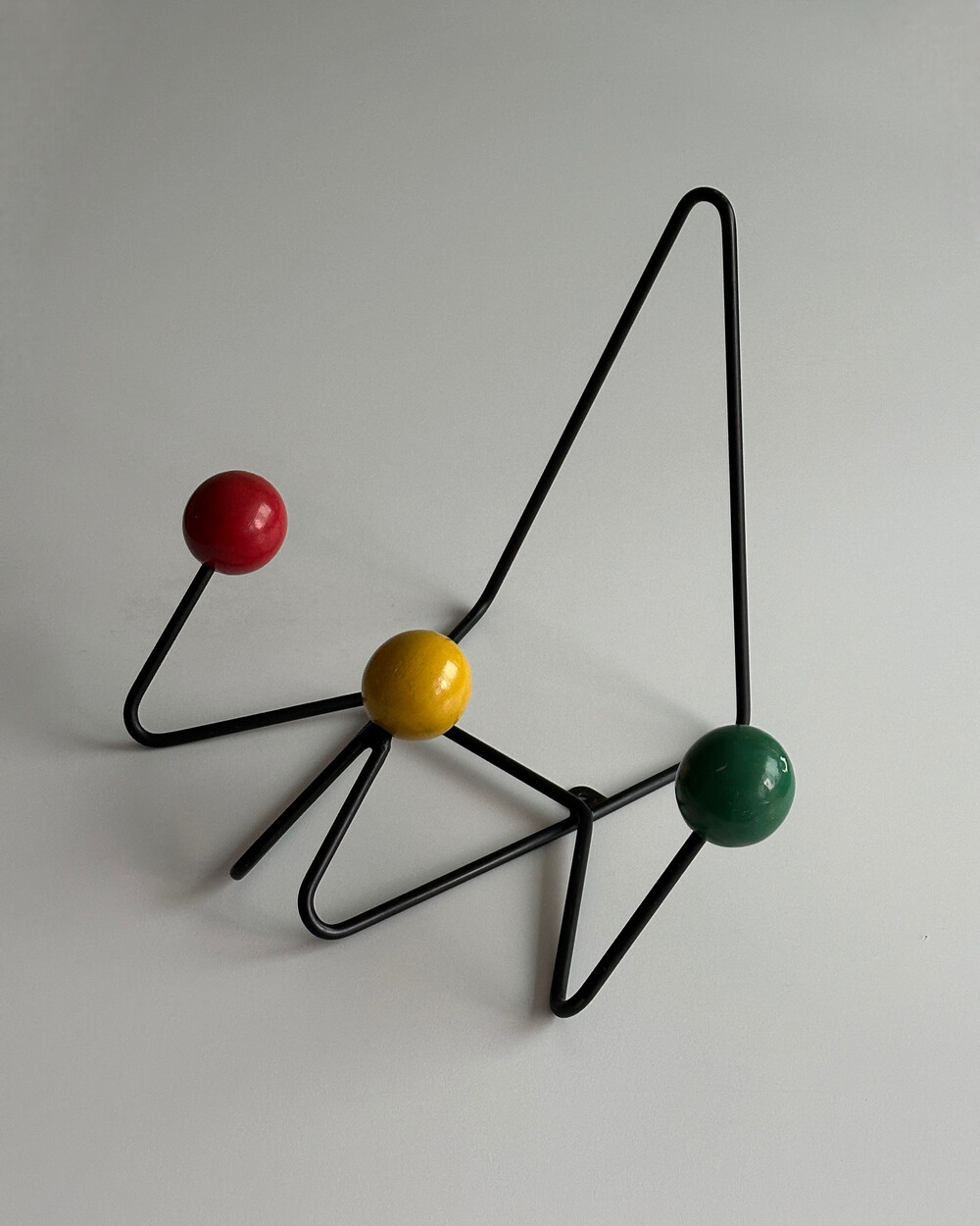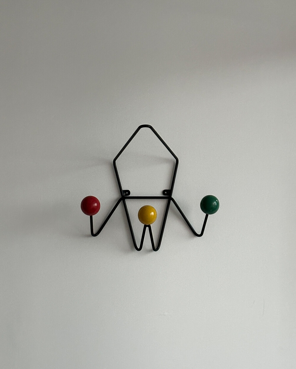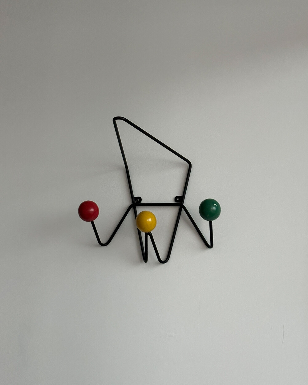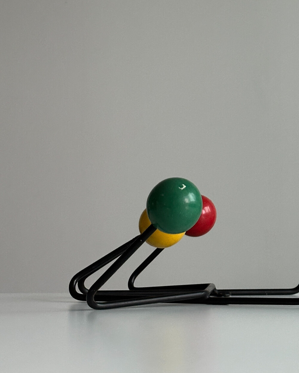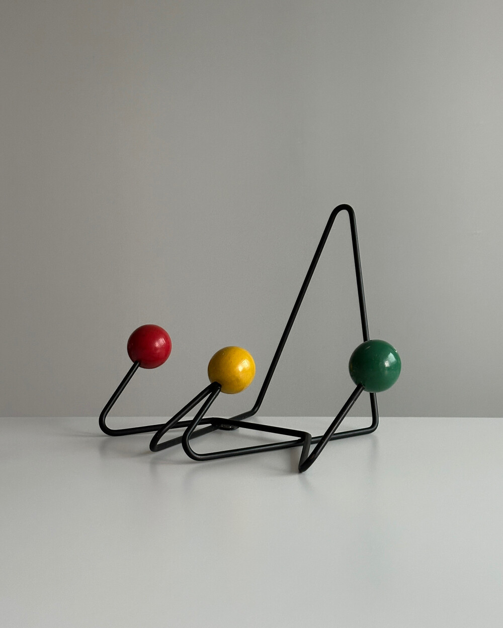 1960년도 덴마크에서 제작된 빈티지 컬러 볼 헹거입니다. 블랙 철제 프레임 위로 모자나 가벼운 소품을 걸 수 있는 상단 걸이 1개와 3개의 빨강, 노랑, 초록의 우드볼 3개로 이루어져 있습니다. 단순한 수납을 넘어 공간에 조형적 리듬을 더하는 구조적 오브제로, 당시 시대의 감성과 실용성을 동시에 담아낸 아이템입니다.