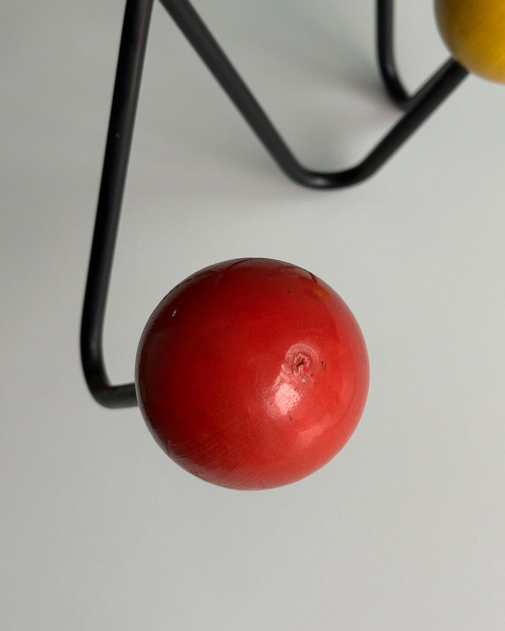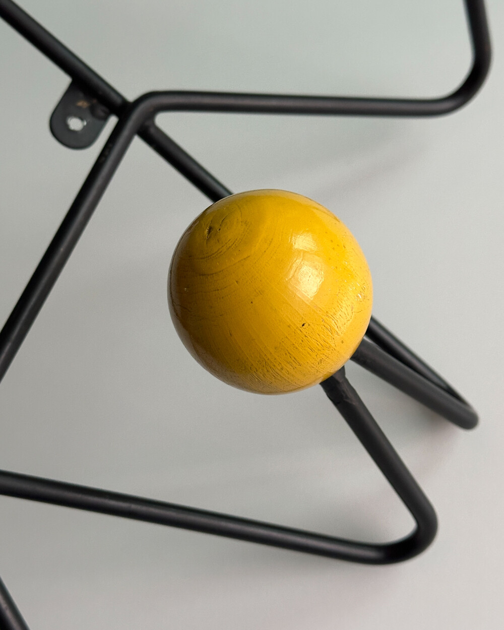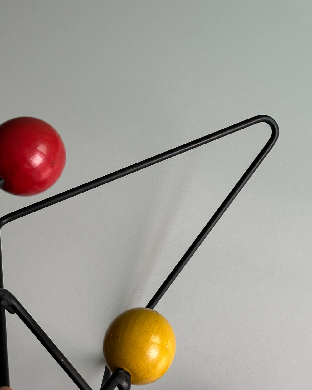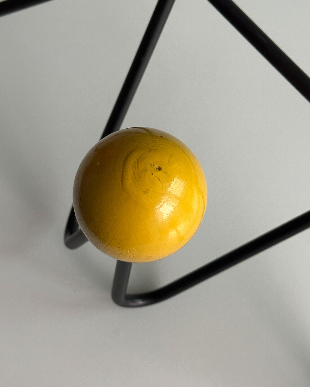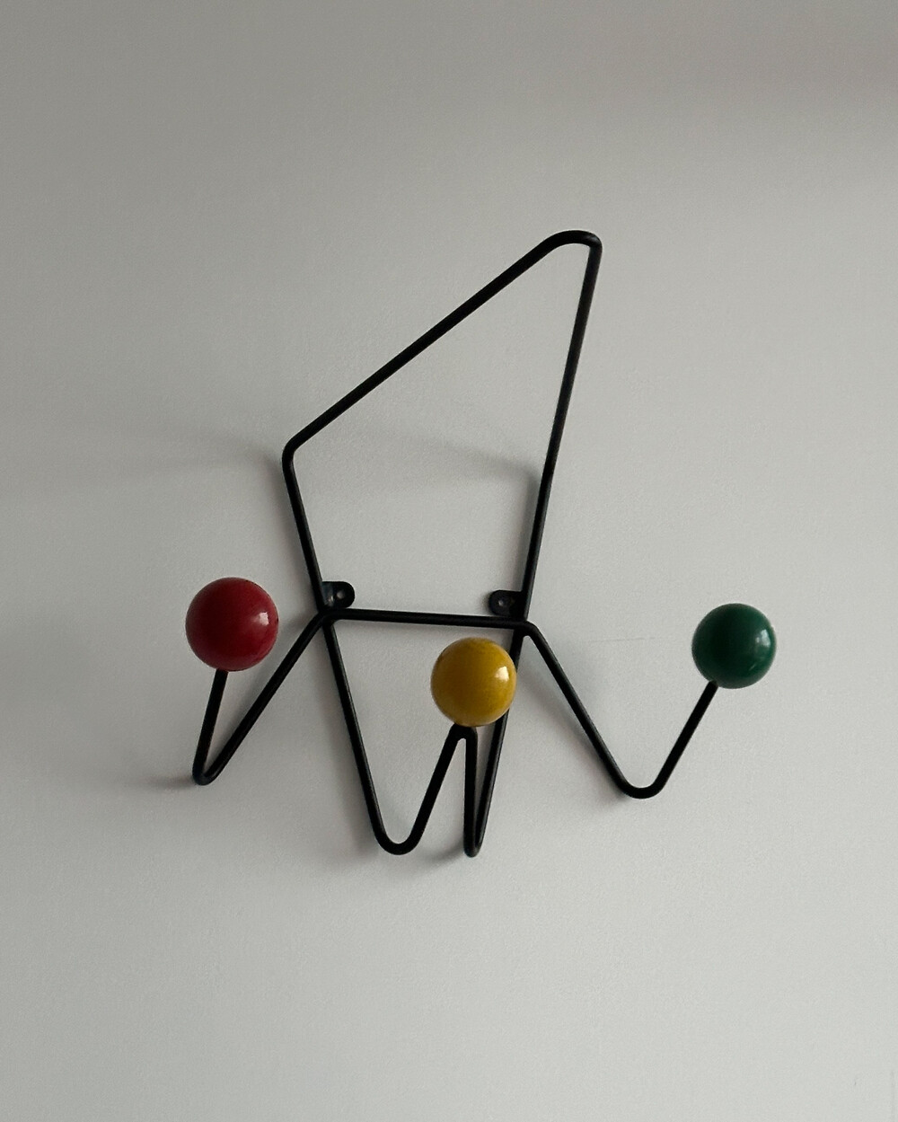 1960년도 덴마크에서 제작된 빈티지 컬러 볼 헹거입니다. 블랙 철제 프레임 위로 모자나 가벼운 소품을 걸 수 있는 상단 걸이 1개와 3개의 빨강, 노랑, 초록의 우드볼 3개로 이루어져 있습니다. 단순한 수납을 넘어 공간에 조형적 리듬을 더하는 구조적 오브제로, 당시 시대의 감성과 실용성을 동시에 담아낸 아이템입니다.