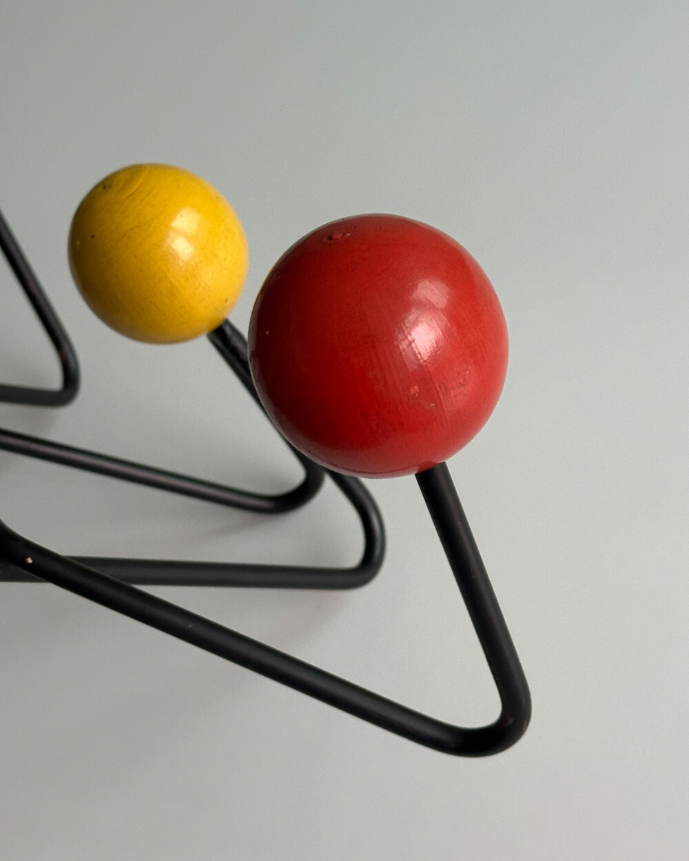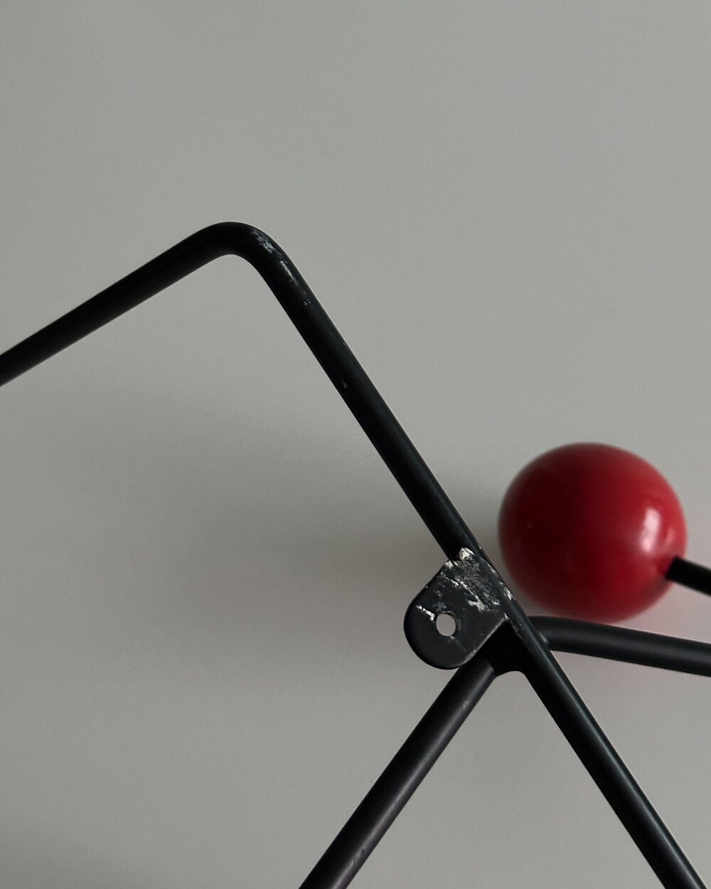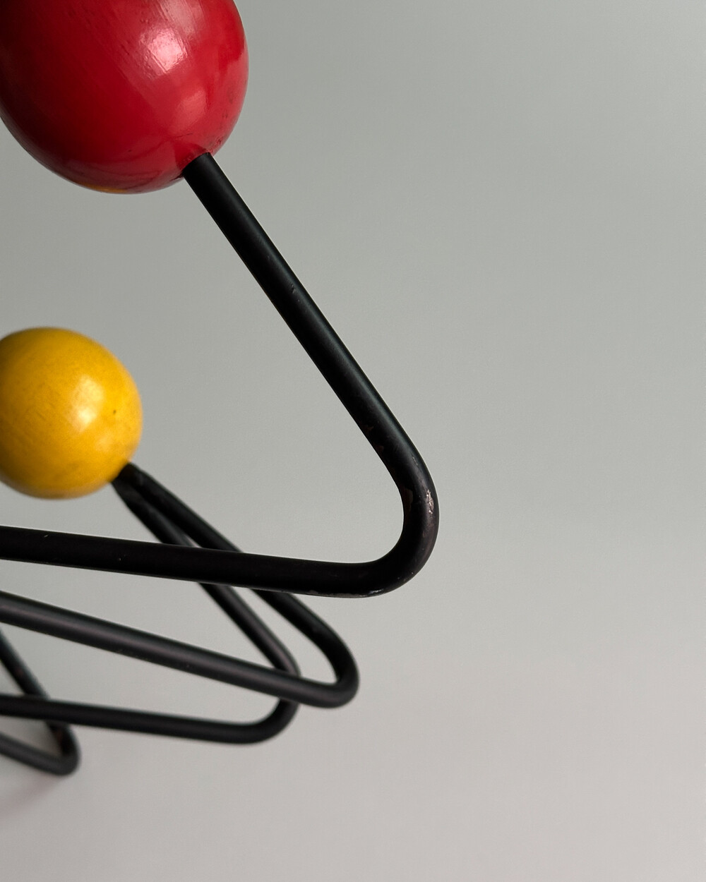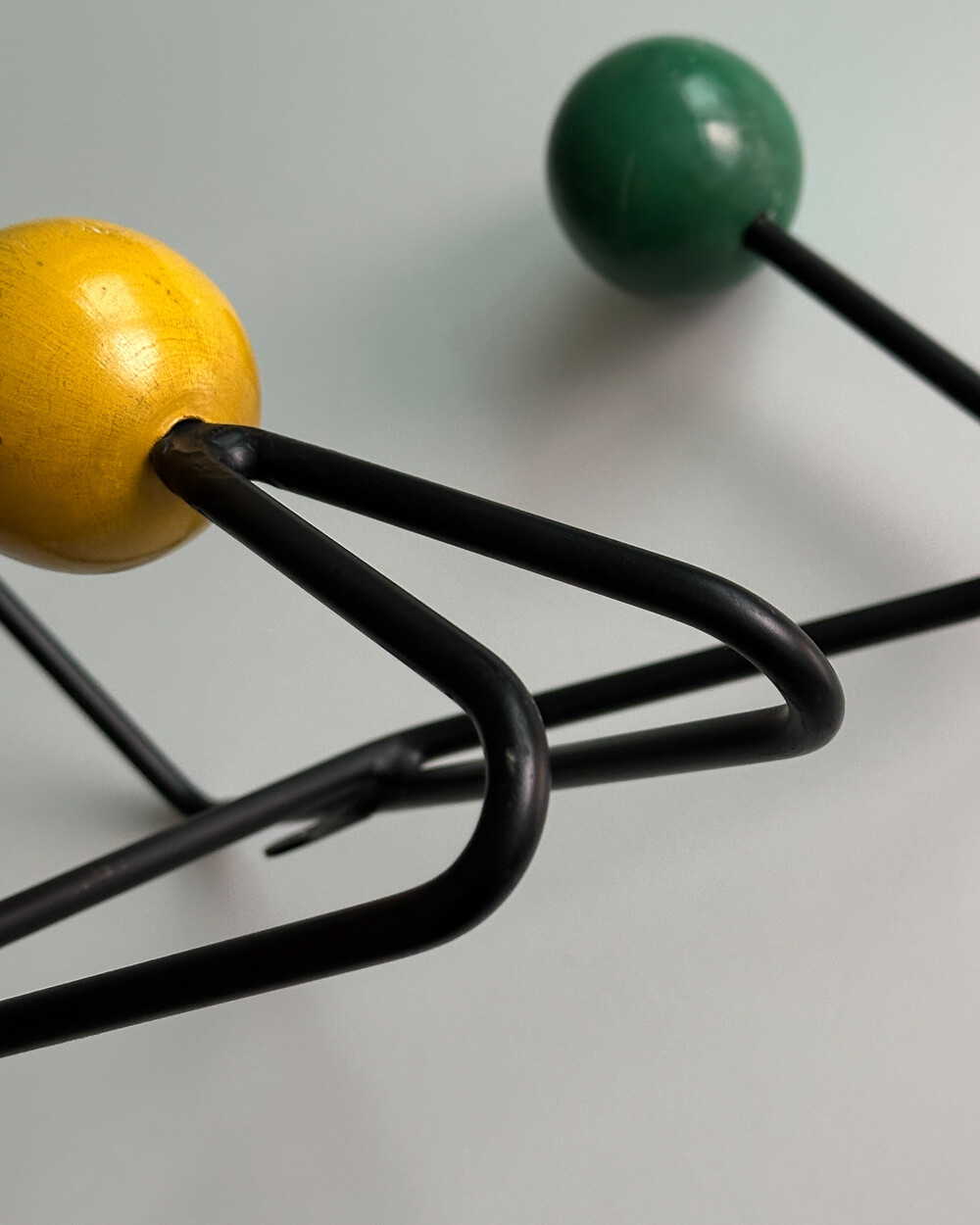 1960년도 덴마크에서 제작된 빈티지 컬러 볼 헹거입니다. 블랙 철제 프레임 위로 모자나 가벼운 소품을 걸 수 있는 상단 걸이 1개와 3개의 빨강, 노랑, 초록의 우드볼 3개로 이루어져 있습니다. 단순한 수납을 넘어 공간에 조형적 리듬을 더하는 구조적 오브제로, 당시 시대의 감성과 실용성을 동시에 담아낸 아이템입니다.