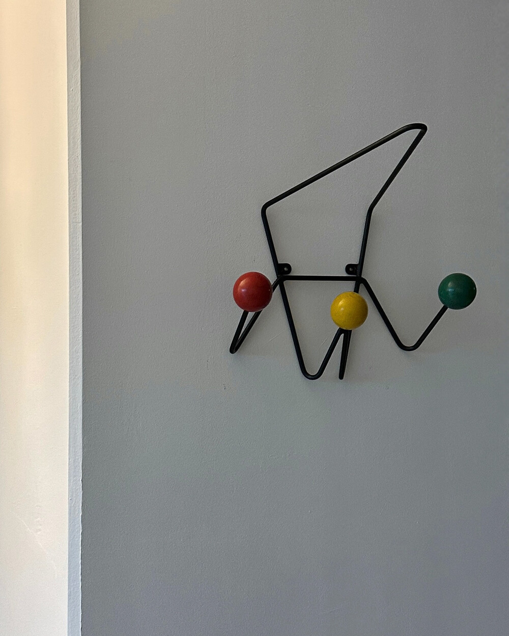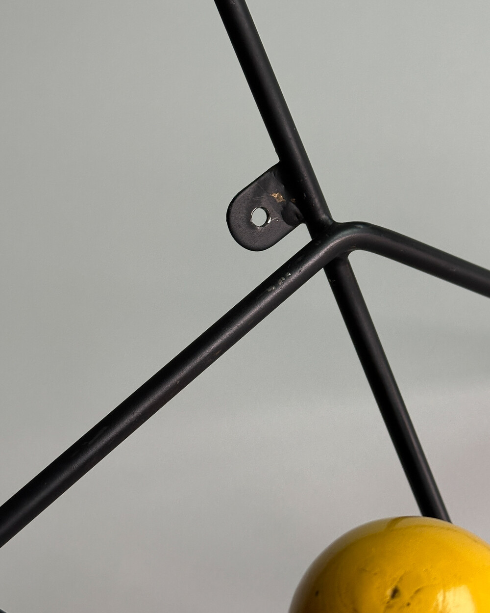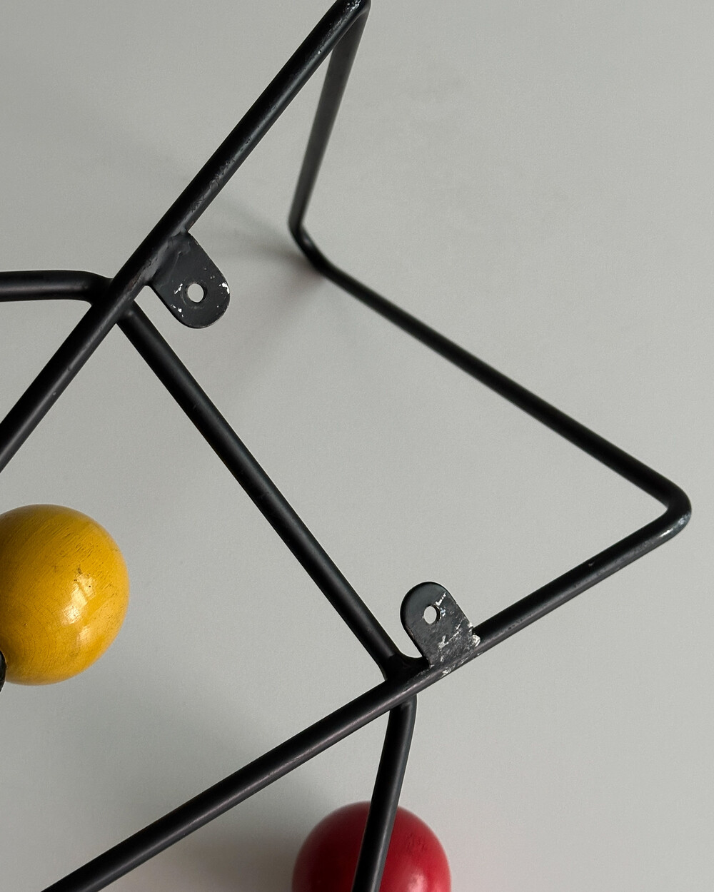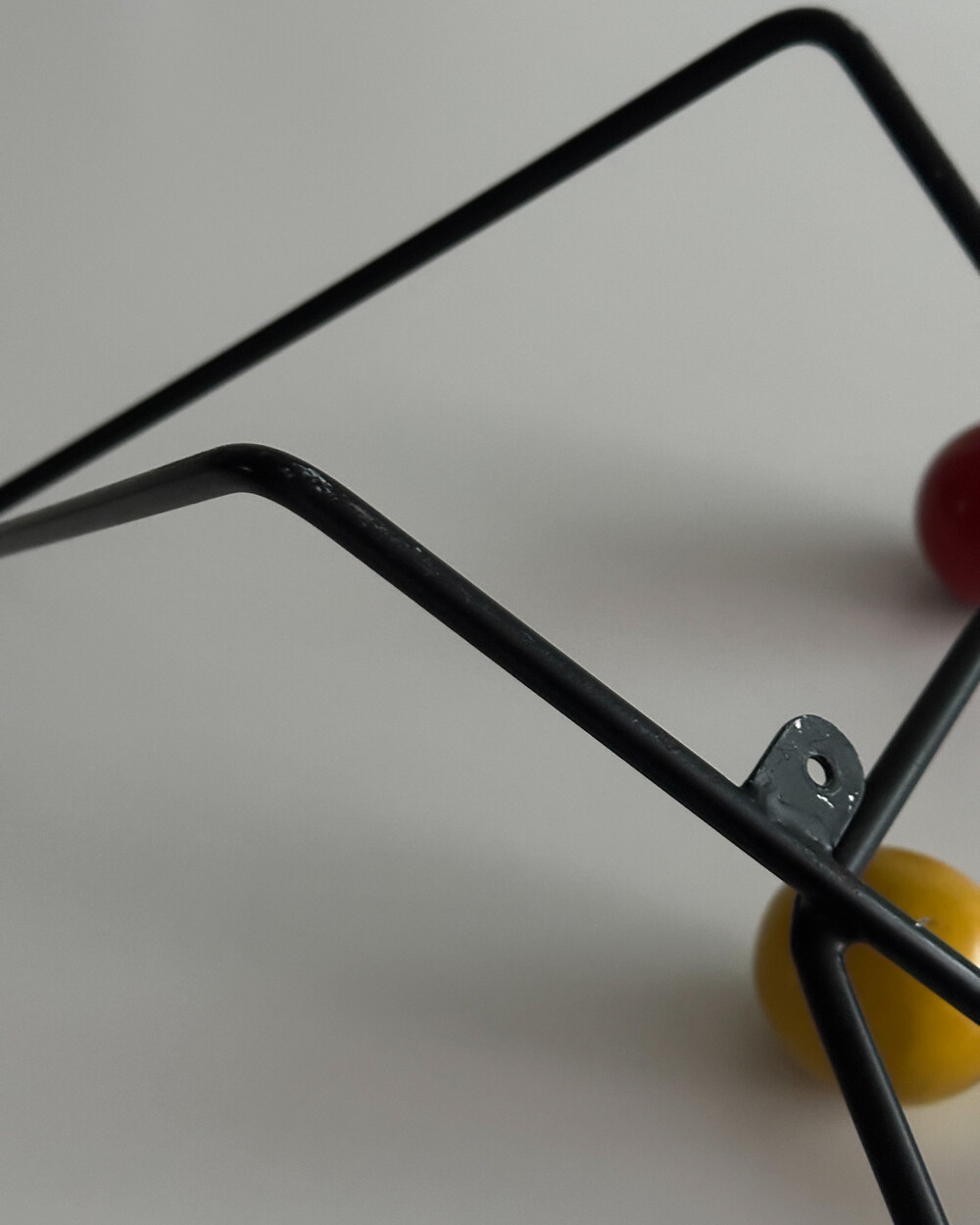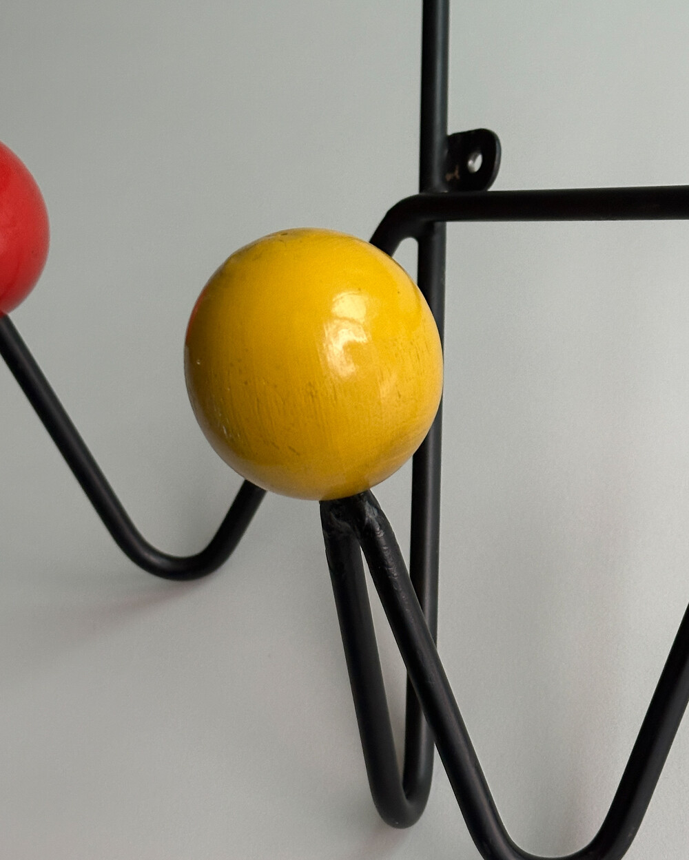 1960년도 덴마크에서 제작된 빈티지 컬러 볼 헹거입니다. 블랙 철제 프레임 위로 모자나 가벼운 소품을 걸 수 있는 상단 걸이 1개와 3개의 빨강, 노랑, 초록의 우드볼 3개로 이루어져 있습니다. 단순한 수납을 넘어 공간에 조형적 리듬을 더하는 구조적 오브제로, 당시 시대의 감성과 실용성을 동시에 담아낸 아이템입니다.