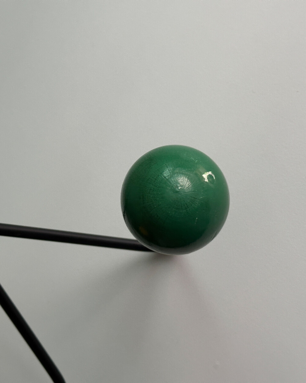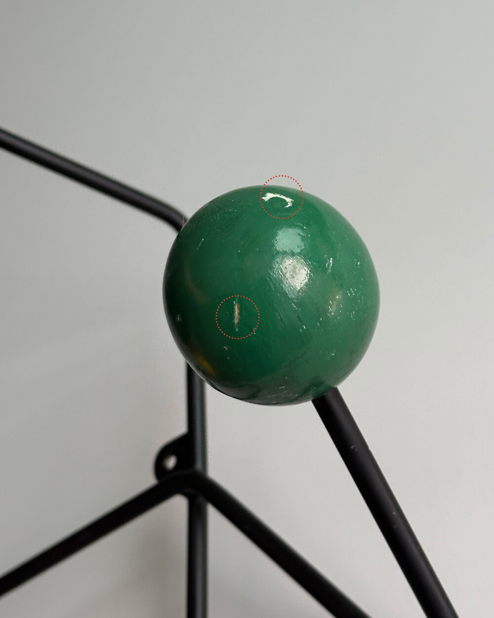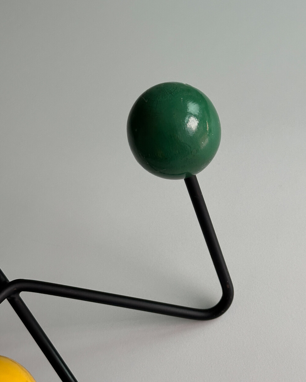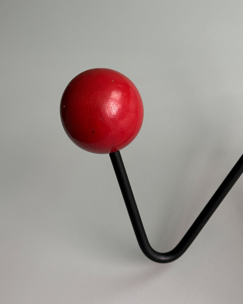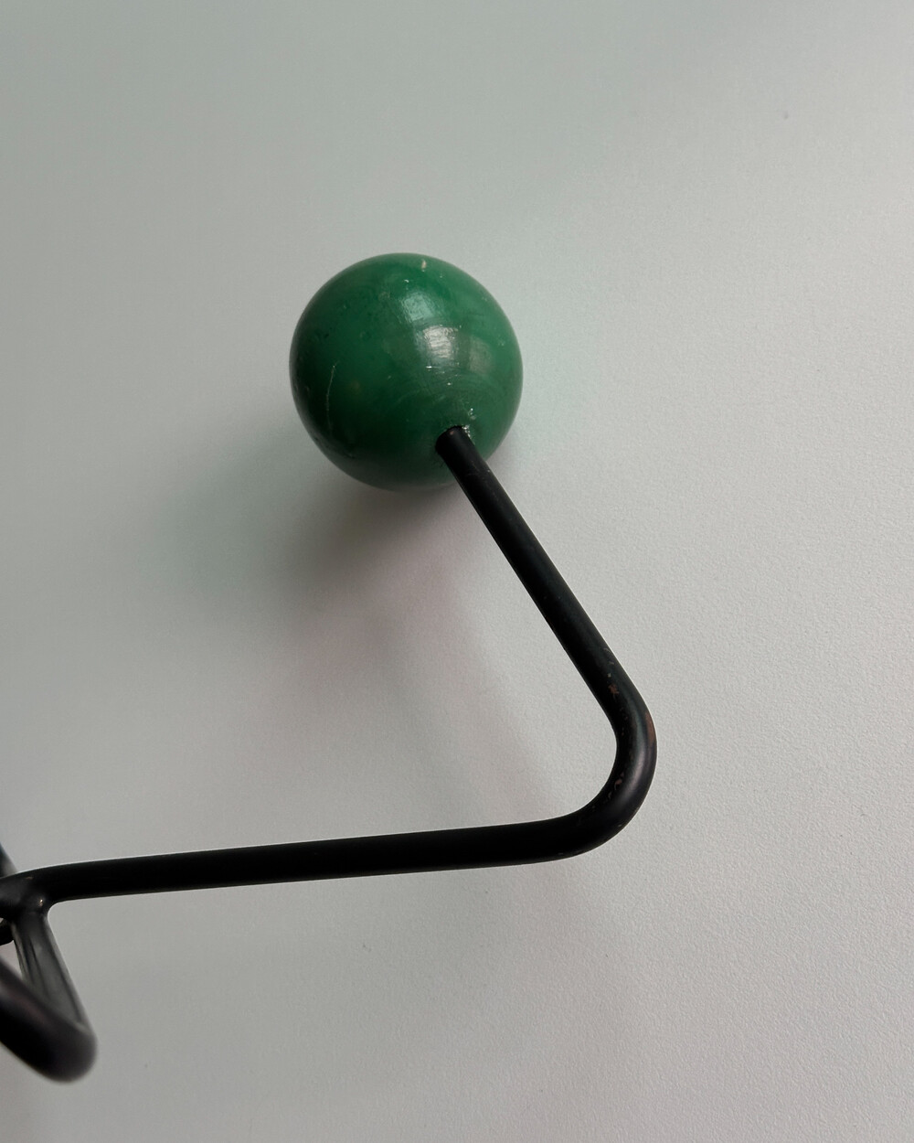 1960년도 덴마크에서 제작된 빈티지 컬러 볼 헹거입니다. 블랙 철제 프레임 위로 모자나 가벼운 소품을 걸 수 있는 상단 걸이 1개와 3개의 빨강, 노랑, 초록의 우드볼 3개로 이루어져 있습니다. 단순한 수납을 넘어 공간에 조형적 리듬을 더하는 구조적 오브제로, 당시 시대의 감성과 실용성을 동시에 담아낸 아이템입니다.
