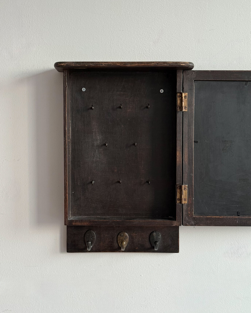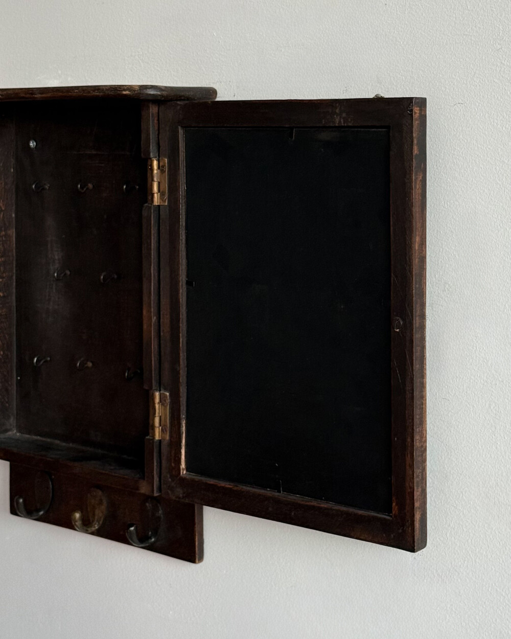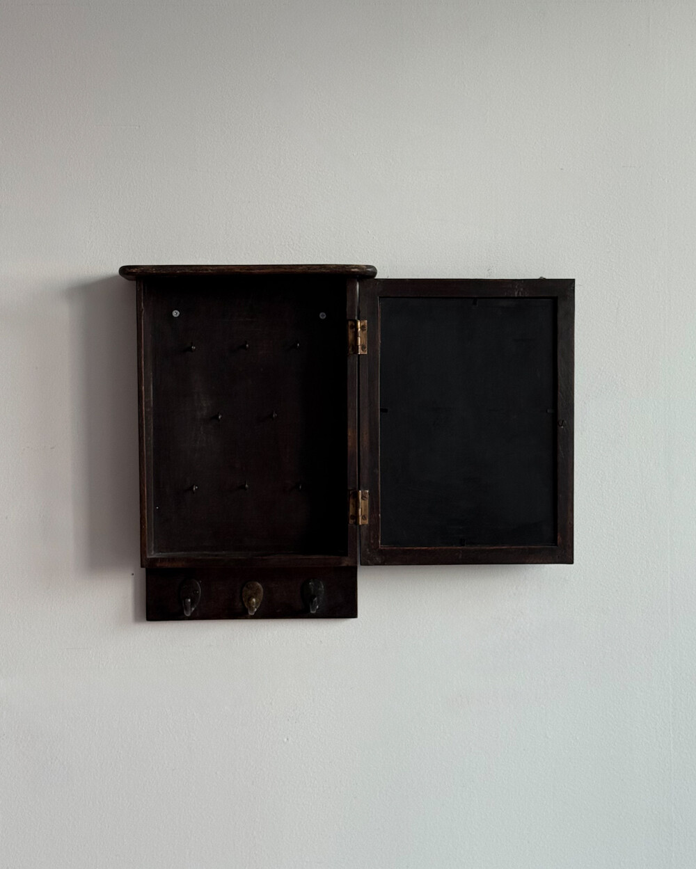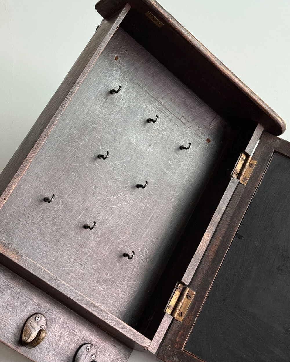 1970년대 서독에서 제작된 빈티지 열쇠 수납함입니다. 자연스러운 세월감이 뭍어있는 짙은 고동색 목재 프레임으로, 내부에는 8개의 열쇠 걸이, 하단에는 가방이나 소품용 금속 후크 3개로 구성되어 있습니다.