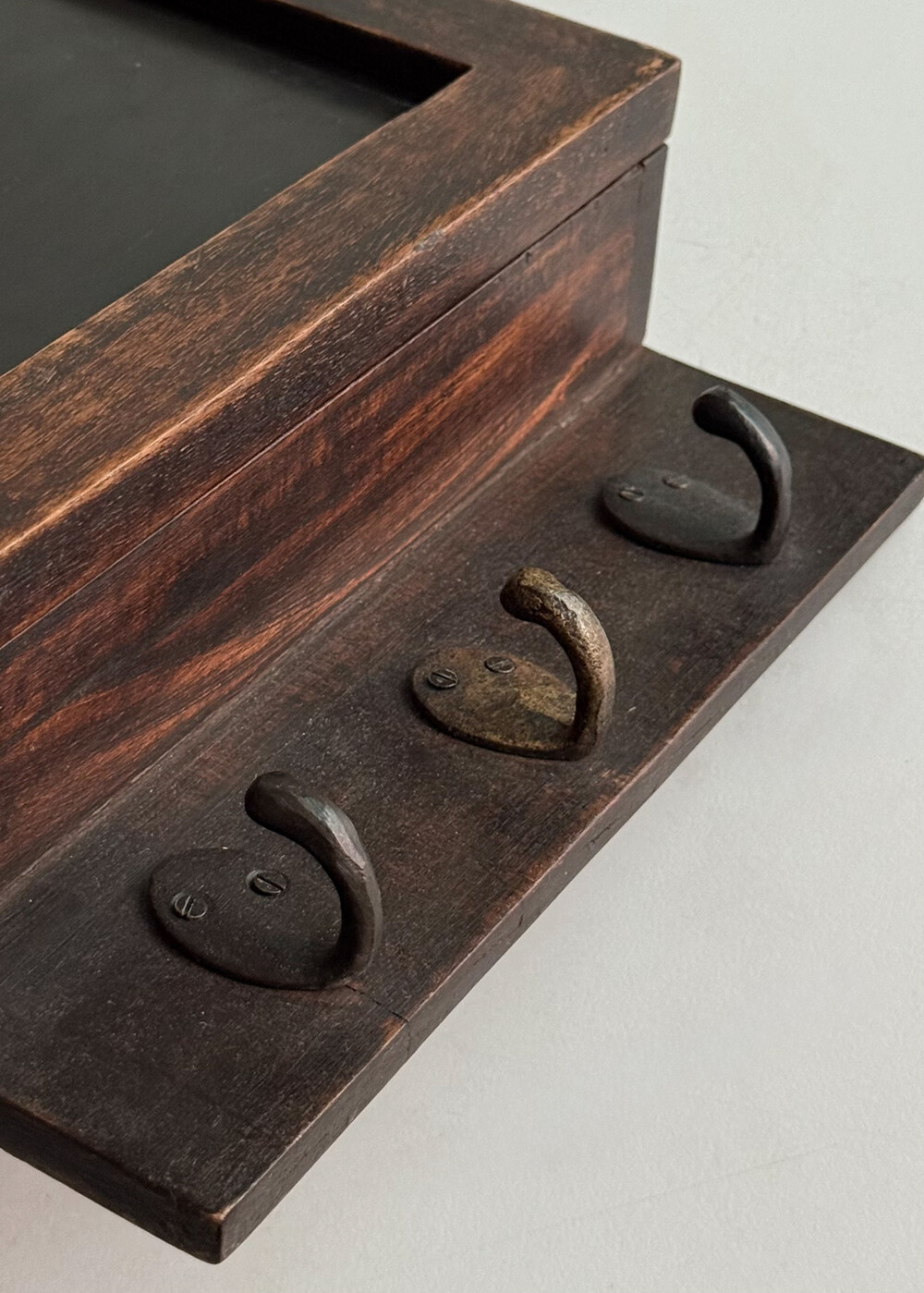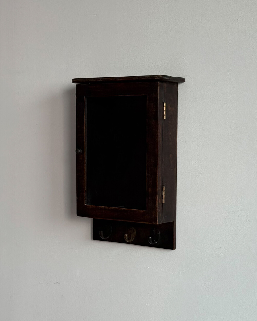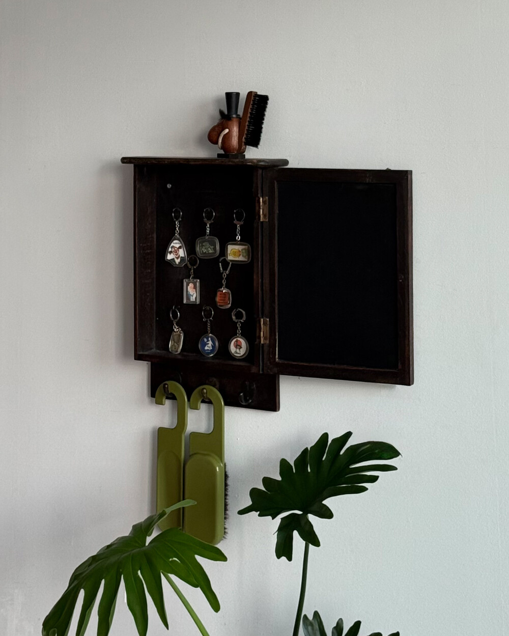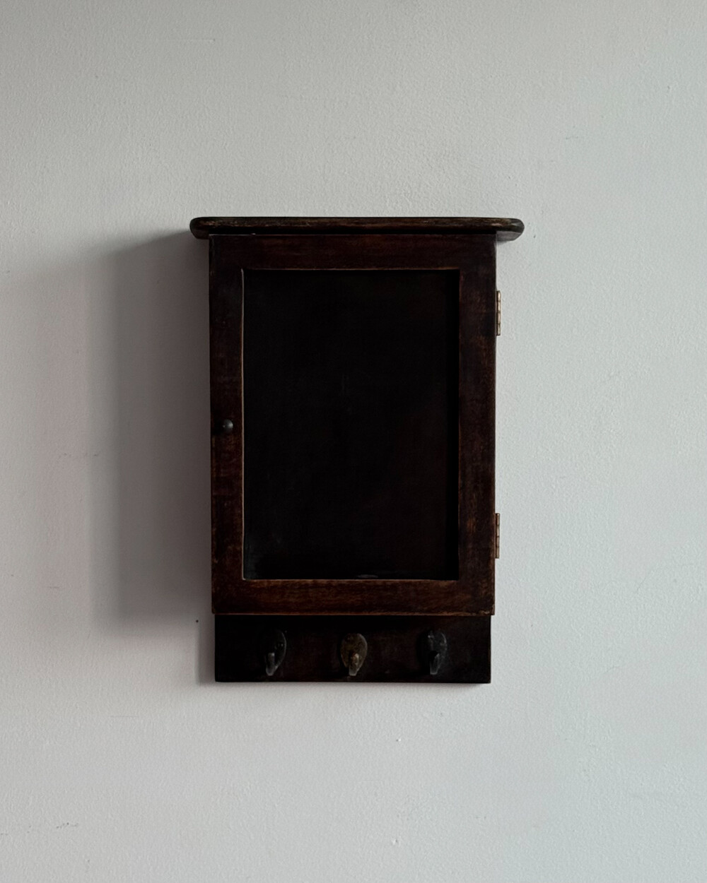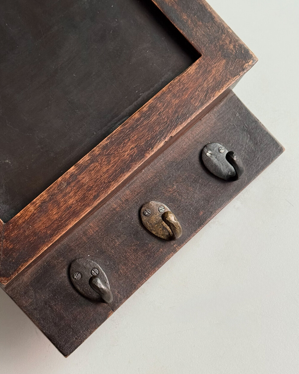 1970년대 서독에서 제작된 빈티지 열쇠 수납함입니다. 자연스러운 세월감이 뭍어있는 짙은 고동색 목재 프레임으로, 내부에는 8개의 열쇠 걸이, 하단에는 가방이나 소품용 금속 후크 3개로 구성되어 있습니다.
