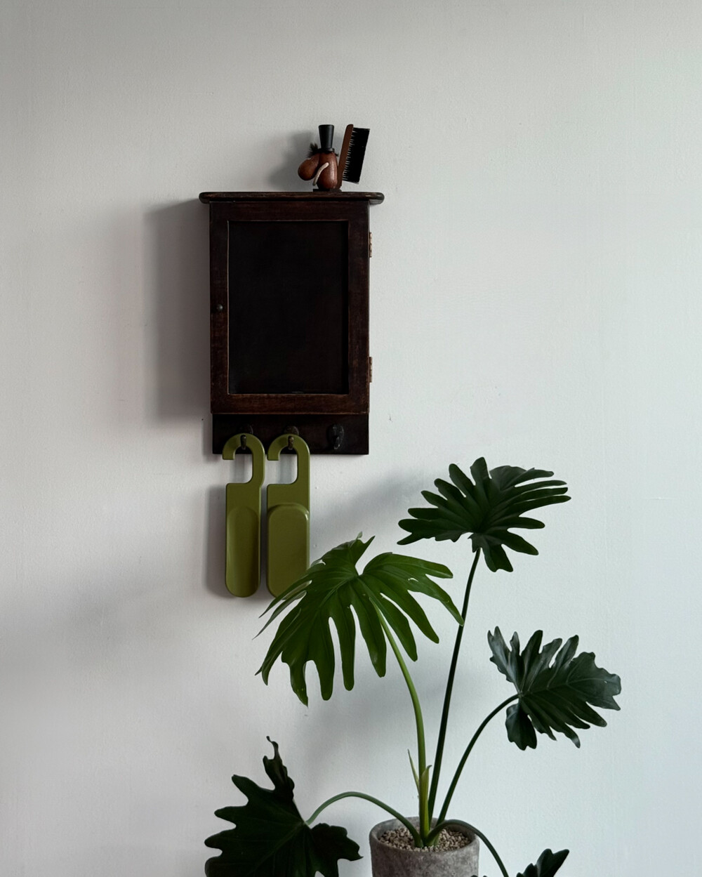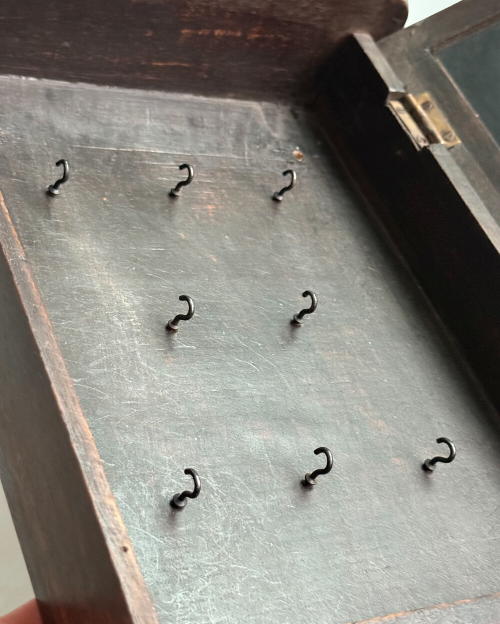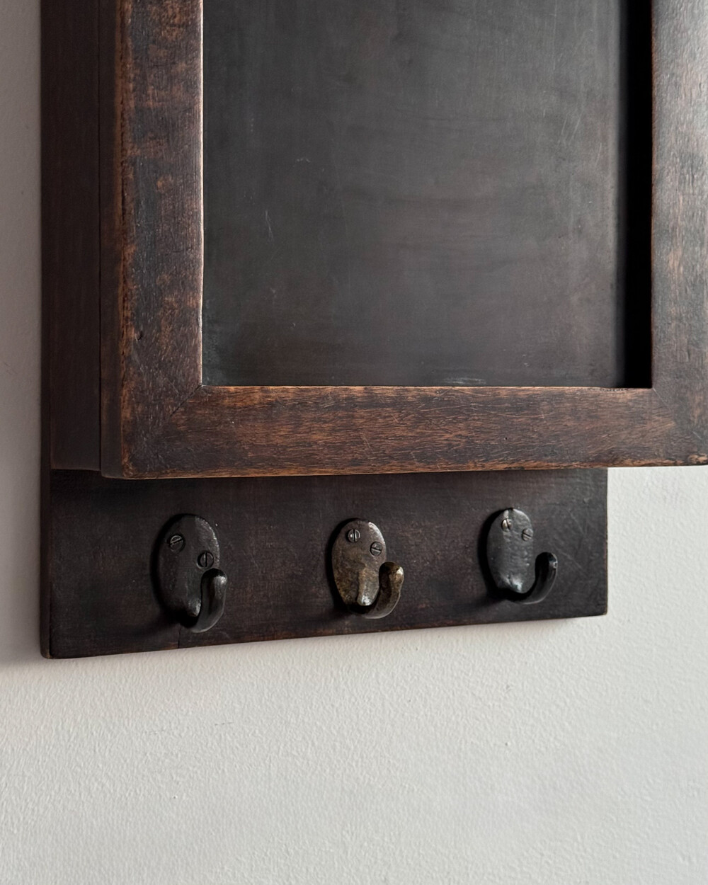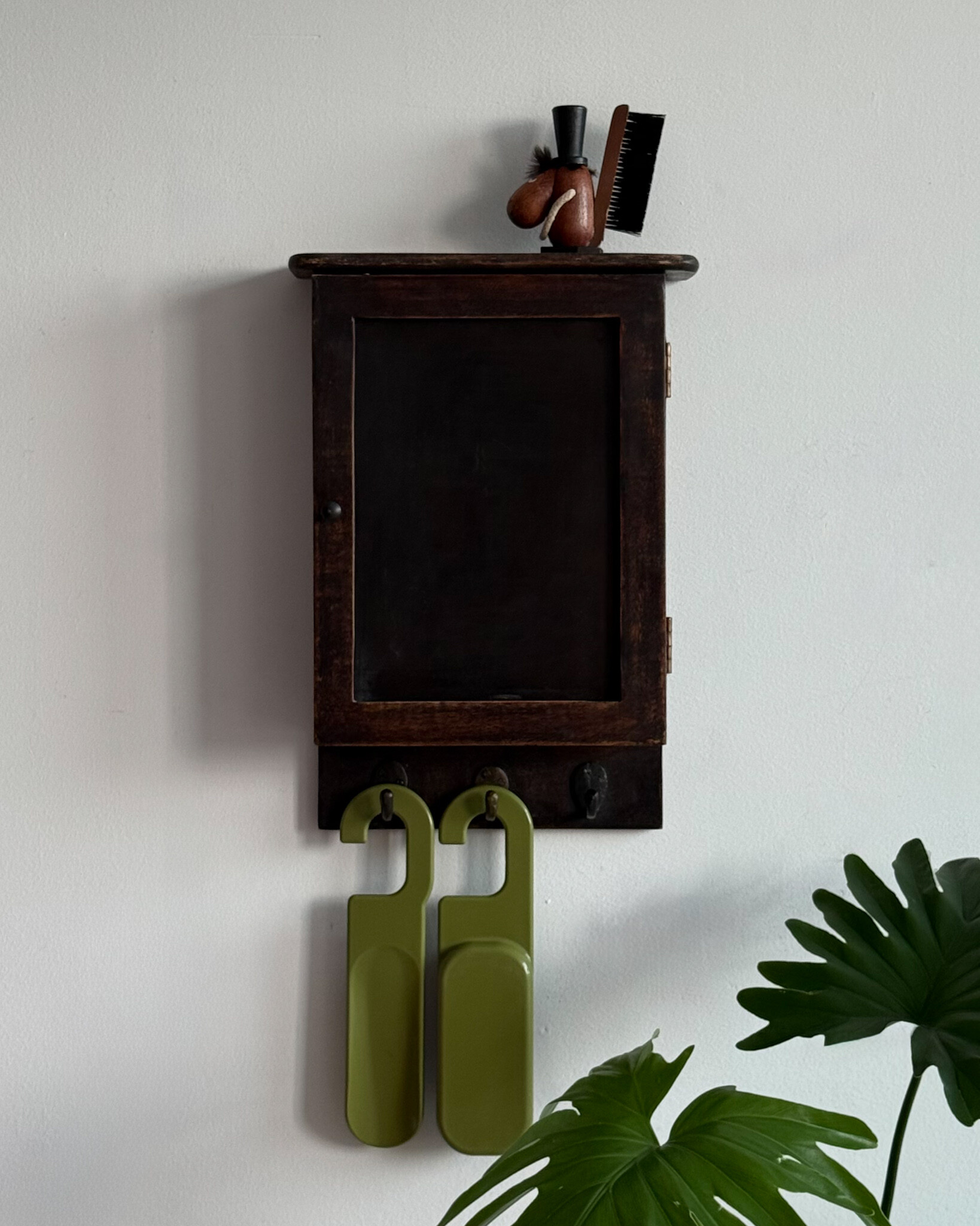 1970년대 서독에서 제작된 빈티지 열쇠 수납함입니다. 자연스러운 세월감이 뭍어있는 짙은 고동색 목재 프레임으로, 내부에는 8개의 열쇠 걸이, 하단에는 가방이나 소품용 금속 후크 3개로 구성되어 있습니다.