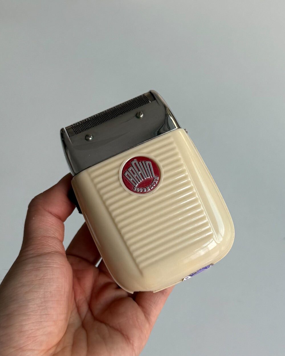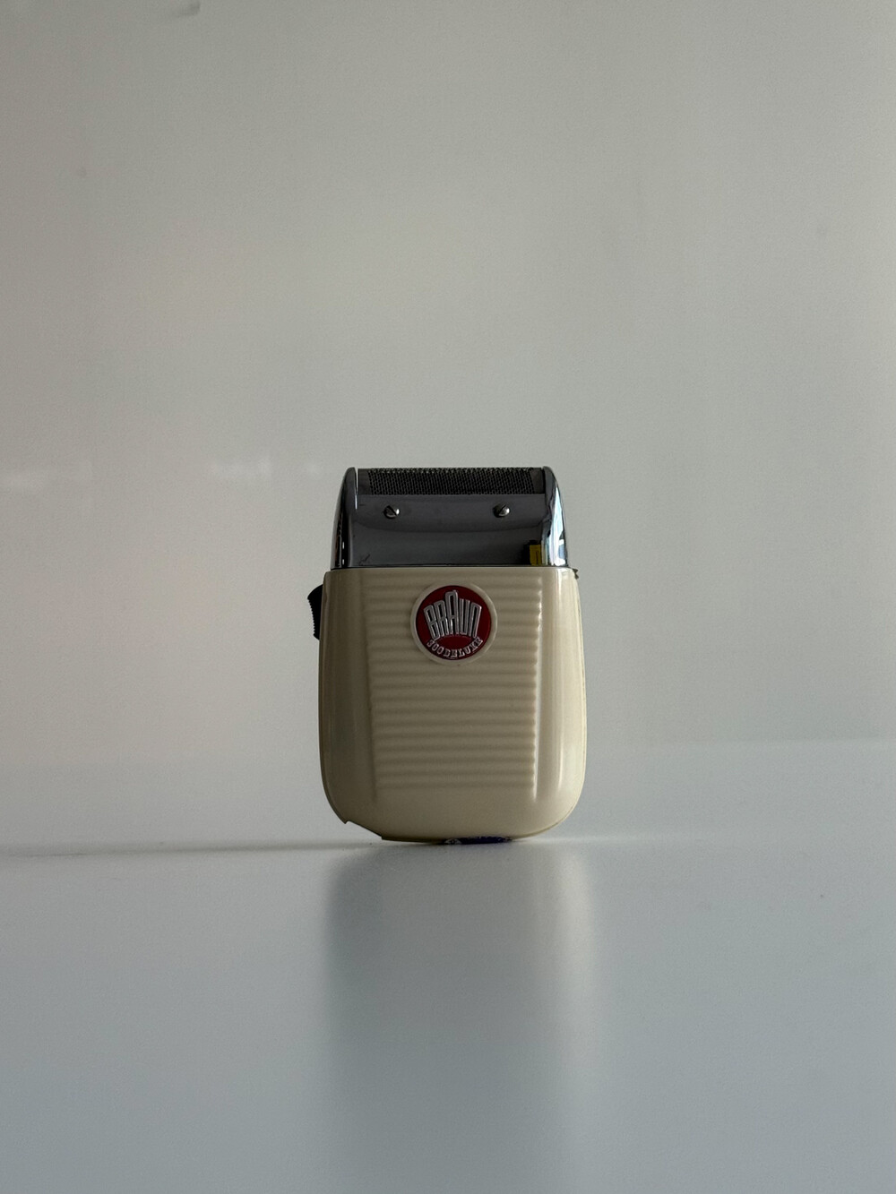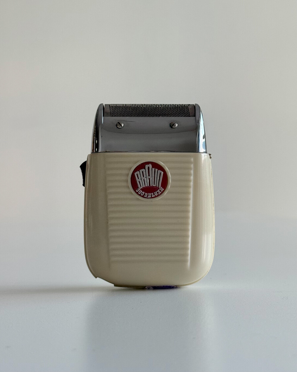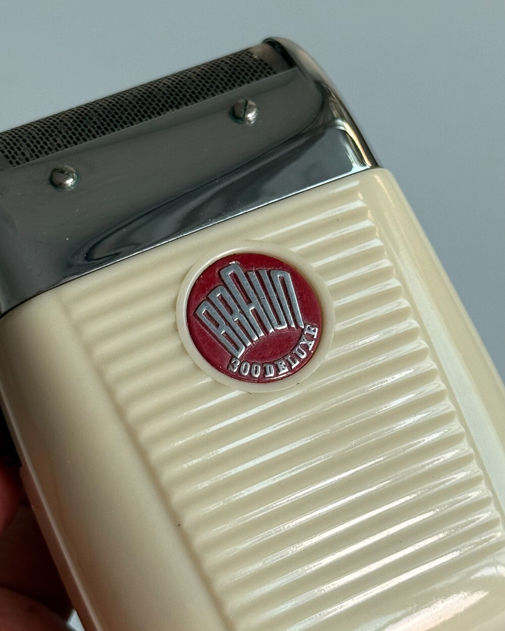 1953년 Artur Braun와 Bodo Fütterer에 의해 디자인된 브라운의 초기 면도기 모델 300 Deluxe 입니다. S50,S52와 같은 이전 모델에서 확연히 탈피한 첫 디자인으로 이후 브라운 전기면도기 디자인의 기준으로 자리 잡았습니다. 묵직한 그립감이 큰 특징이며, 미니멀 디자인 철학이 고스란히 담겨있는 제품으로, 하나의 전원 스위치만을 두어 직관적으로 사용할 수 있도록 설계했습니다.