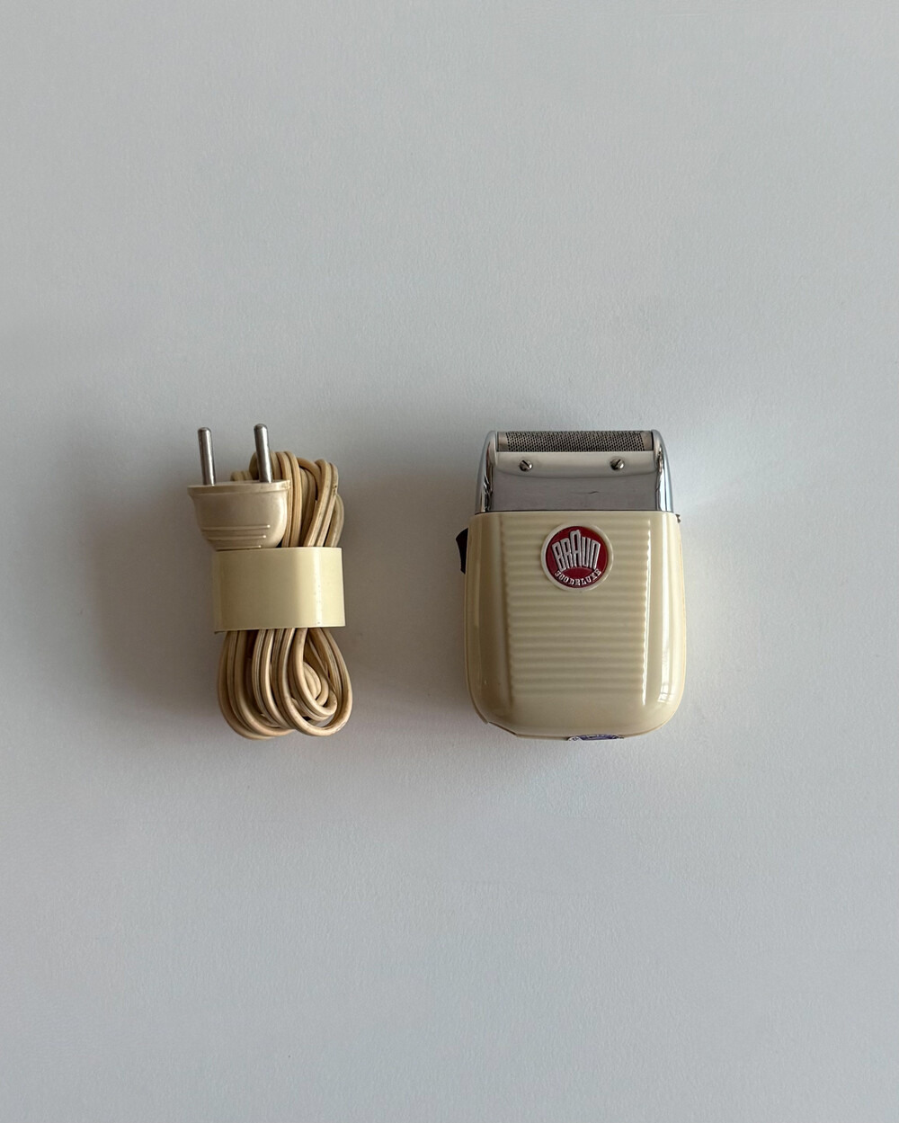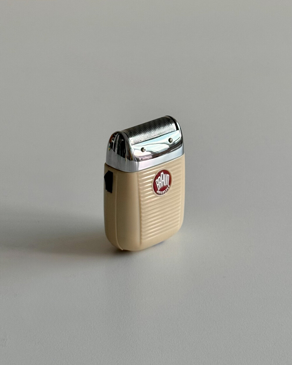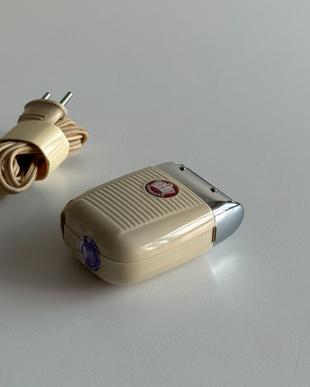 1953년 Artur Braun와 Bodo Fütterer에 의해 디자인된 브라운의 초기 면도기 모델 300 Deluxe 입니다. S50,S52와 같은 이전 모델에서 확연히 탈피한 첫 디자인으로 이후 브라운 전기면도기 디자인의 기준으로 자리 잡았습니다. 묵직한 그립감이 큰 특징이며, 미니멀 디자인 철학이 고스란히 담겨있는 제품으로, 하나의 전원 스위치만을 두어 직관적으로 사용할 수 있도록 설계했습니다.