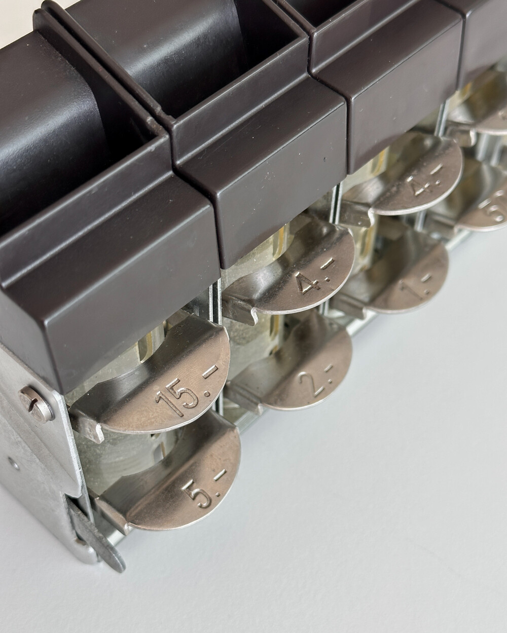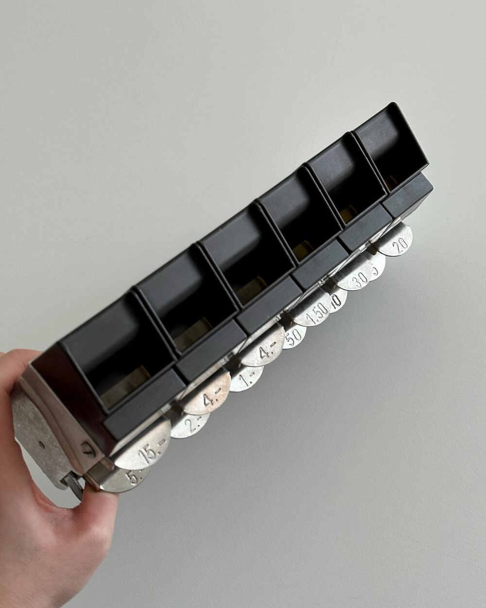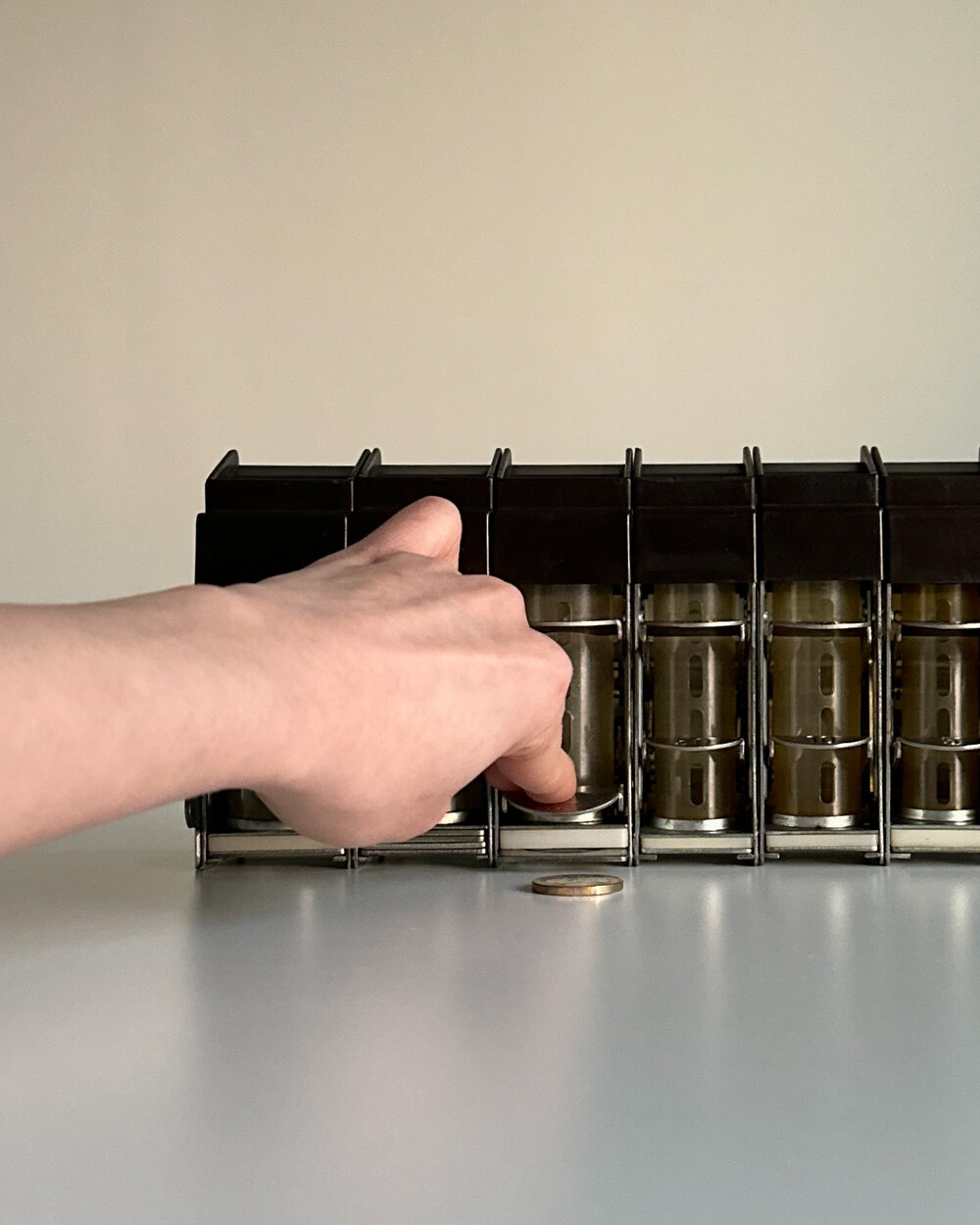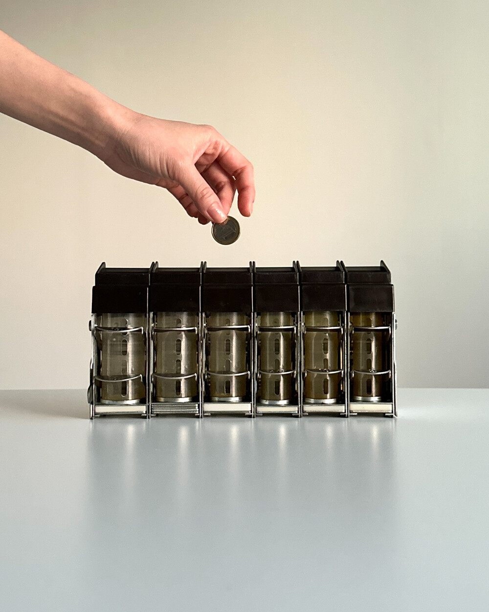 1960년대 서독일에서 생산되었던 빈티지 코인 디스펜서입니다. 상단 홀을 통해 동전을 넣을 수 있으며, 원하는 액수의 버튼을 누르면 하단으로 동전이 나오는 형태로 이루어져 있습니다. 당시 화폐였던 도이치 마르크(DM) 에 적합한 동전 규격으로 이루어져 실사용은 어려우나, 당시 시대를 잘 나타내주는 아이템으로 빈티지 소품으로 활용하기 좋습니다.