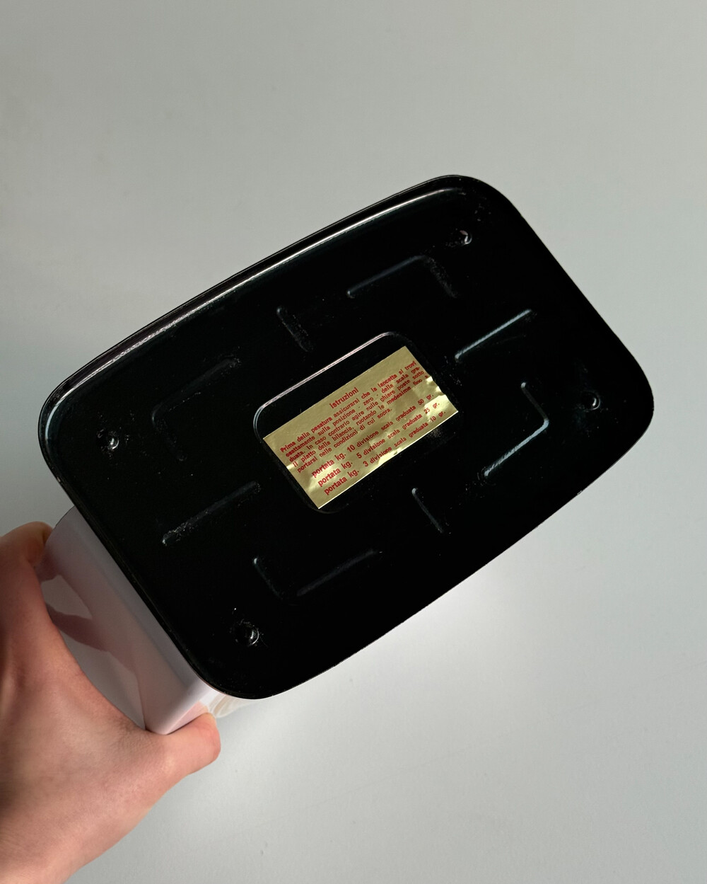 1970년대 이탈리아에서 제작된 JOLLY 키친 스케일입니다. 블루 메탈 바디와 블랙 다이얼, 큼직한 숫자 인덱스가 특징인 매력적인 디자인입니다. 큰 숫자와 촘촘한 눈금으로 측정값을 직관적으로 확인할 수 있으며, 최대 10kg까지 측정 가능합니다. 주방에서 실제 계량용으로 사용할 수 있을 뿐 아니라 과일이나 소품을 올려두는 키친 오브제로도 활용하기 좋은 빈티지 제품입니다.