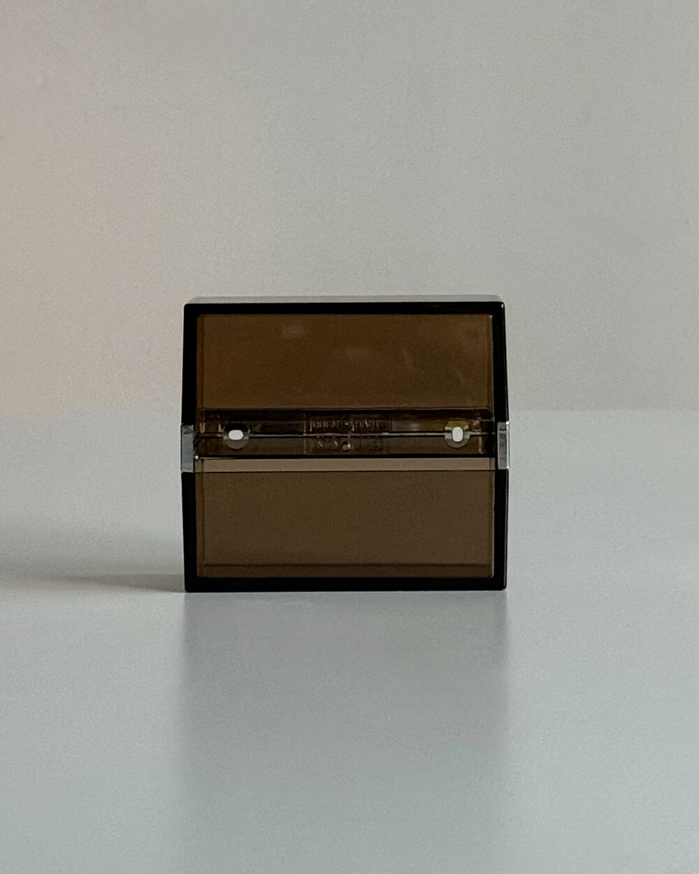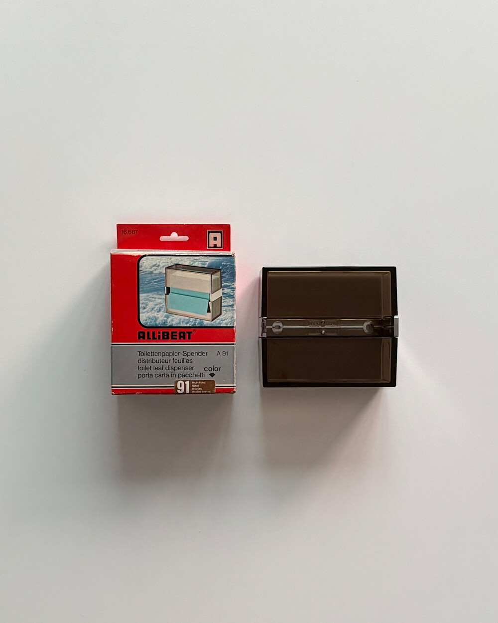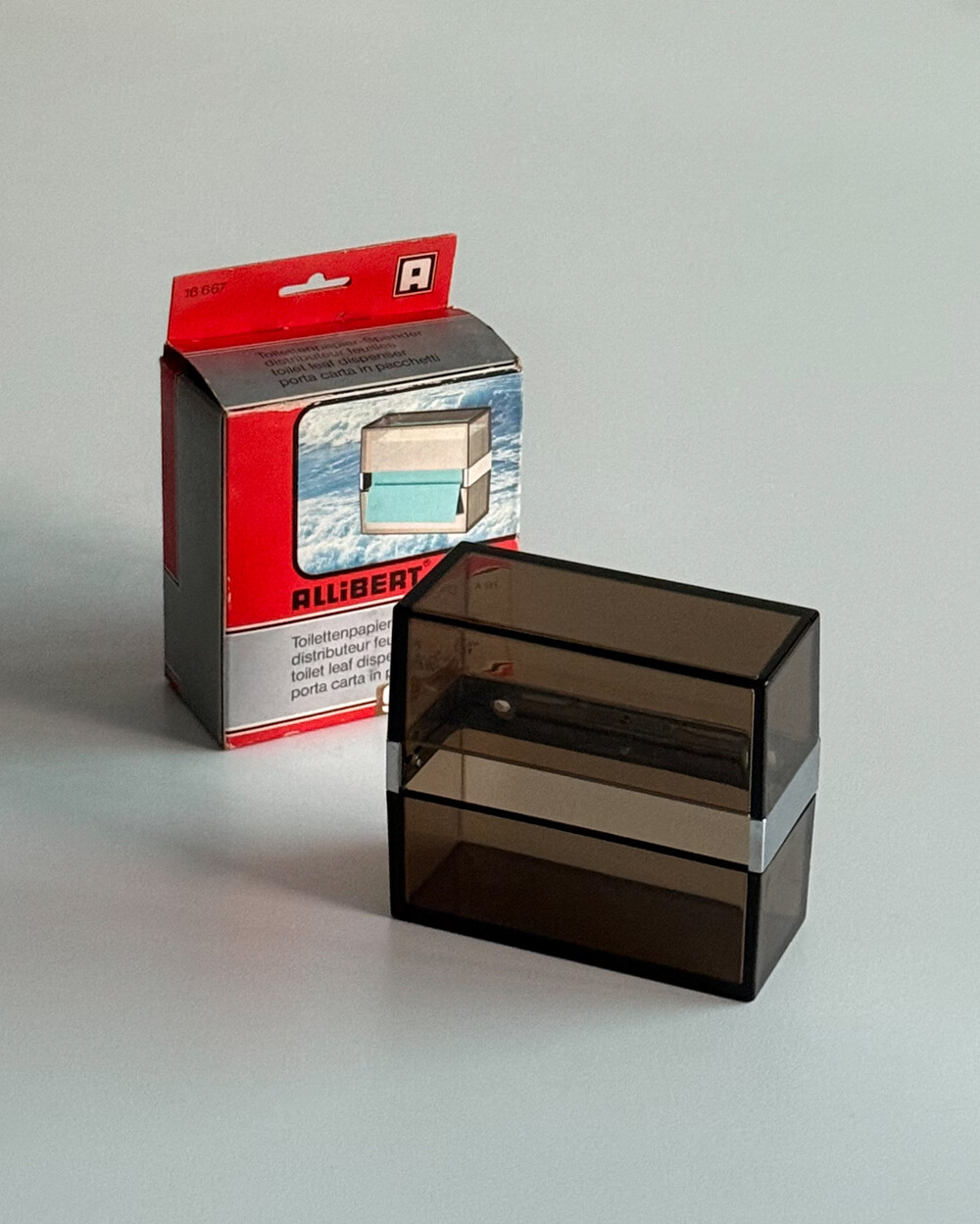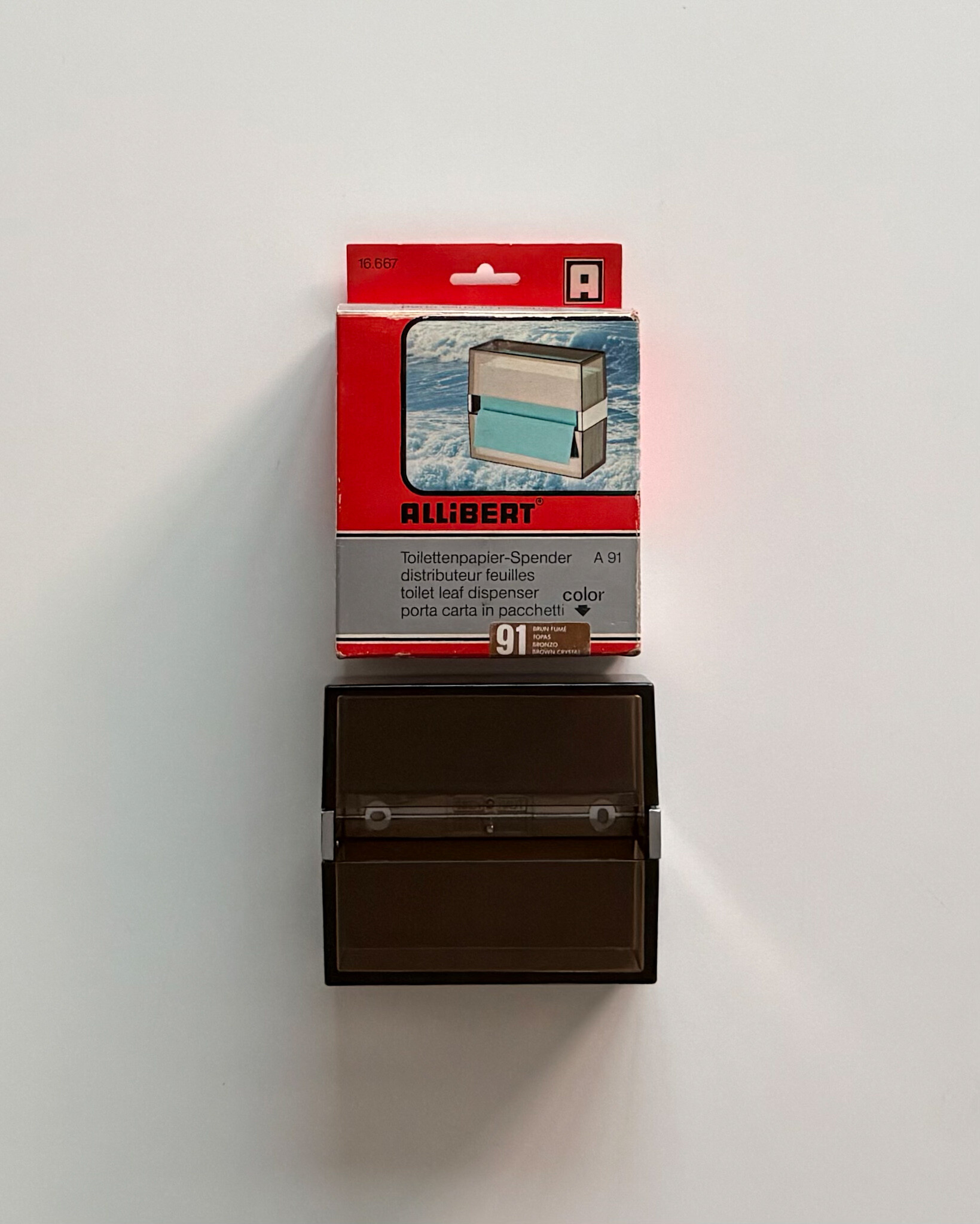 1970년대 프랑스 ALLIBERT에서 제작된 토일렛 페이퍼 디스펜서입니다. 벽에 고정하여 사용하는 구조로, 스모크 브라운 컬러의 반투명 플라스틱으로 제작되어 내부 잔량을 쉽게 확인할 수 있습니다. 간결한 직선 형태와 미드센추리 감각의 컬러가 특징으로, 욕실뿐 아니라 스튜디오나 상업 공간에서도 활용하기 좋습니다. 해당 제품은 대중적으로 잘 알려진 ‘ALLIBERT 미러’와 함께 소개된 동일 라인의 모델로, 현재는 보기 드문 아이템 중 하나입니다.