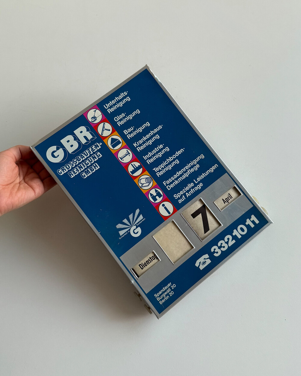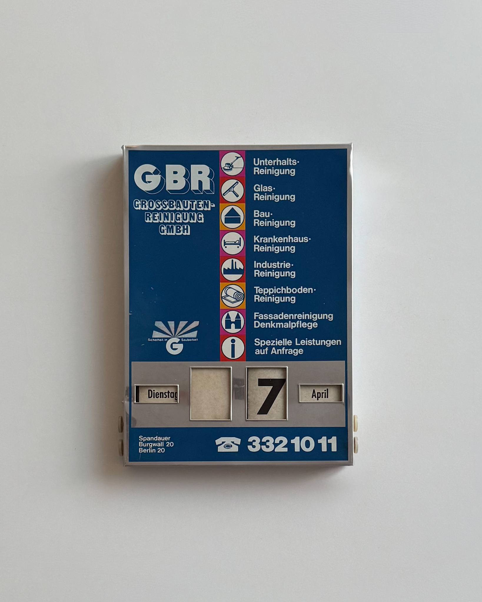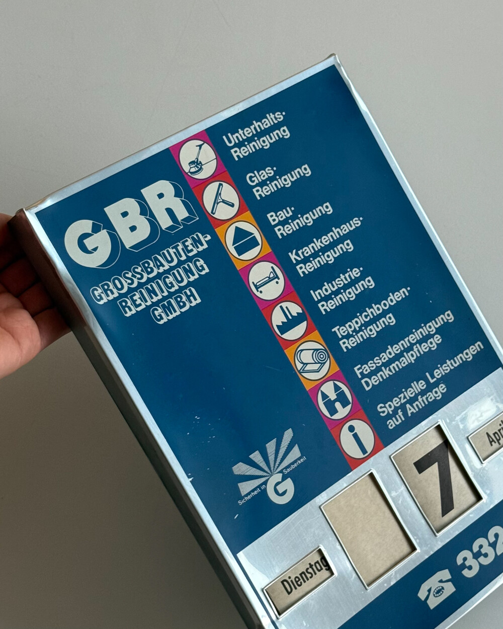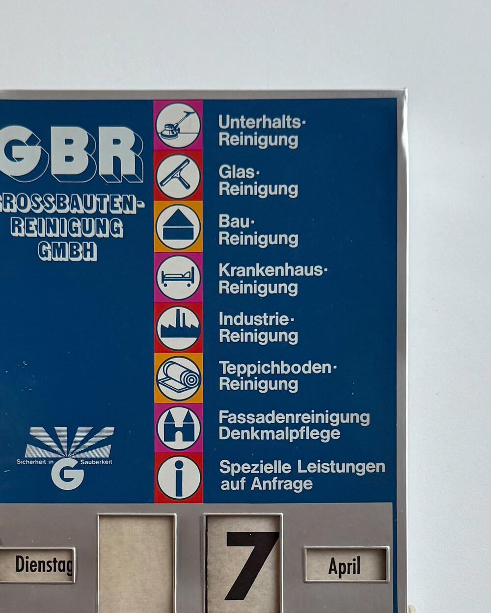 1970년대 서베를린의 대형 건물 청소 기업인 GBR(Grossbauten-Reinigung GmbH)에서 판촉물로 제작되었던 벽걸이형 퍼페추얼 캘린더입니다. 가벼운 소재의 실버 프레임 위에 당시 회사의 전문 서비스 항목을 형상화한 8개의 컬러풀한 픽토그램이 배치되어 있습니다. 유리 세정, 병원 및 산업 청소 등 당시 회사가 제공하던 전문 서비스들을 직관적인 아이콘으로 형상화하여 70년대 독일 산업 디자인 특유의 기능주의 미학을 고스란히 담고 있습니다. 양쪽 면에 위치한 노브를 돌려 요일, 날짜, 월을 조정할 수 있습니다.