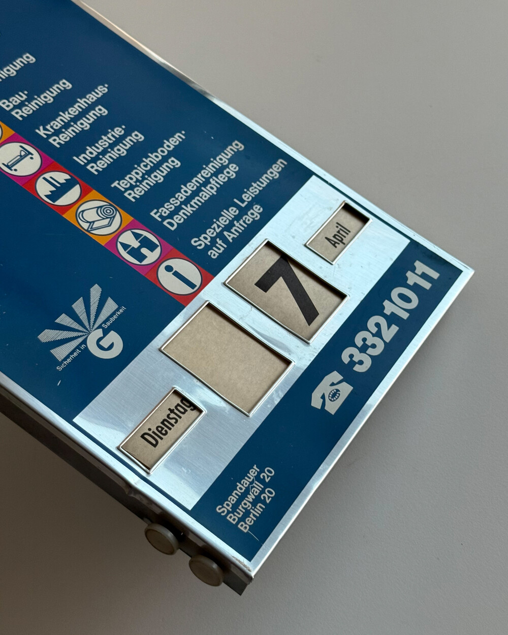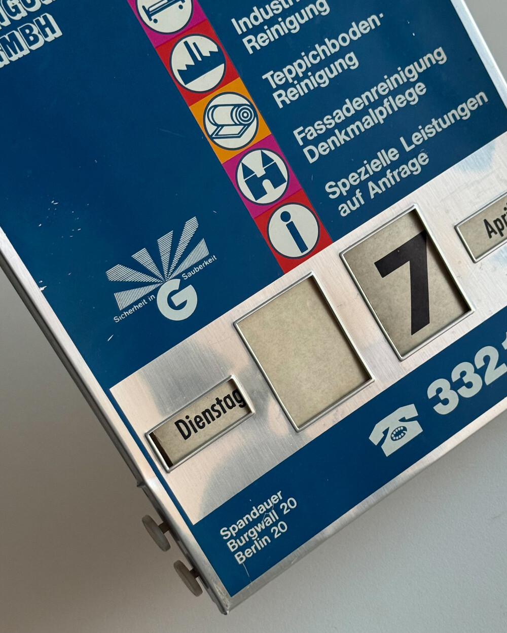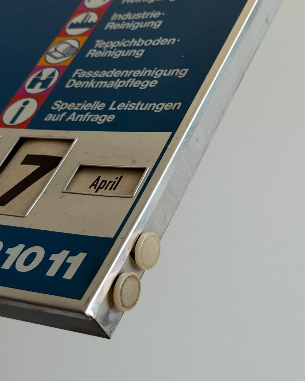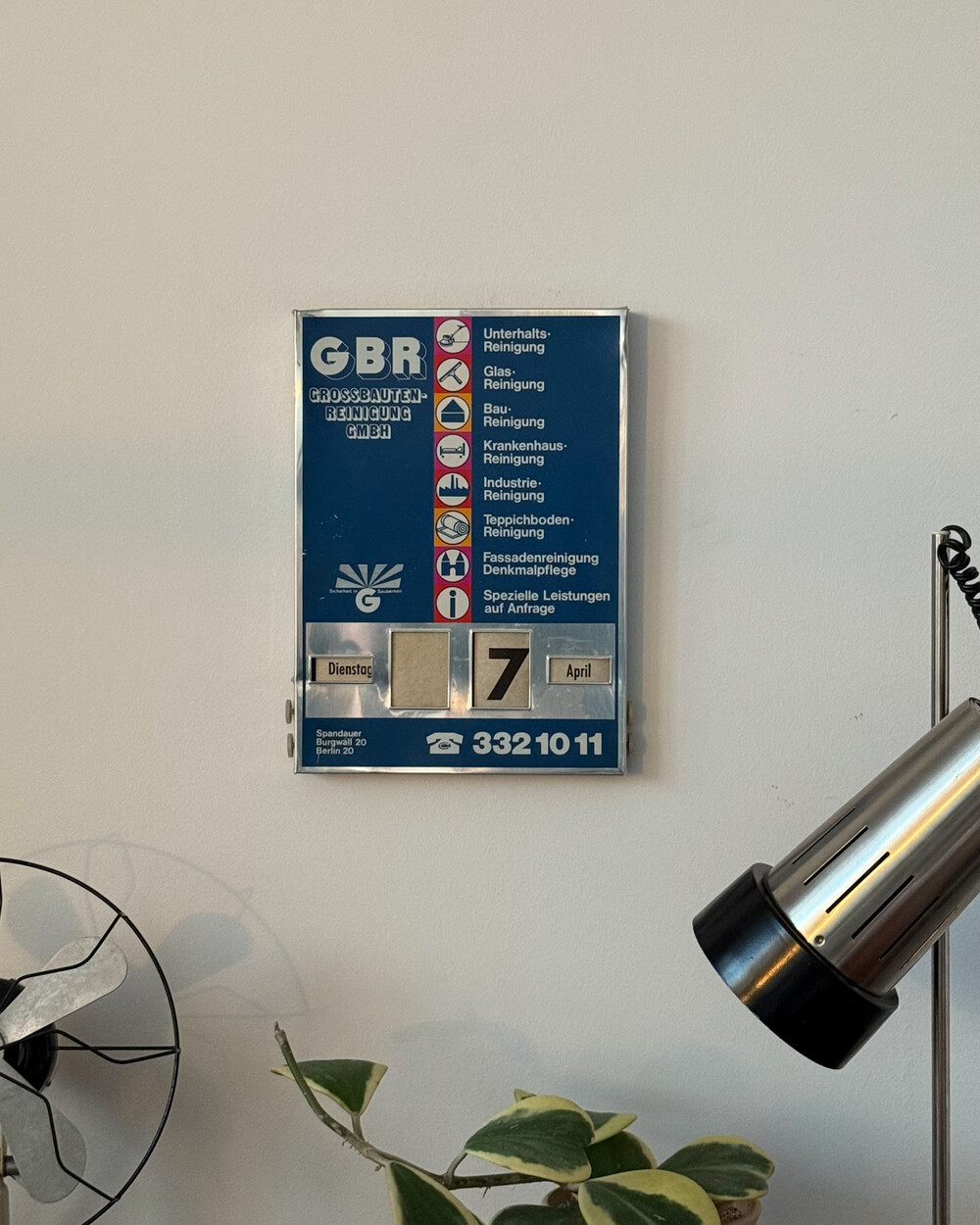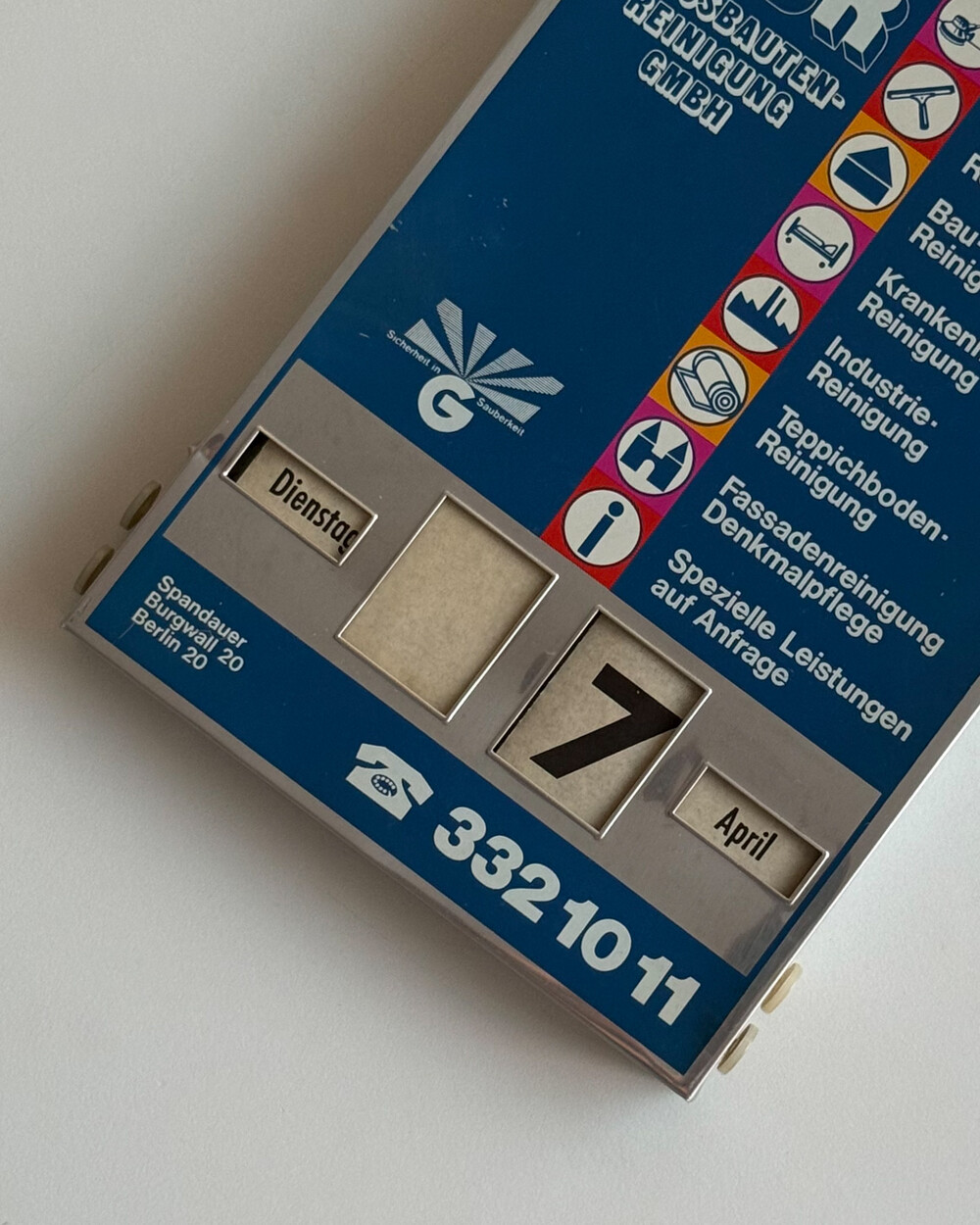 1970년대 서베를린의 대형 건물 청소 기업인 GBR(Grossbauten-Reinigung GmbH)에서 판촉물로 제작되었던 벽걸이형 퍼페추얼 캘린더입니다. 가벼운 소재의 실버 프레임 위에 당시 회사의 전문 서비스 항목을 형상화한 8개의 컬러풀한 픽토그램이 배치되어 있습니다. 유리 세정, 병원 및 산업 청소 등 당시 회사가 제공하던 전문 서비스들을 직관적인 아이콘으로 형상화하여 70년대 독일 산업 디자인 특유의 기능주의 미학을 고스란히 담고 있습니다. 양쪽 면에 위치한 노브를 돌려 요일, 날짜, 월을 조정할 수 있습니다.