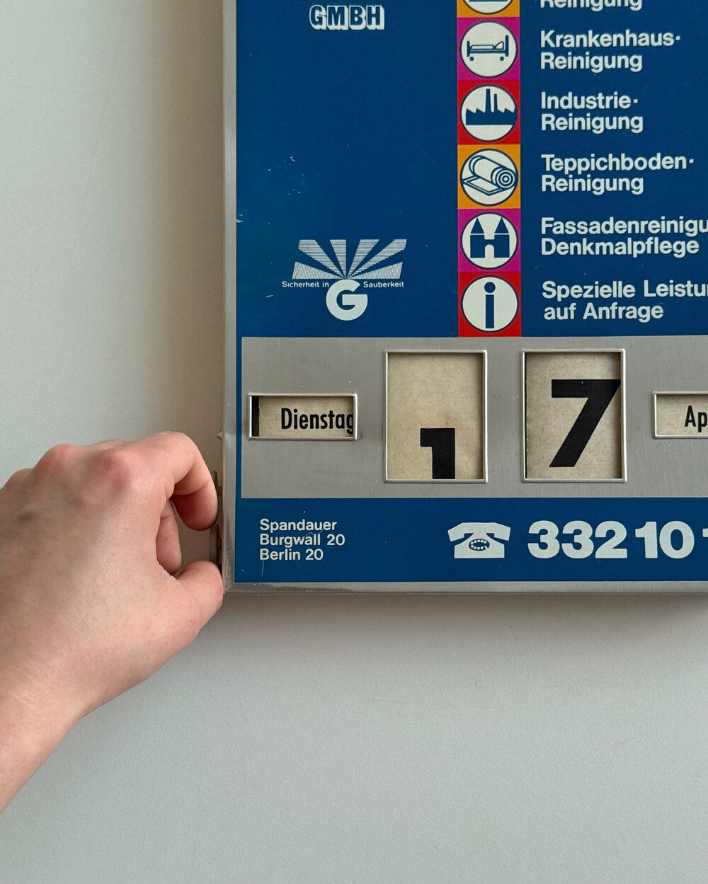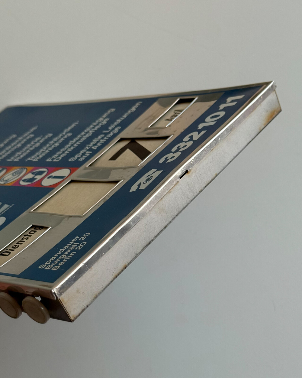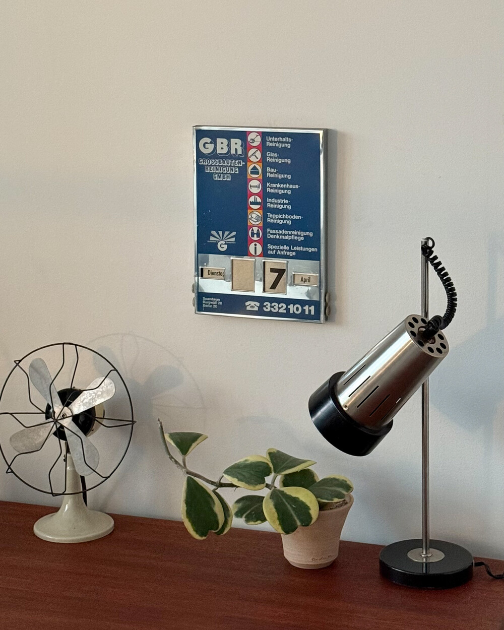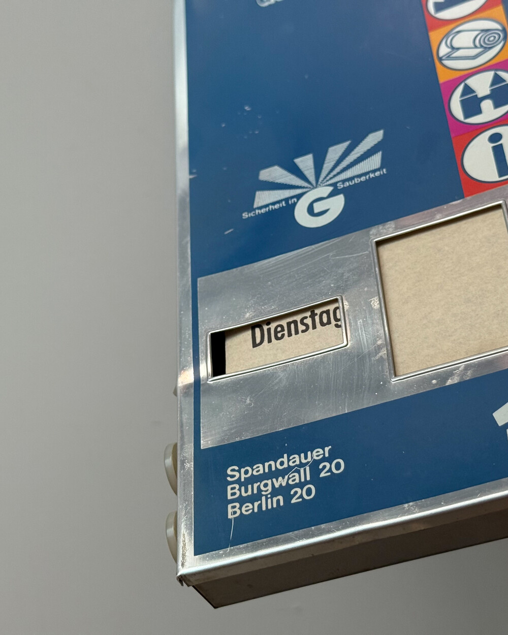 1970년대 서베를린의 대형 건물 청소 기업인 GBR(Grossbauten-Reinigung GmbH)에서 판촉물로 제작되었던 벽걸이형 퍼페추얼 캘린더입니다. 가벼운 소재의 실버 프레임 위에 당시 회사의 전문 서비스 항목을 형상화한 8개의 컬러풀한 픽토그램이 배치되어 있습니다. 유리 세정, 병원 및 산업 청소 등 당시 회사가 제공하던 전문 서비스들을 직관적인 아이콘으로 형상화하여 70년대 독일 산업 디자인 특유의 기능주의 미학을 고스란히 담고 있습니다. 양쪽 면에 위치한 노브를 돌려 요일, 날짜, 월을 조정할 수 있습니다.
