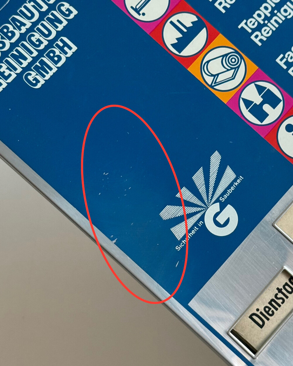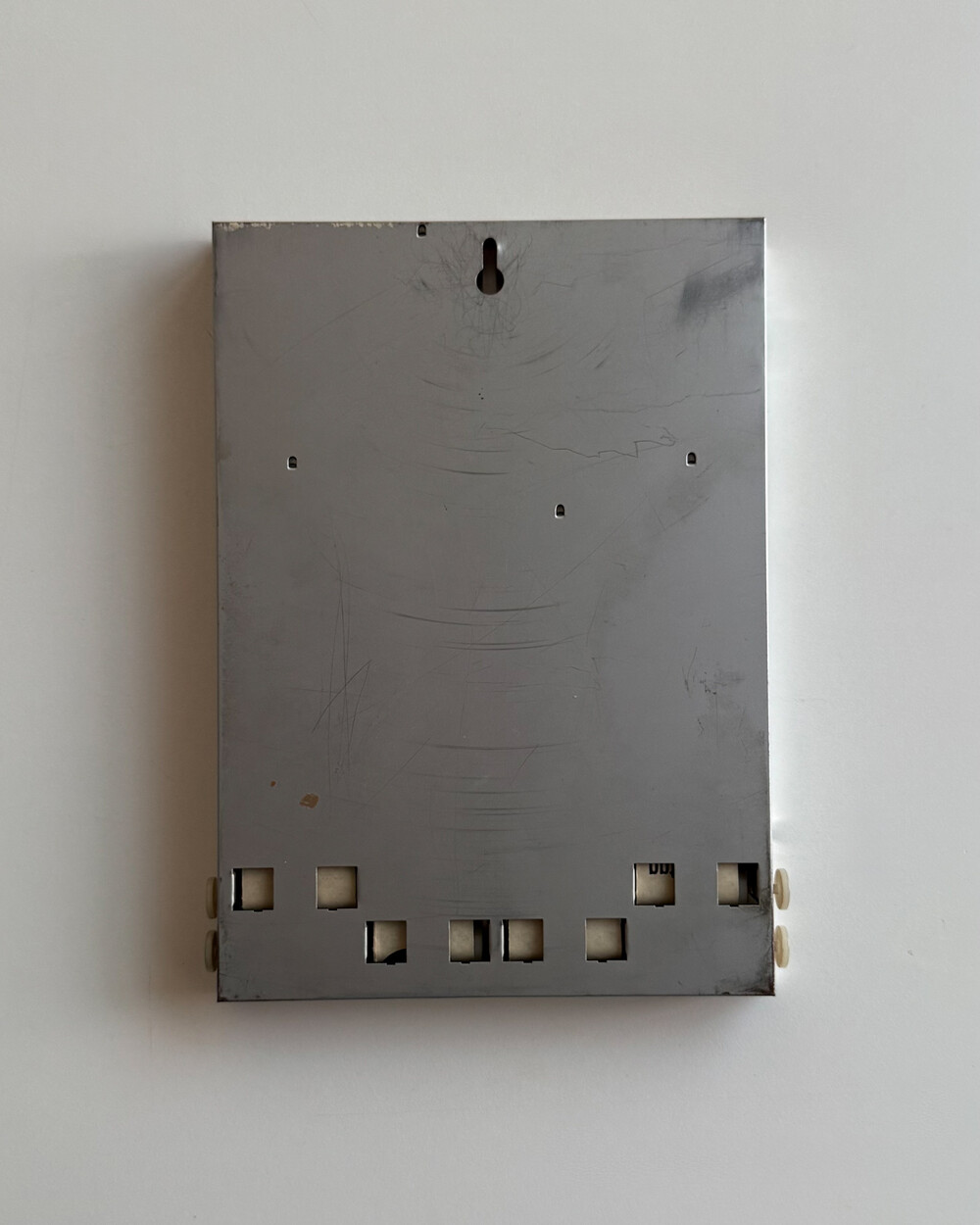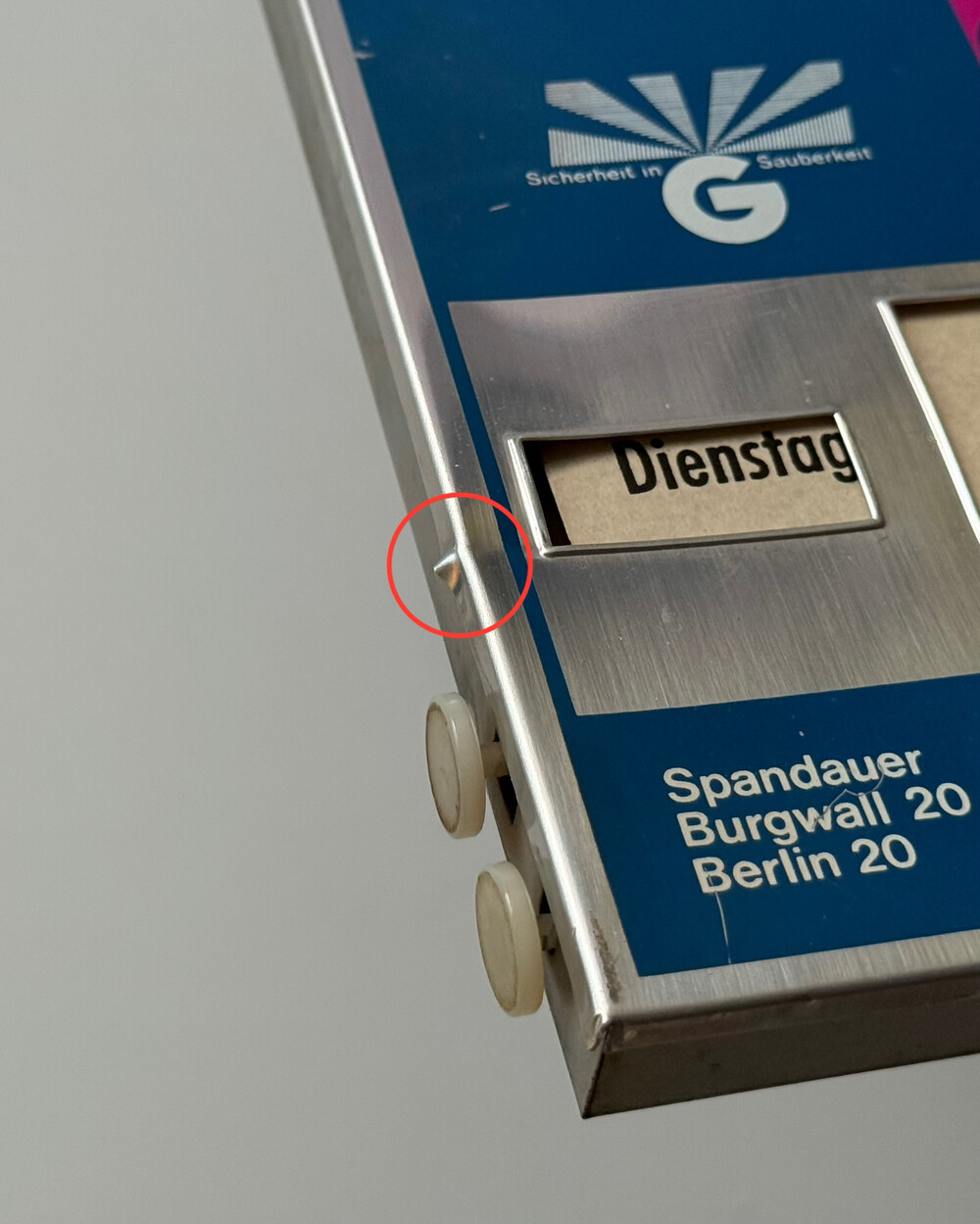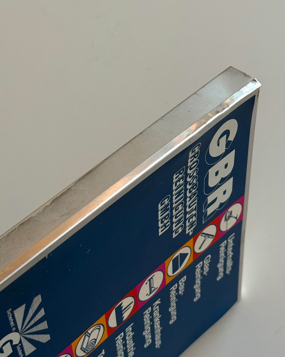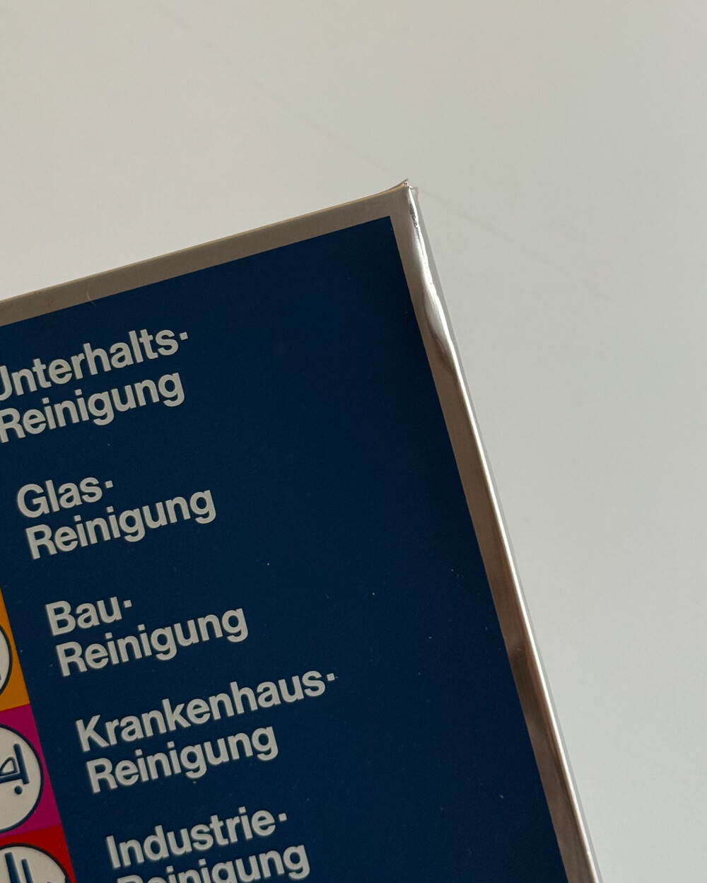 1970년대 서베를린의 대형 건물 청소 기업인 GBR(Grossbauten-Reinigung GmbH)에서 판촉물로 제작되었던 벽걸이형 퍼페추얼 캘린더입니다. 가벼운 소재의 실버 프레임 위에 당시 회사의 전문 서비스 항목을 형상화한 8개의 컬러풀한 픽토그램이 배치되어 있습니다. 유리 세정, 병원 및 산업 청소 등 당시 회사가 제공하던 전문 서비스들을 직관적인 아이콘으로 형상화하여 70년대 독일 산업 디자인 특유의 기능주의 미학을 고스란히 담고 있습니다. 양쪽 면에 위치한 노브를 돌려 요일, 날짜, 월을 조정할 수 있습니다.