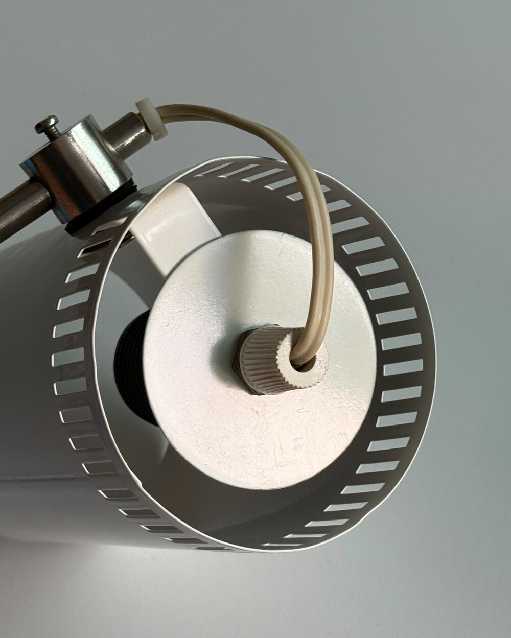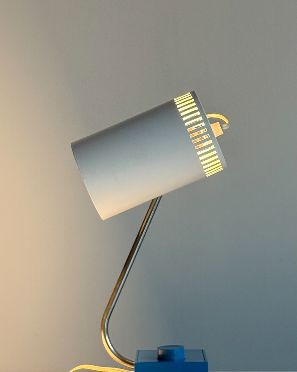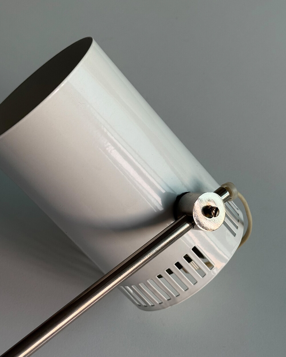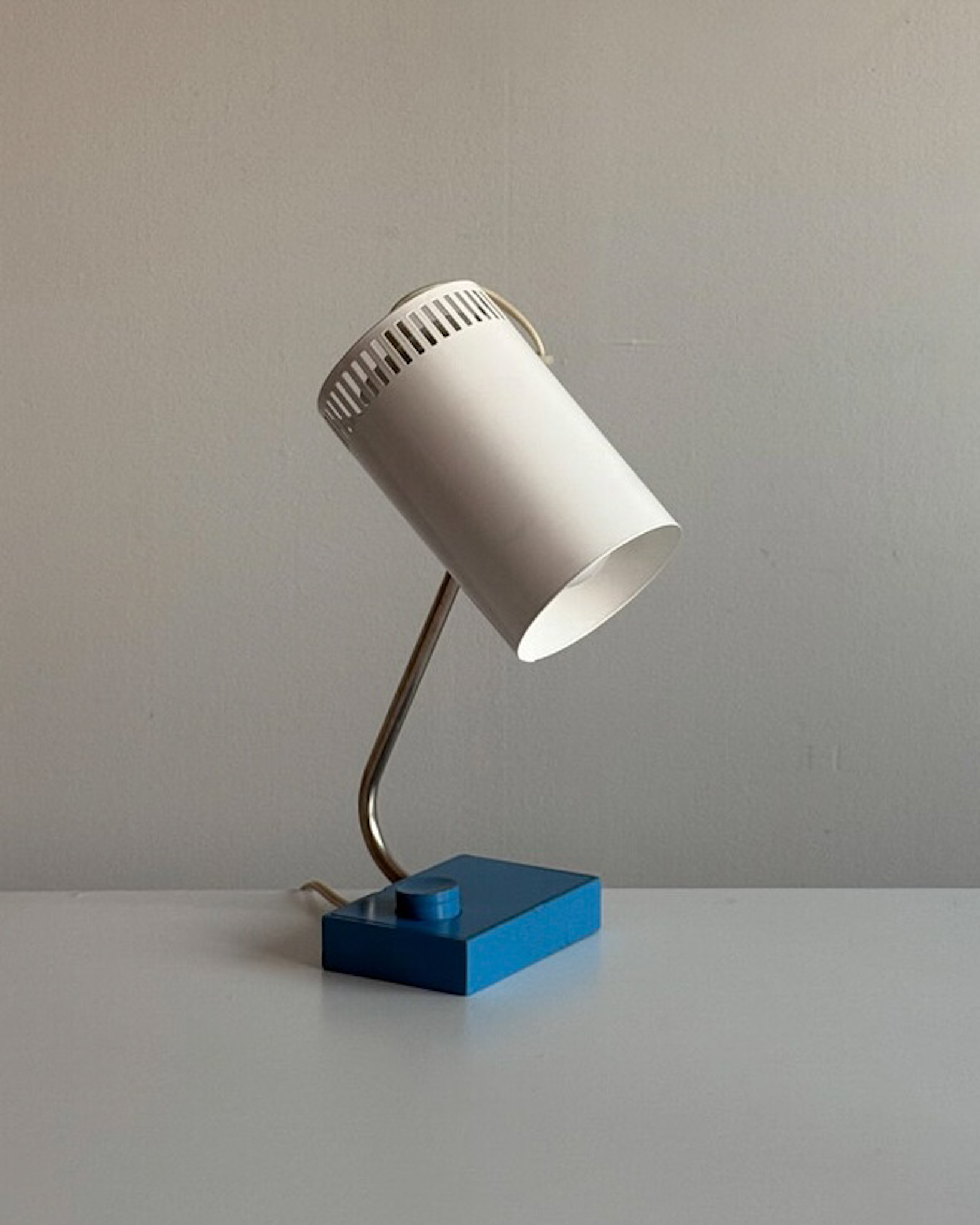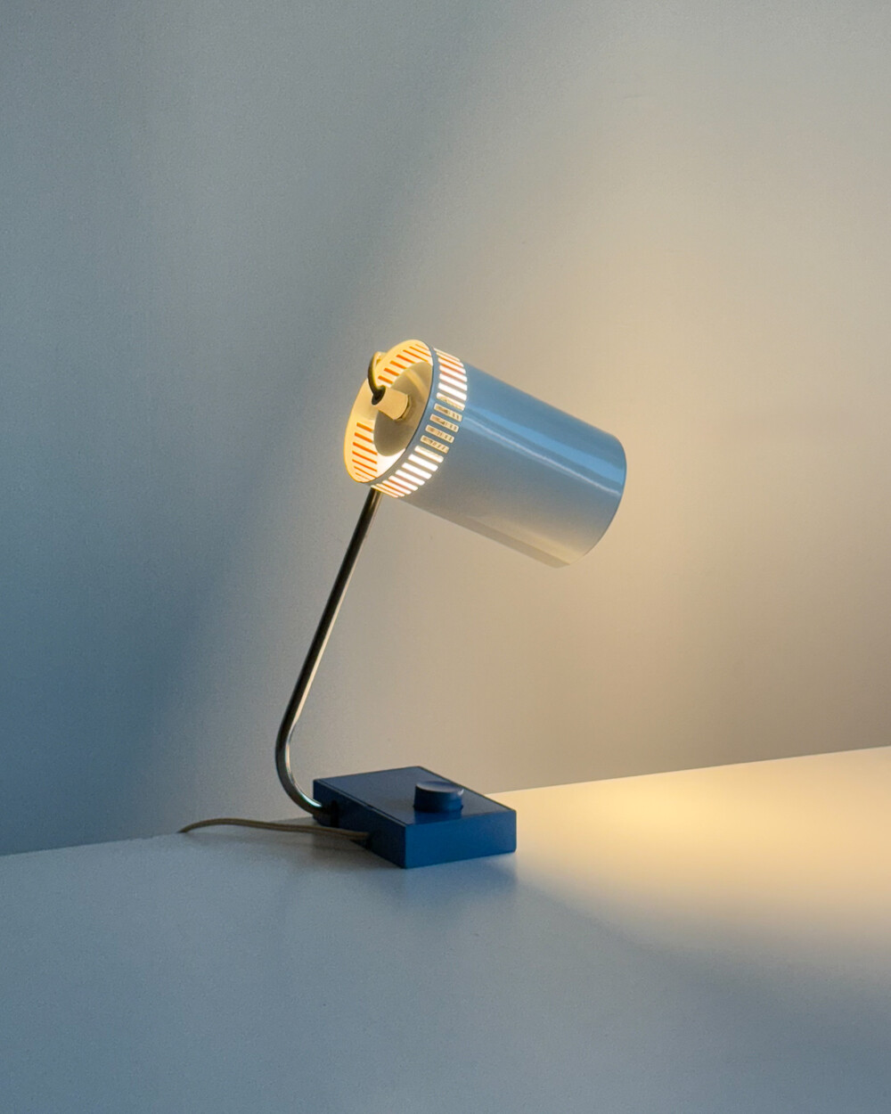1970년대 독일에서 제작된 빈티지 데스크 램프입니다. 원동형 헤드는 좌우 각도 조절이 가능하며, 하단으로 집중되는 직접 조명과 상단 슬롯 사이로 새어 나오는 빛이 공간에 부드러운 분위기를 더해줍니다.