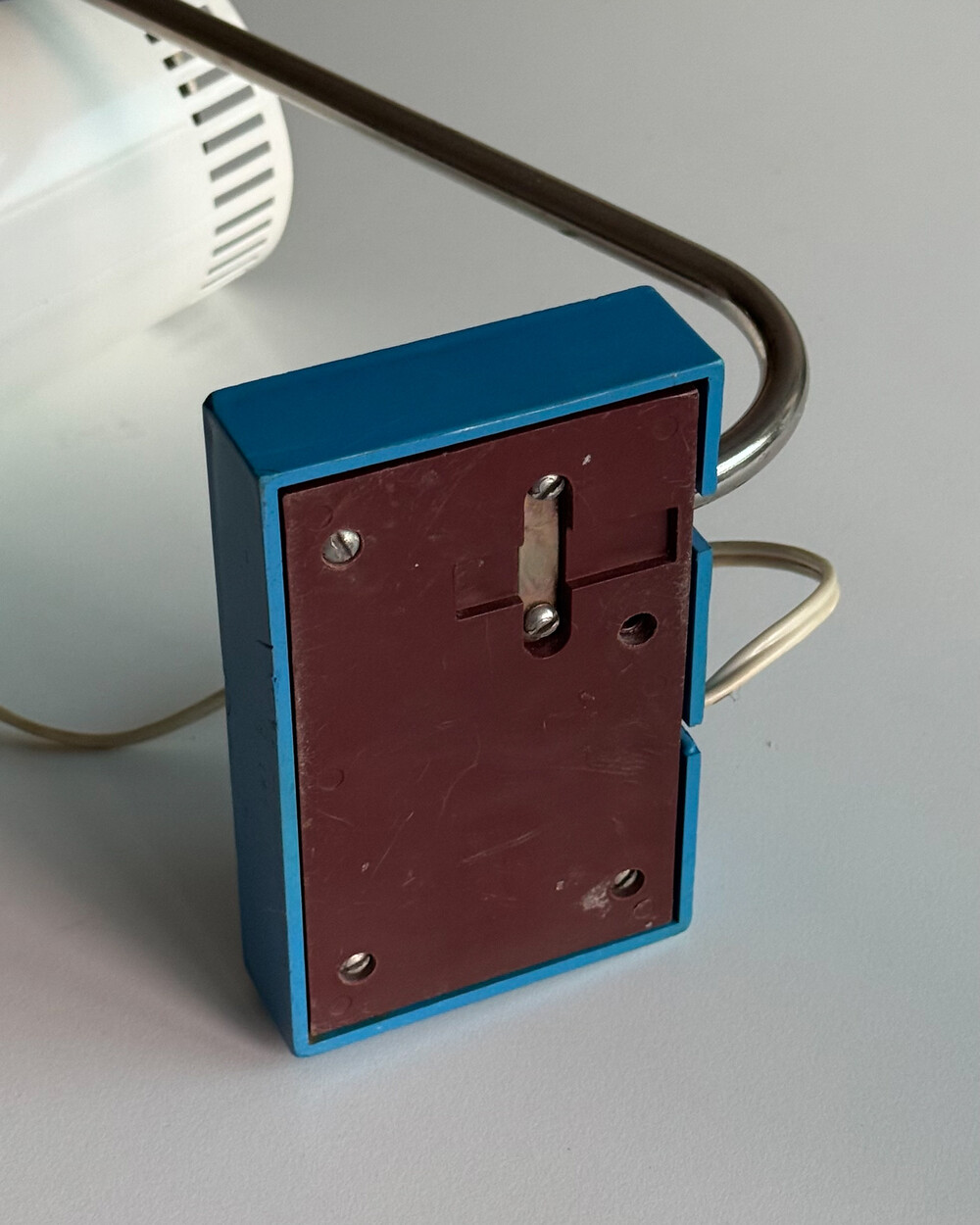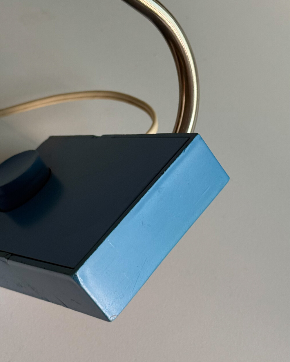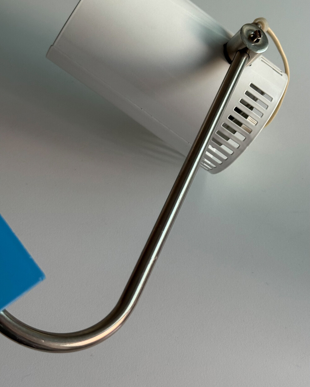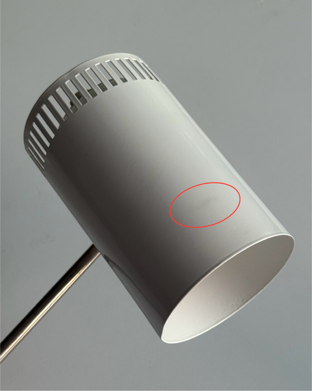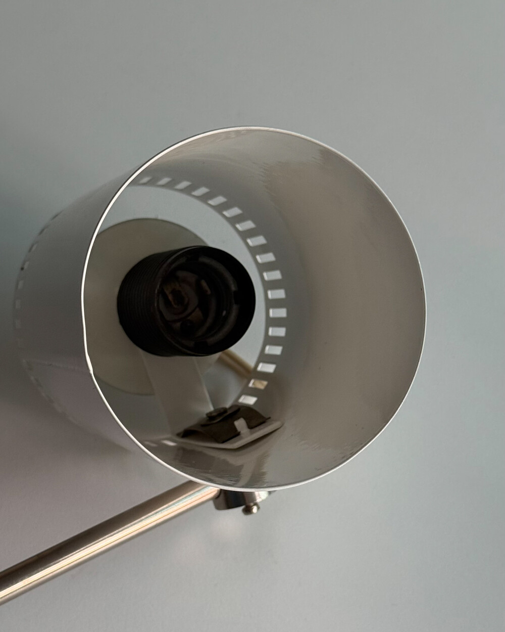 1970년대 독일에서 제작된 빈티지 데스크 램프입니다. 원동형 헤드는 좌우 각도 조절이 가능하며, 하단으로 집중되는 직접 조명과 상단 슬롯 사이로 새어 나오는 빛이 공간에 부드러운 분위기를 더해줍니다.