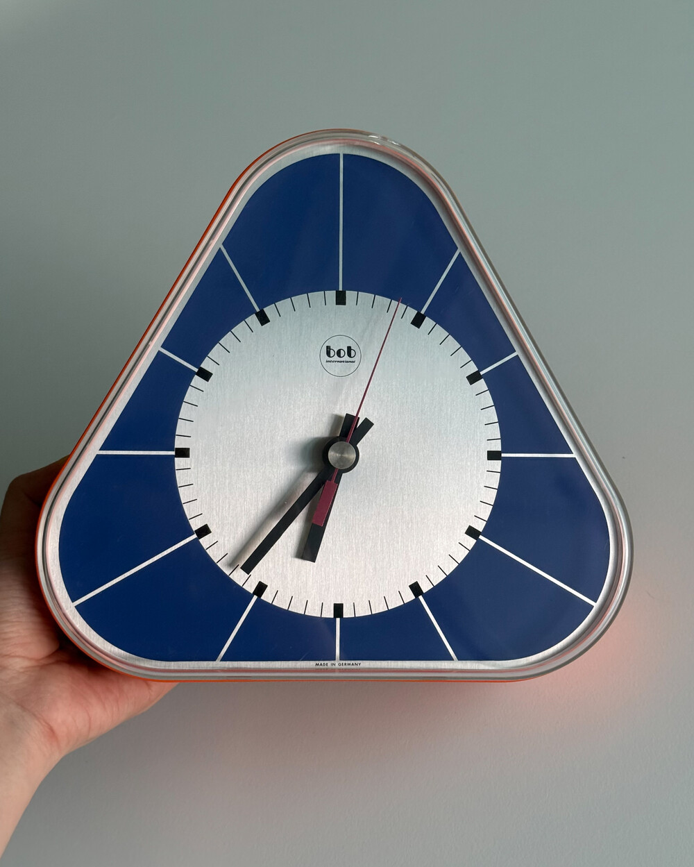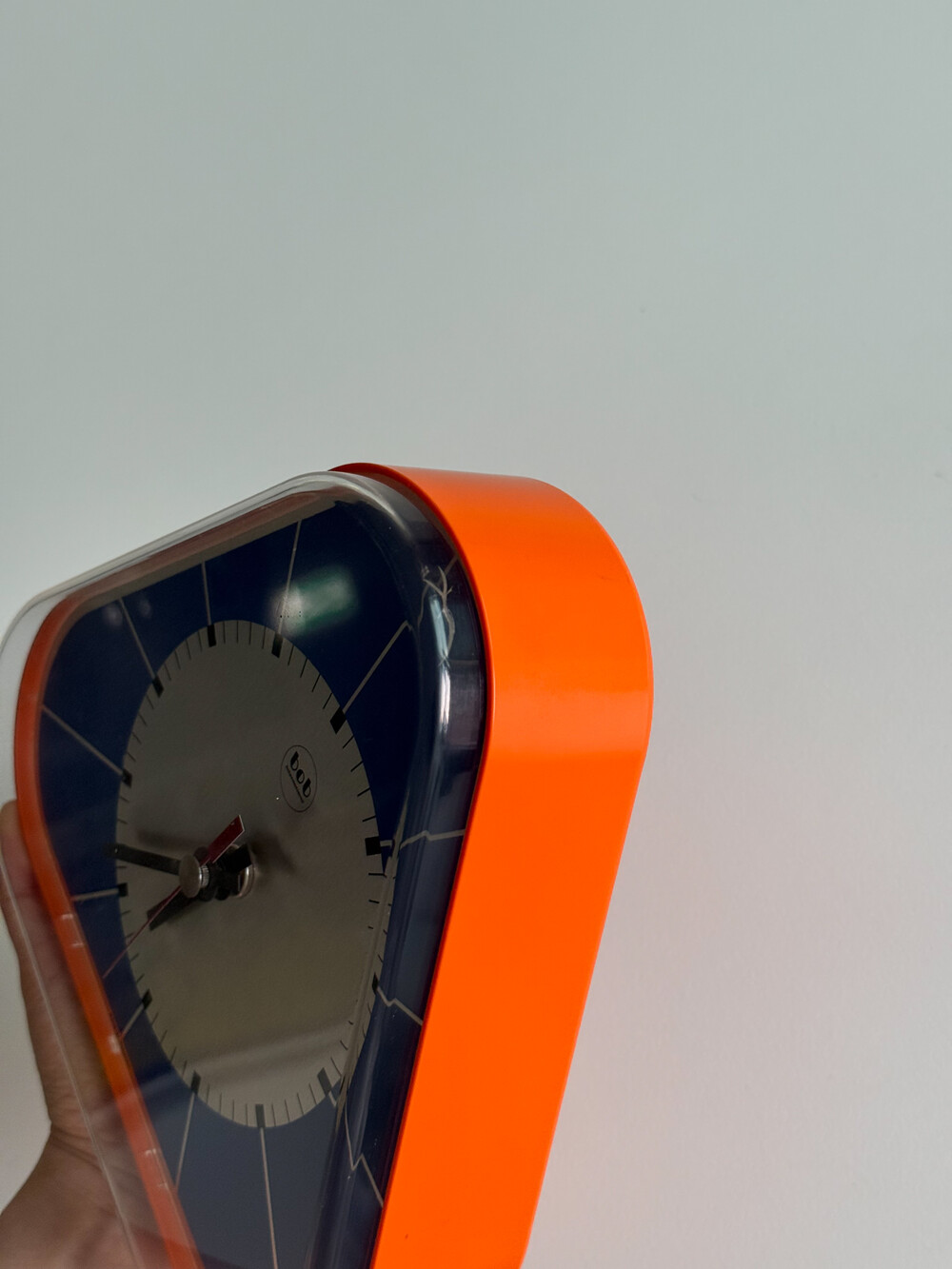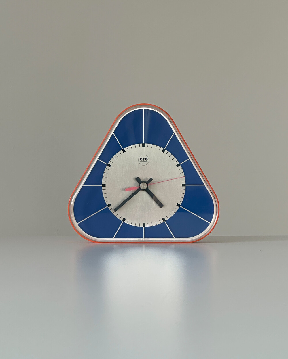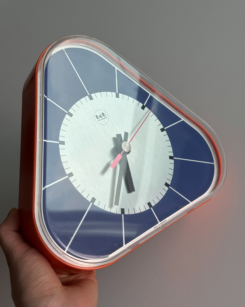 1970년대 독일 BOB International 사에서 제작된 벽시계 입니다. 입체감이 느껴지는 볼드한 삼각형 쉐입으로 이루어져 있으며, 스페이스 에이지 시대를 연상 시키는 오렌지-블루-실버의 색상 조화가 매력적인 디자인입니다. 보기 드문 레어한 제품으로 소장 가치가 있는 제품입니다.