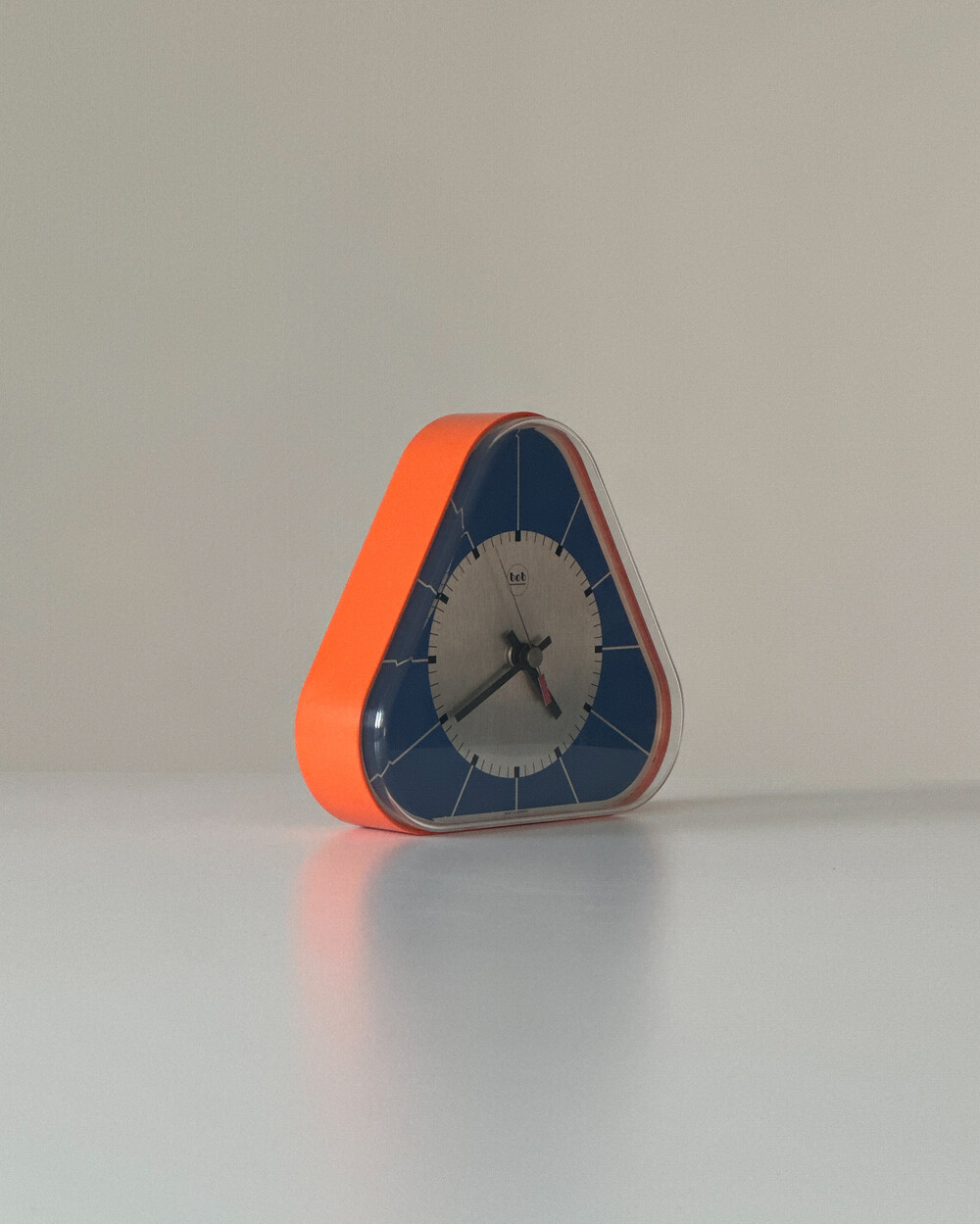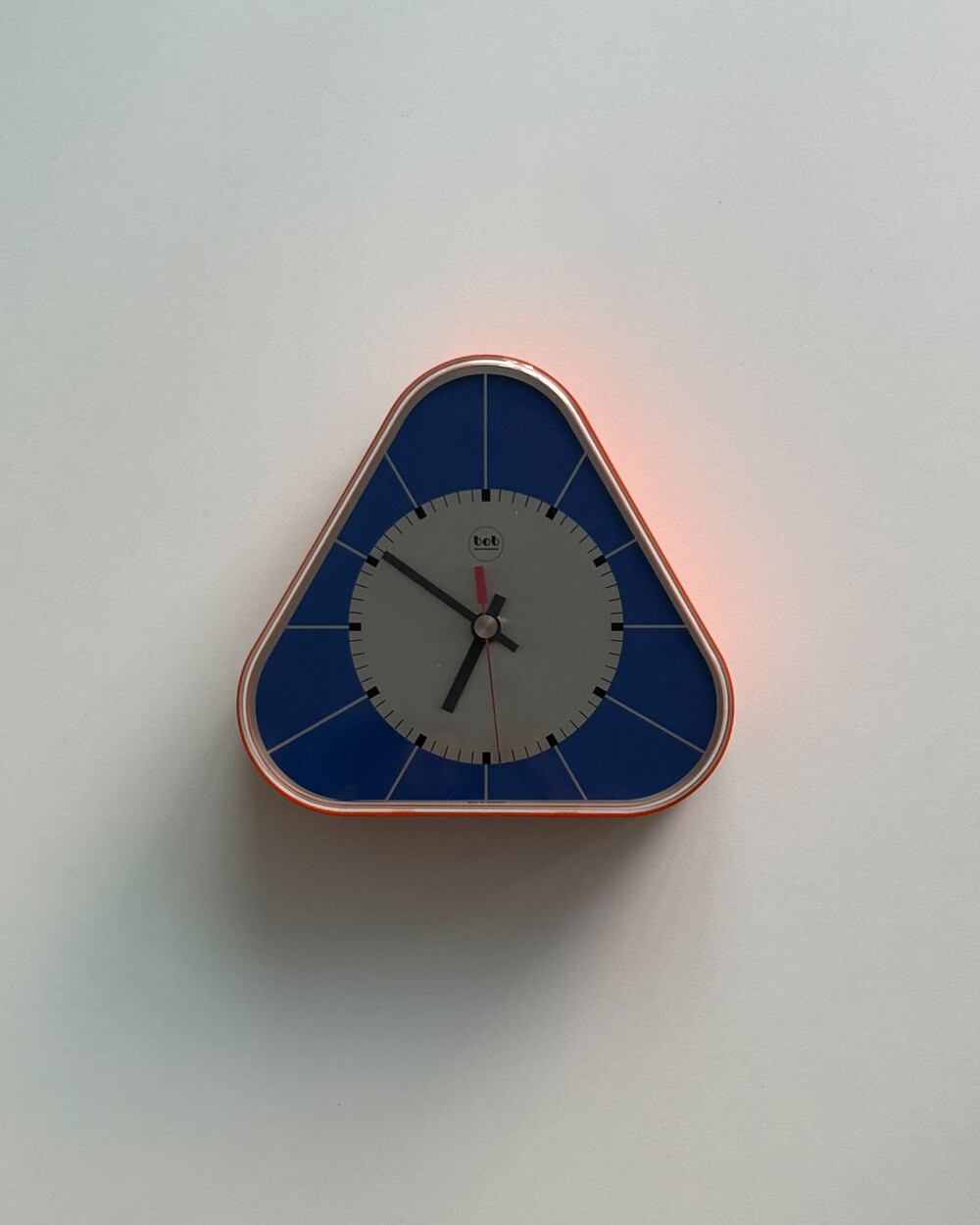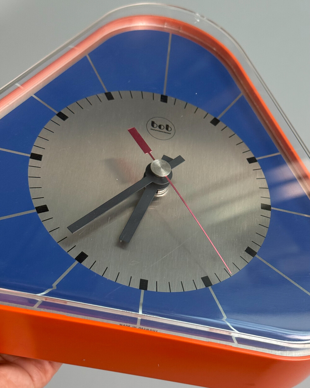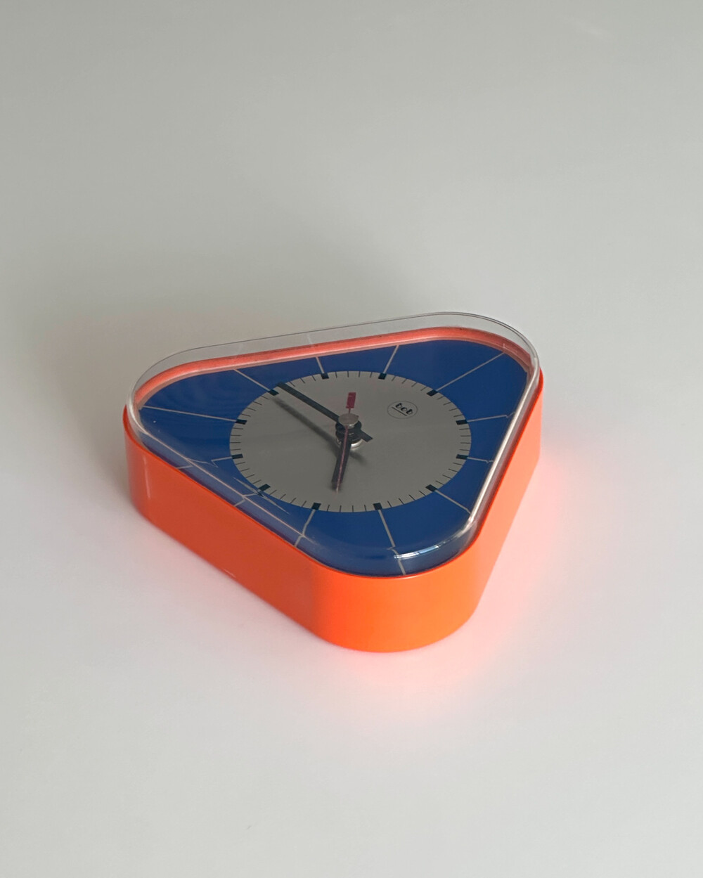 1970년대 독일 BOB International 사에서 제작된 벽시계 입니다. 입체감이 느껴지는 볼드한 삼각형 쉐입으로 이루어져 있으며, 스페이스 에이지 시대를 연상 시키는 오렌지-블루-실버의 색상 조화가 매력적인 디자인입니다. 보기 드문 레어한 제품으로 소장 가치가 있는 제품입니다.