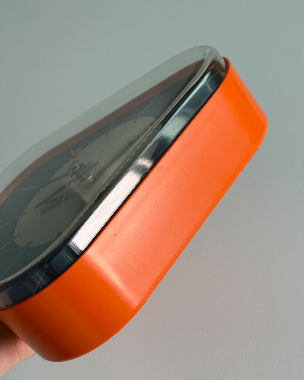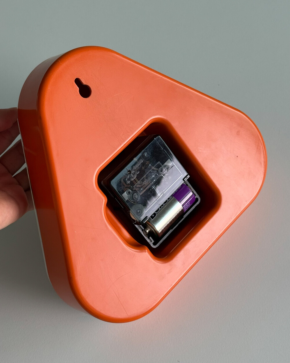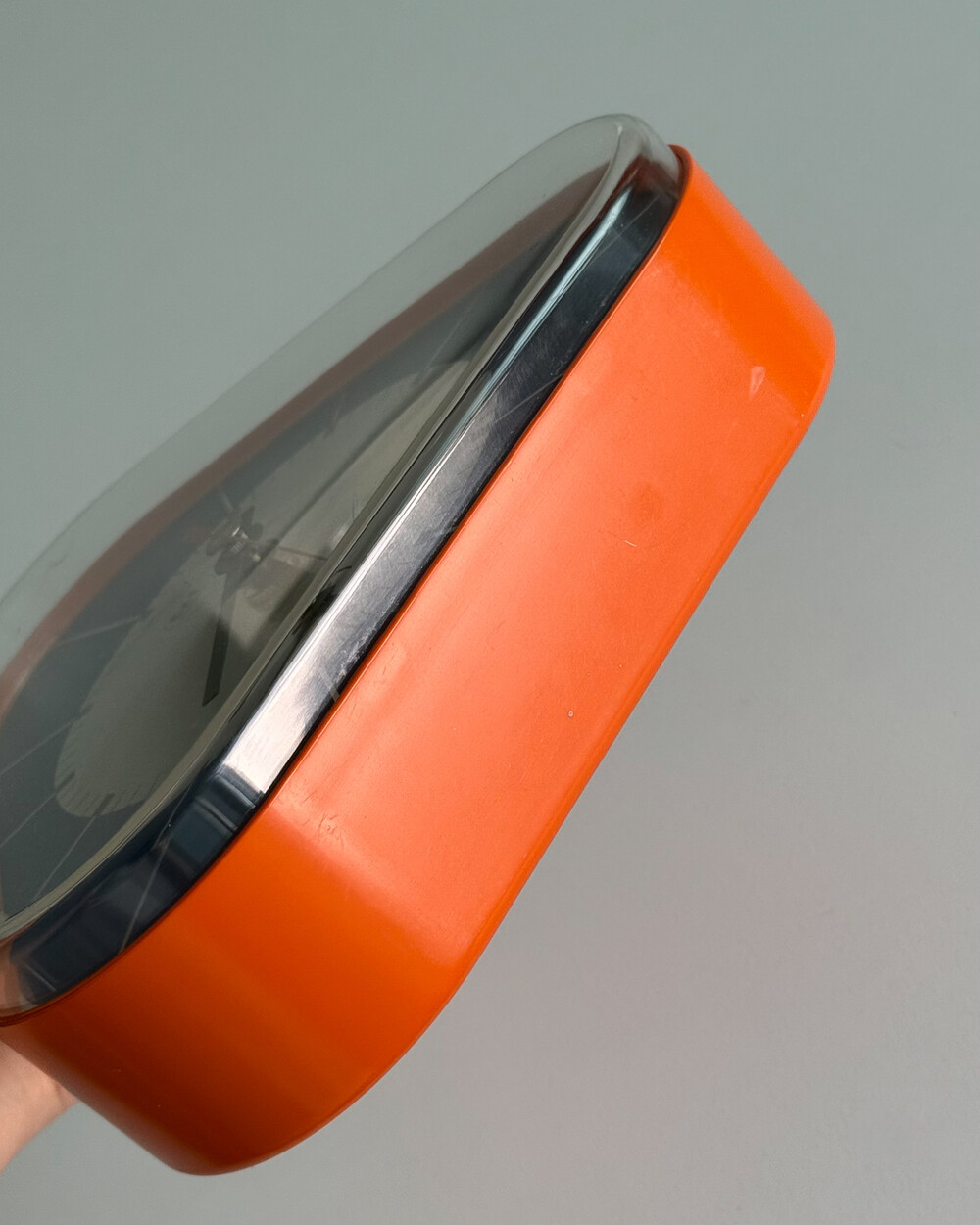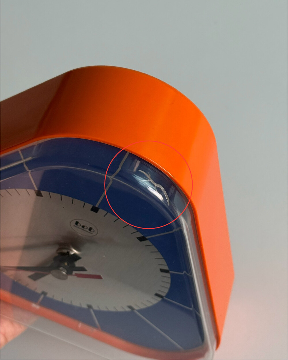 1970년대 독일 BOB International 사에서 제작된 벽시계 입니다. 입체감이 느껴지는 볼드한 삼각형 쉐입으로 이루어져 있으며, 스페이스 에이지 시대를 연상 시키는 오렌지-블루-실버의 색상 조화가 매력적인 디자인입니다. 보기 드문 레어한 제품으로 소장 가치가 있는 제품입니다.