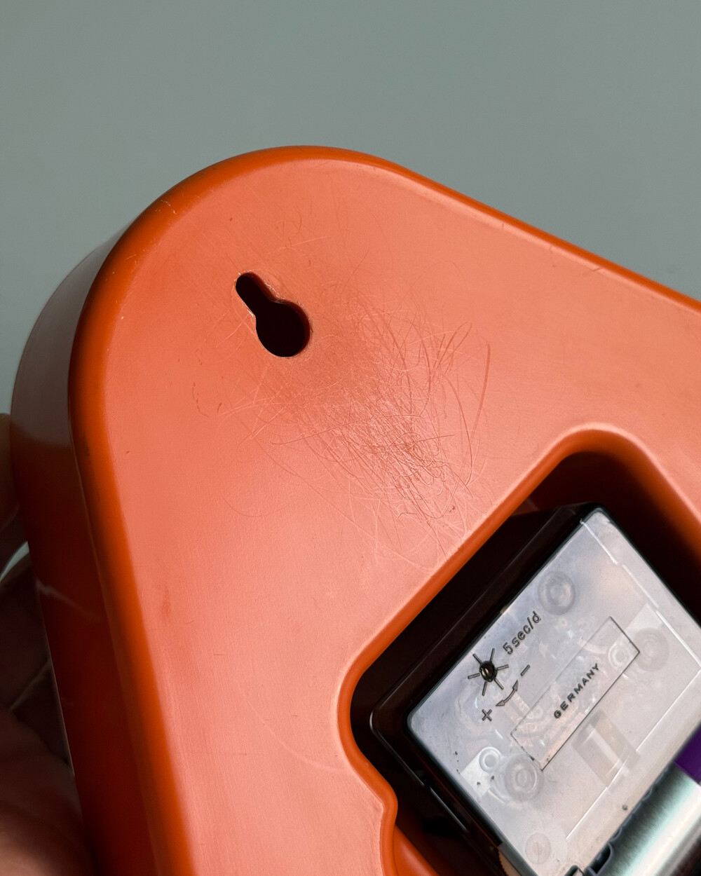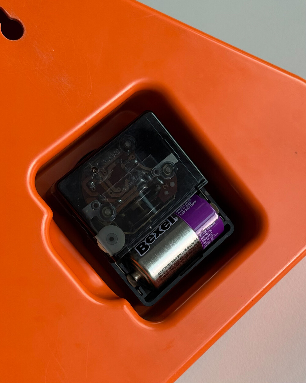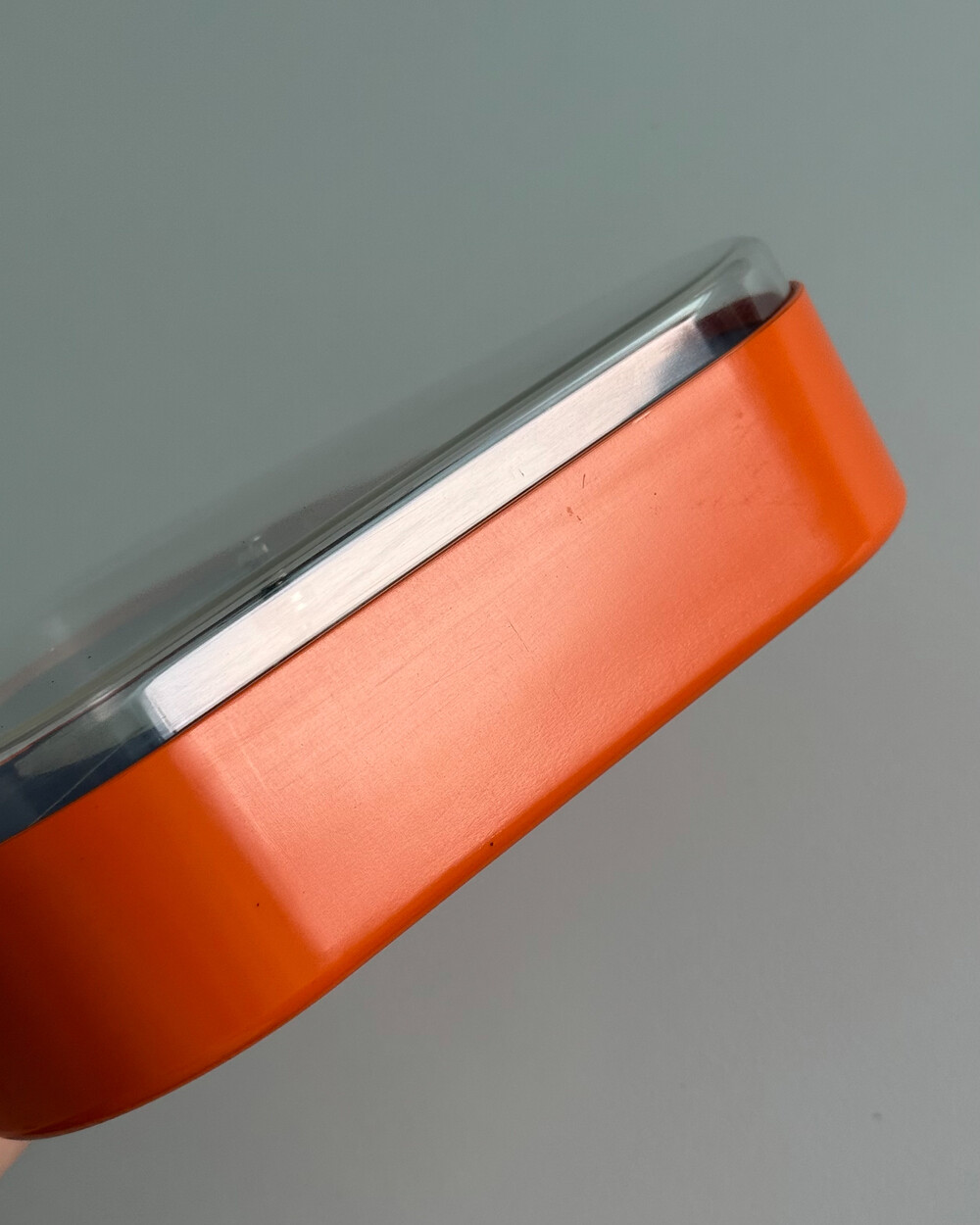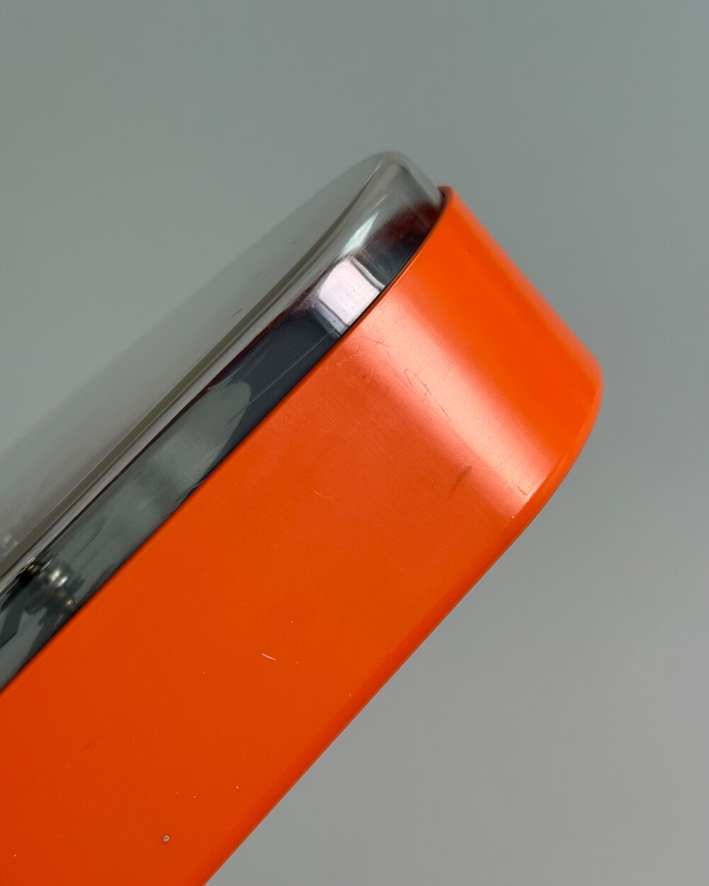 1970년대 독일 BOB International 사에서 제작된 벽시계 입니다. 입체감이 느껴지는 볼드한 삼각형 쉐입으로 이루어져 있으며, 스페이스 에이지 시대를 연상 시키는 오렌지-블루-실버의 색상 조화가 매력적인 디자인입니다. 보기 드문 레어한 제품으로 소장 가치가 있는 제품입니다.