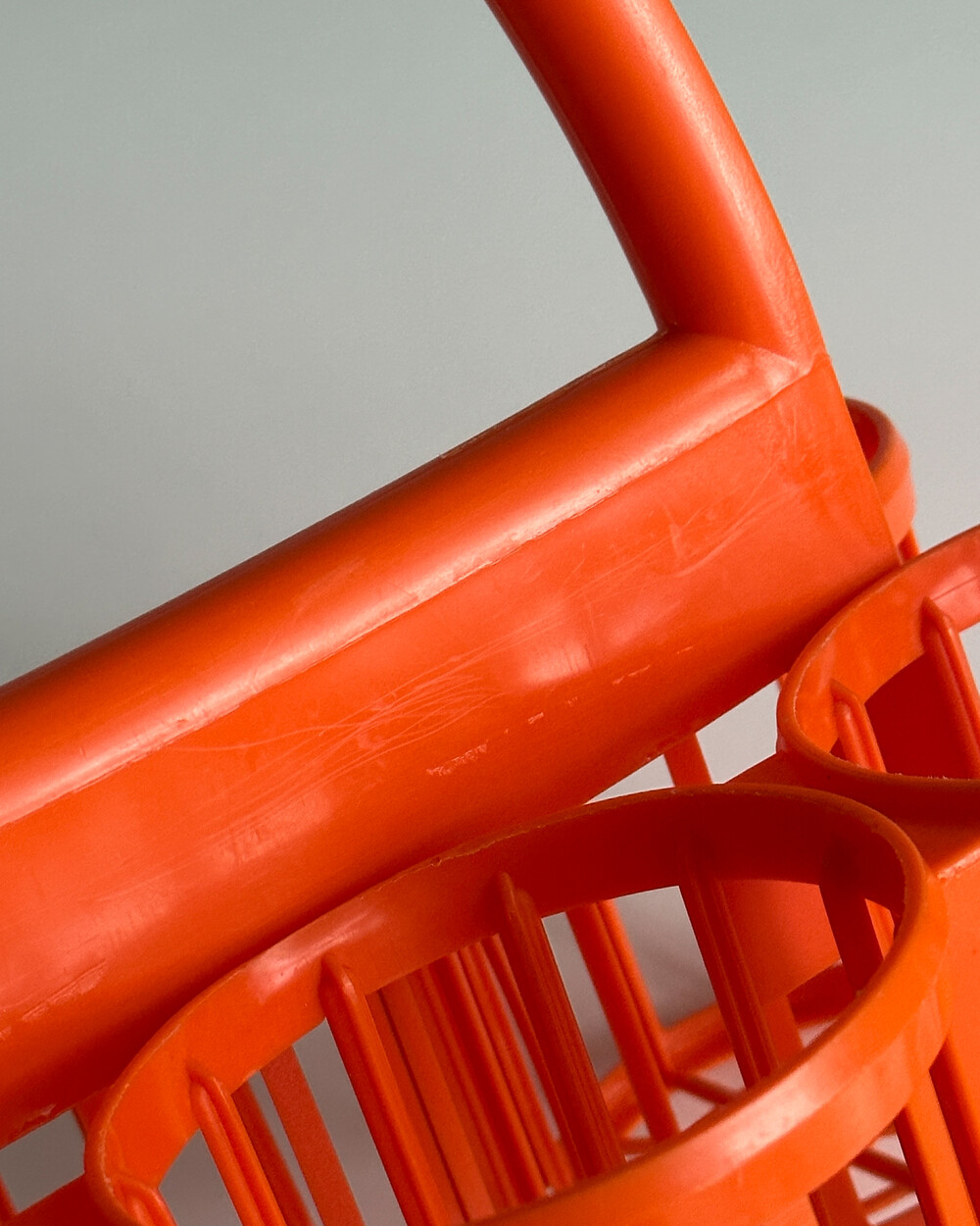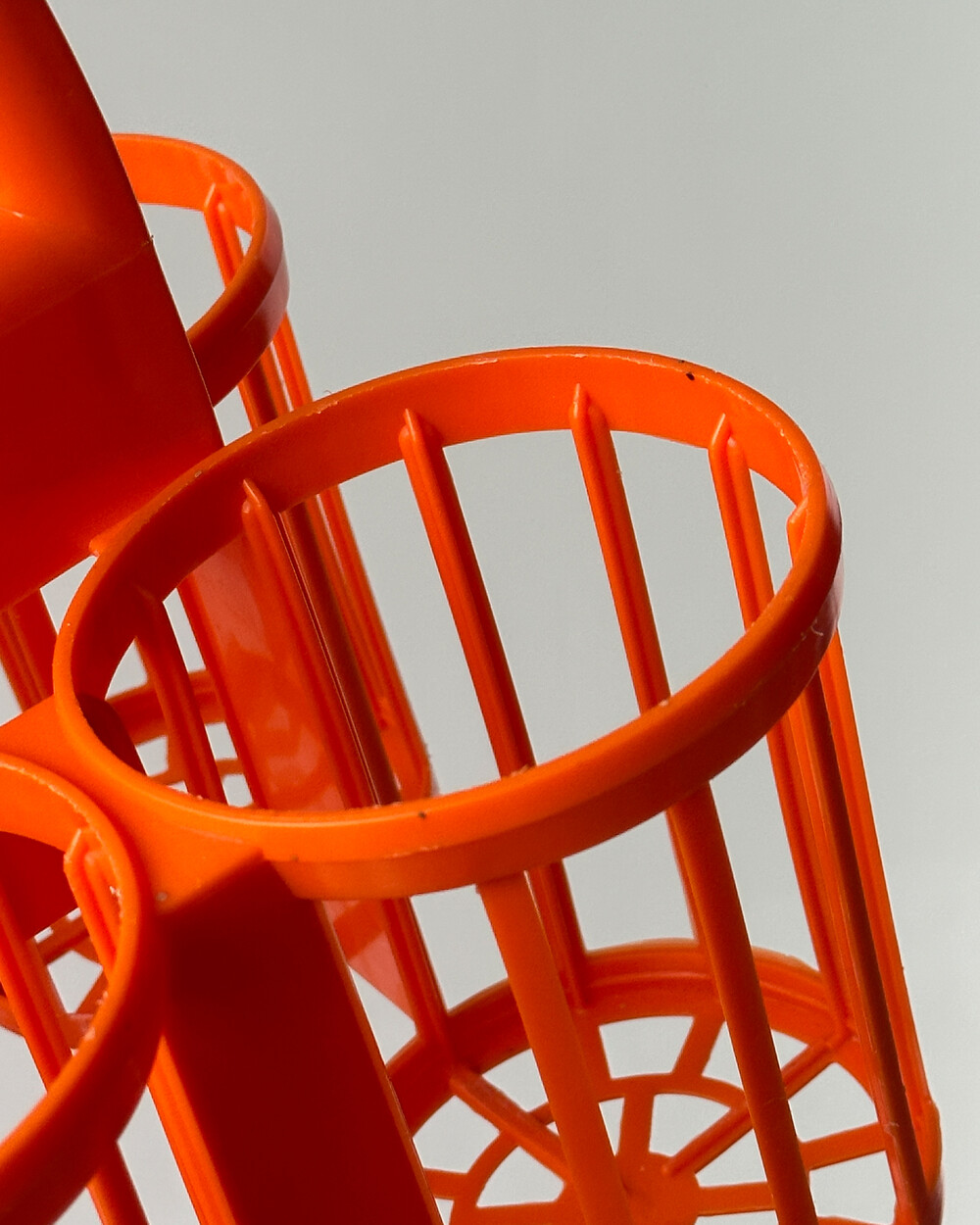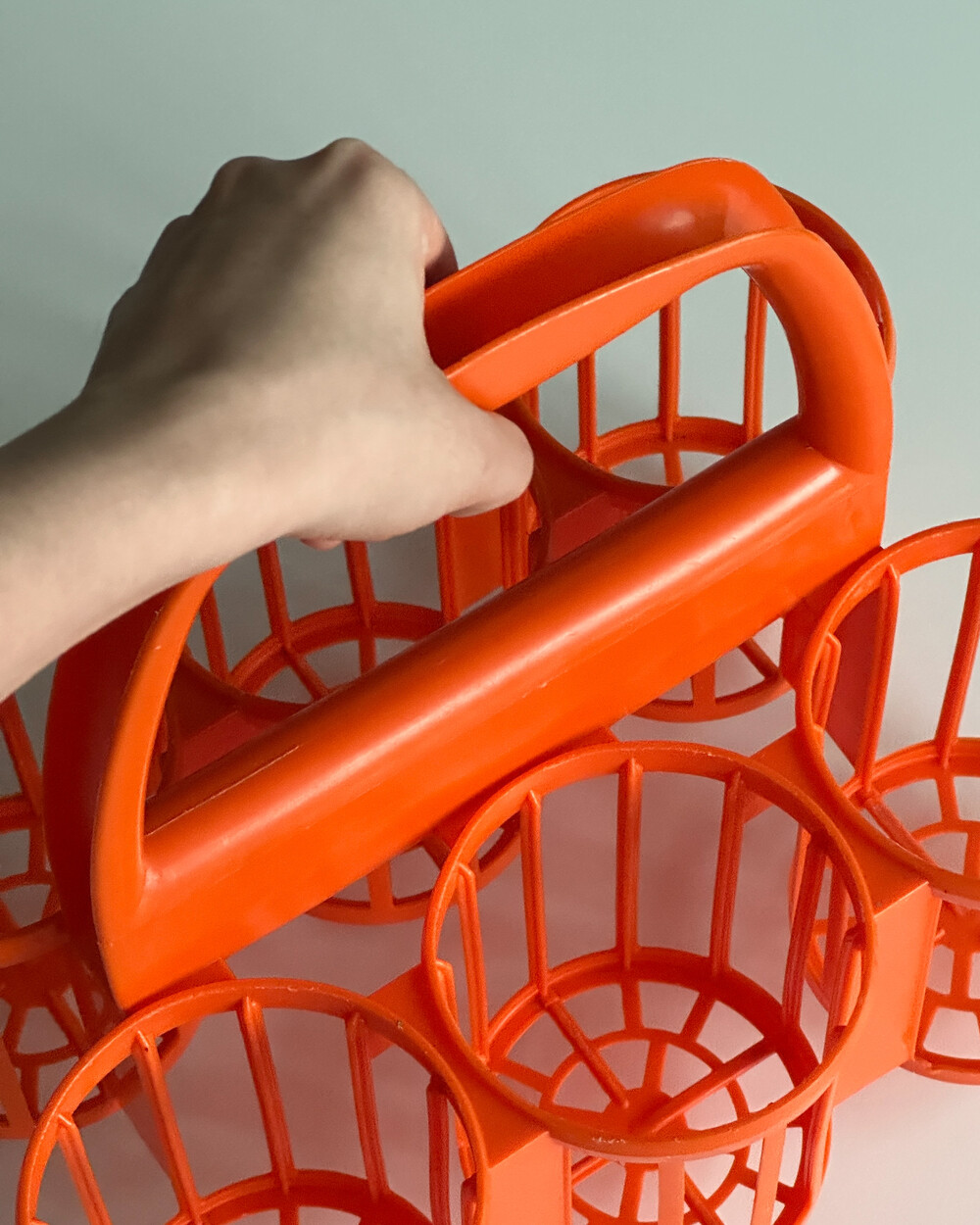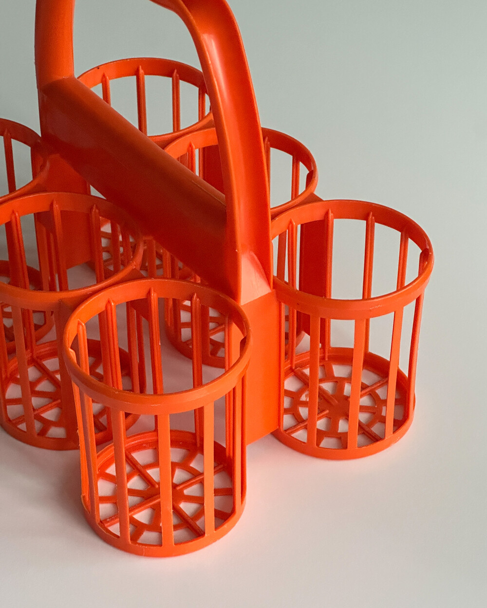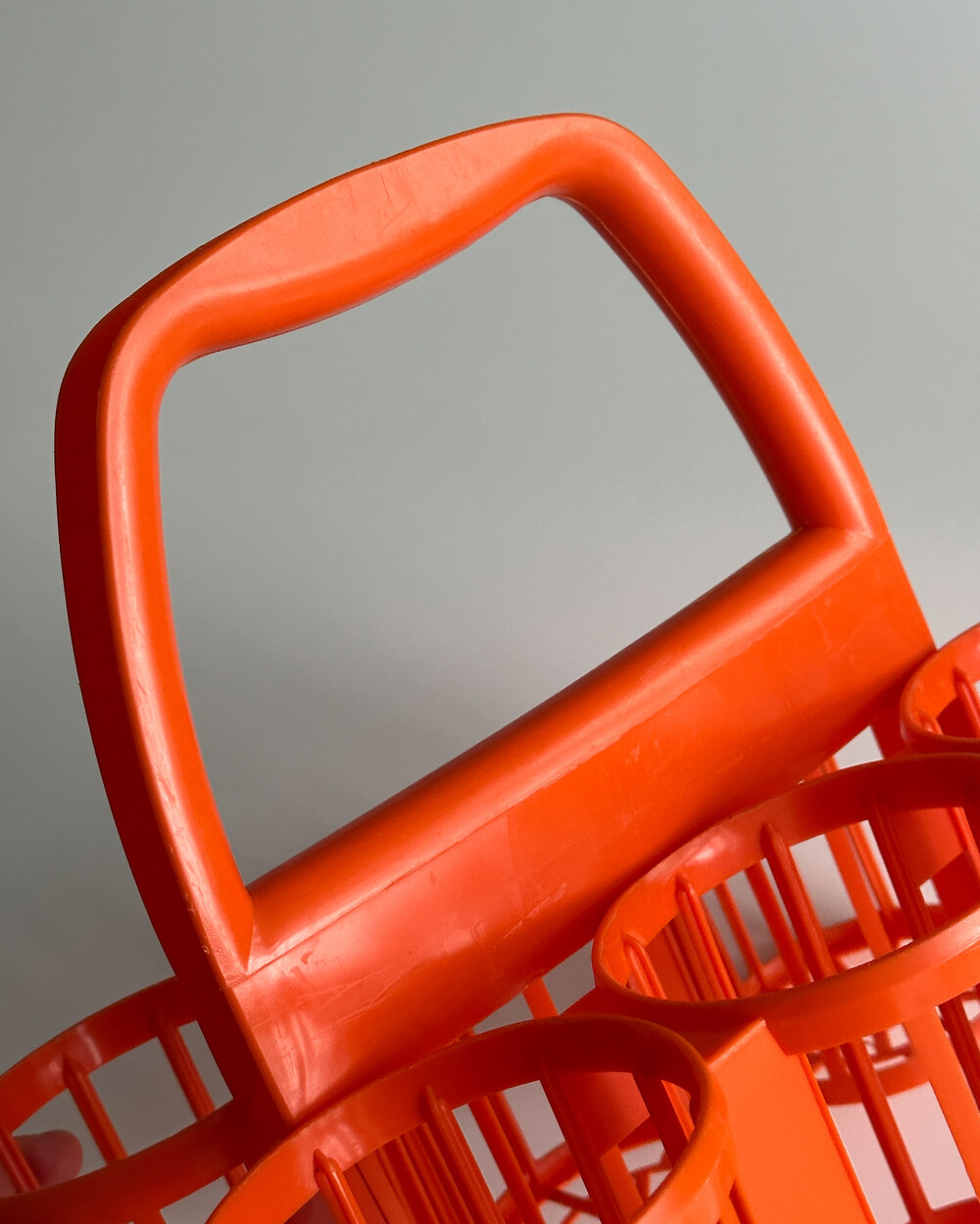 60년도 생산되었던 빈티지 보틀 홀더입니다. 오렌지 컬러의 플라스틱 소재로 이루어져 있으며, 최대 6개의 보틀을 수납할 수 있습니다. 포인트 소품으로 활용하기에도 좋은 아이템입니다.