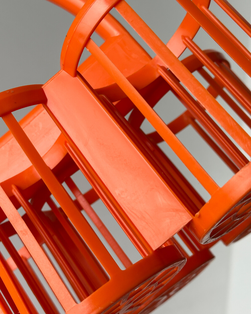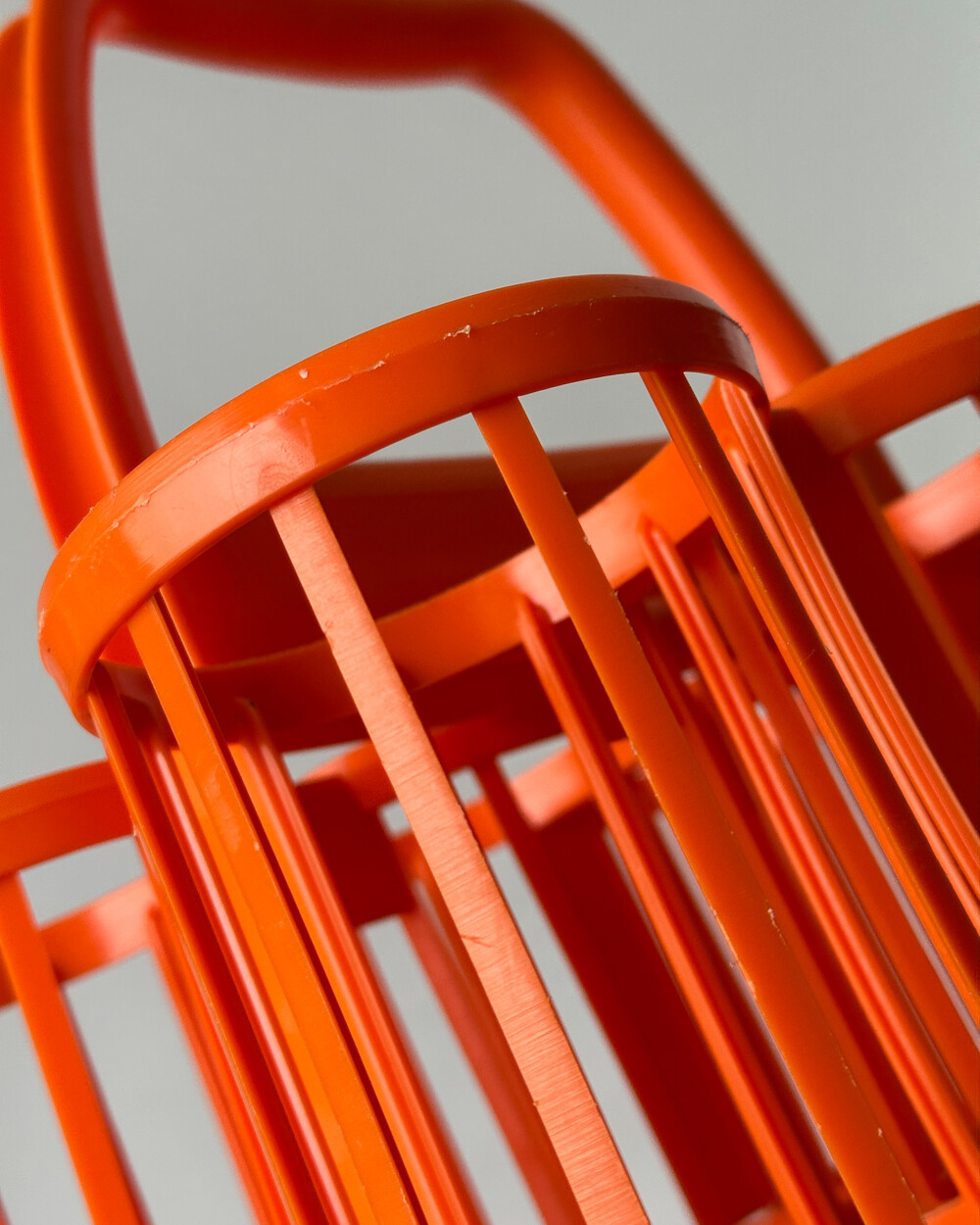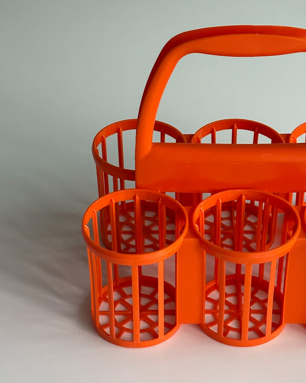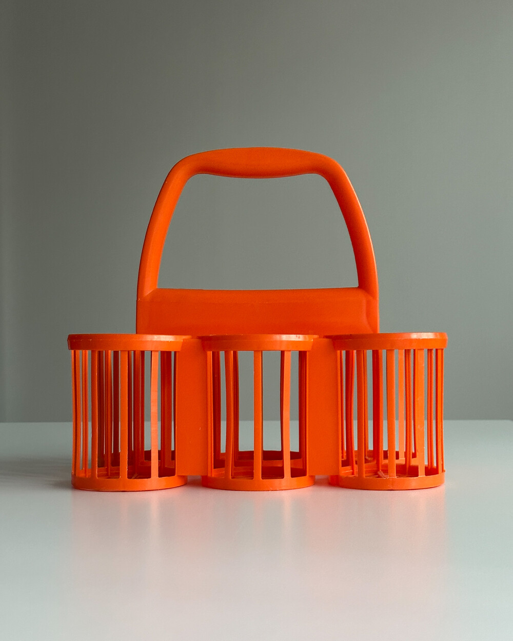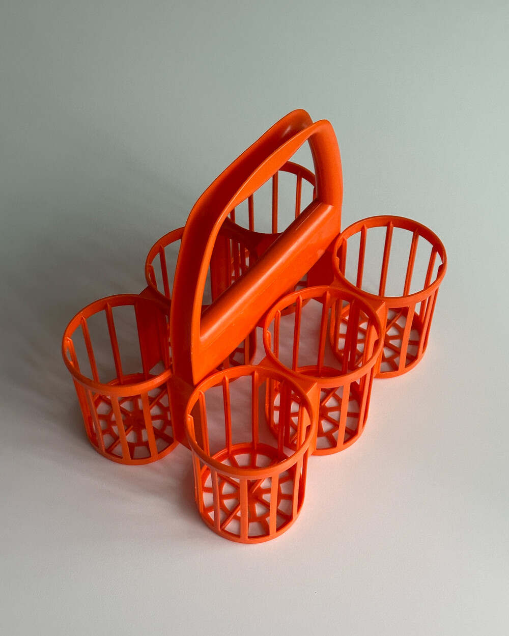 60년도 생산되었던 빈티지 보틀 홀더입니다. 오렌지 컬러의 플라스틱 소재로 이루어져 있으며, 최대 6개의 보틀을 수납할 수 있습니다. 포인트 소품으로 활용하기에도 좋은 아이템입니다.