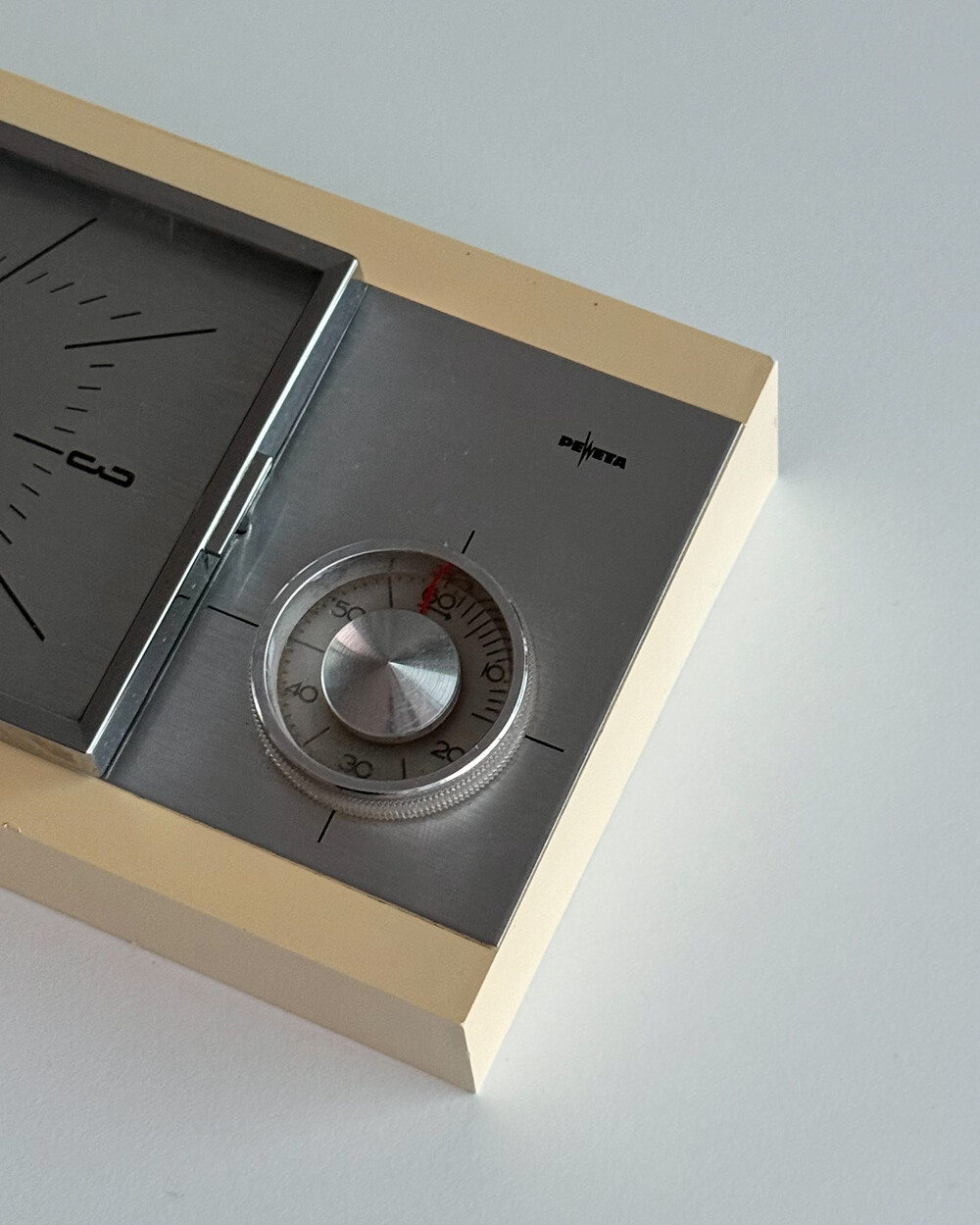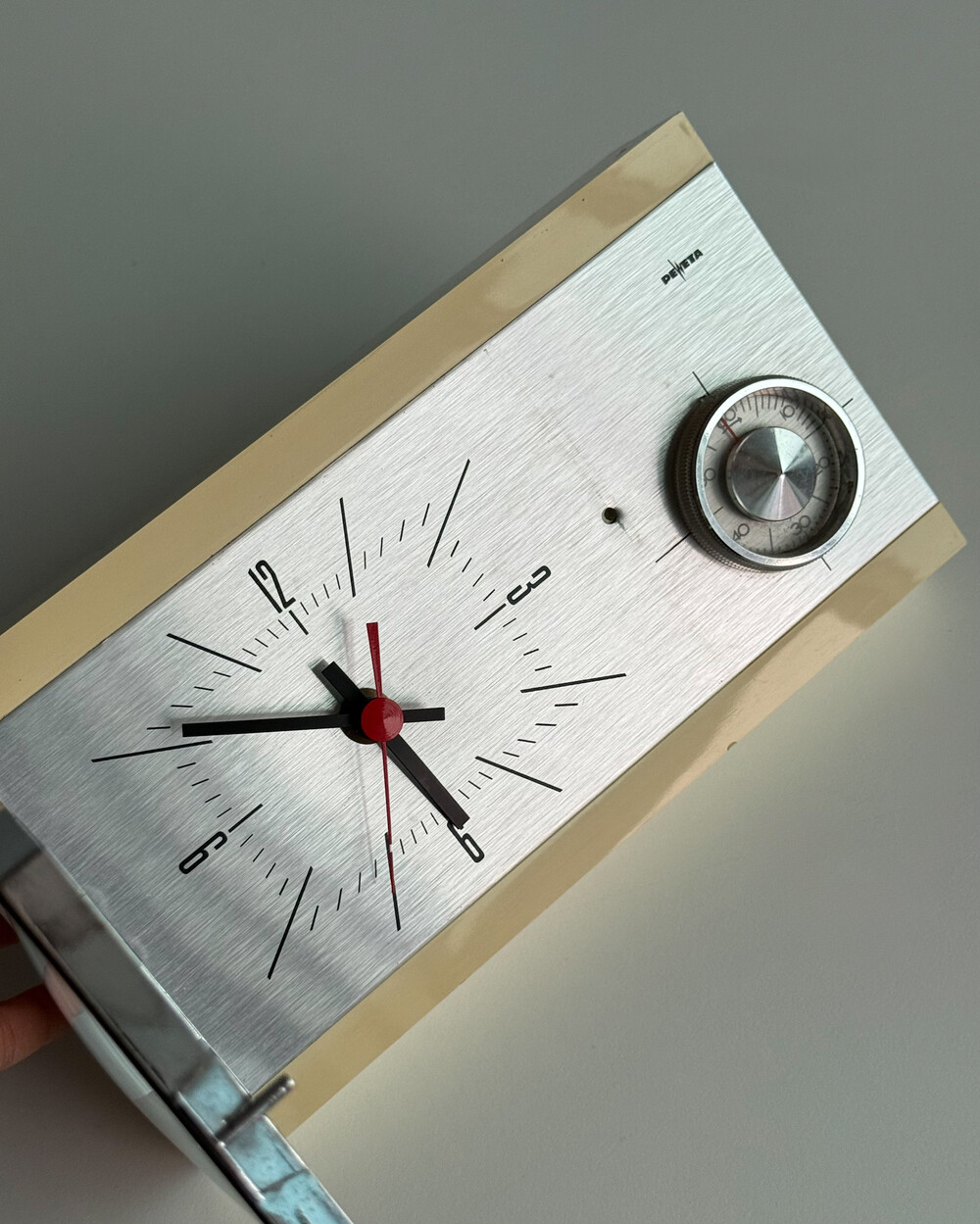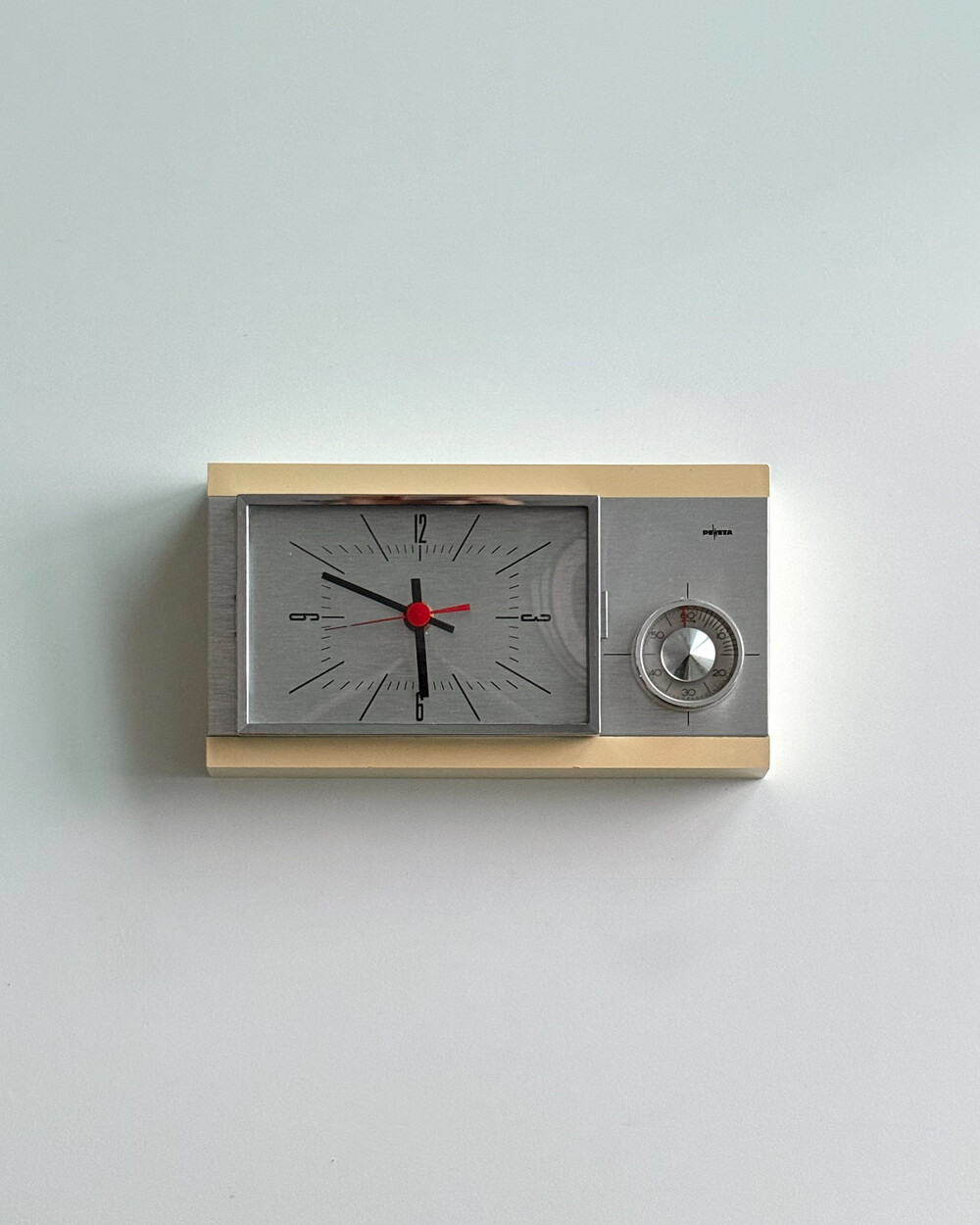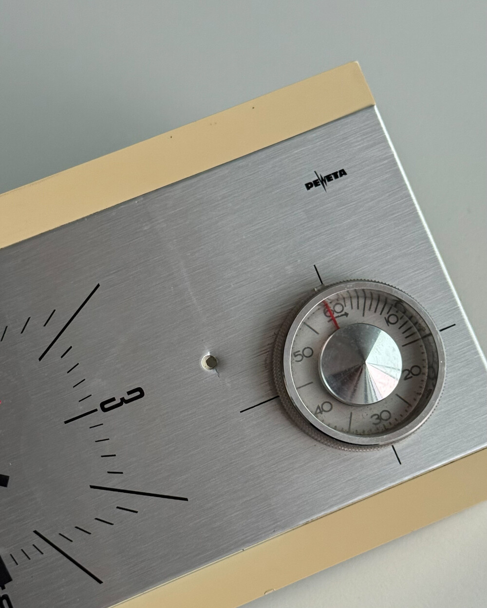 70년도 독일 PEWETA사에서 생산된 빈티지 벽 시계입니다. 직사각형 프레임의 태닝된 크림 베이스와 매탈릭한 실버 패널로 이루어진 매력적인 디자인입니다. 우측 하단에는 주방에서 활용도 있게 사용할 수 있는 60분 타이머가 달려있습니다.