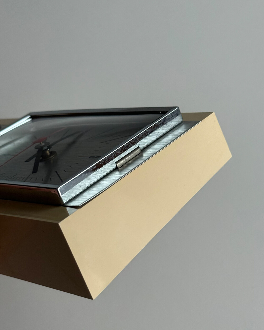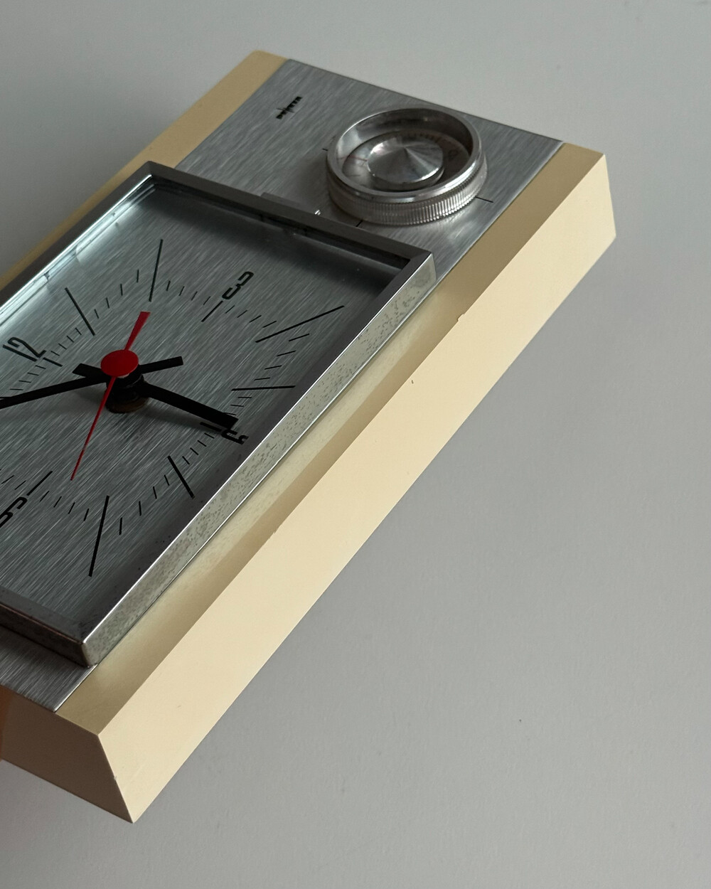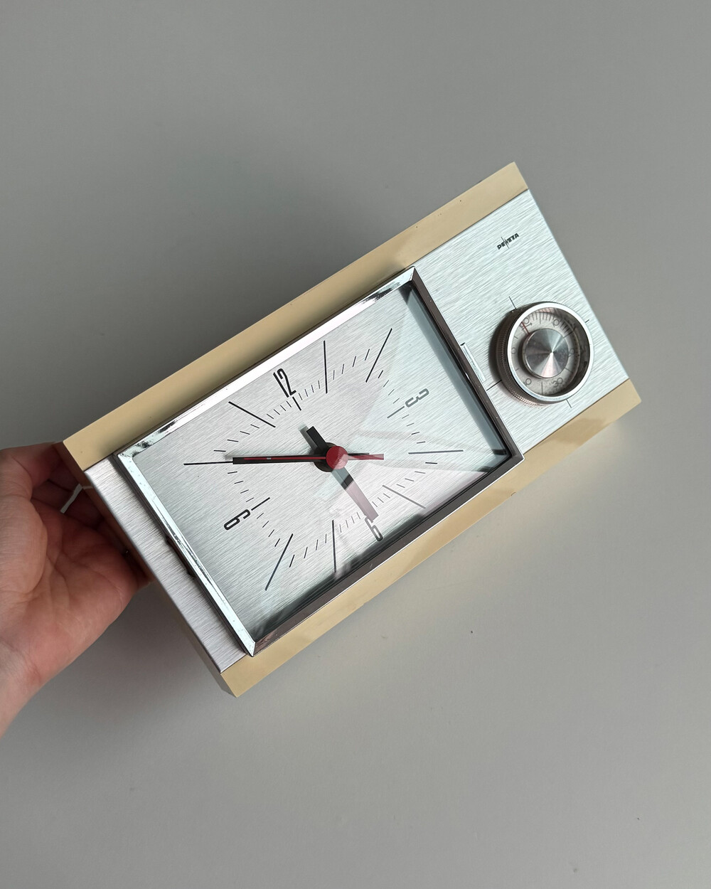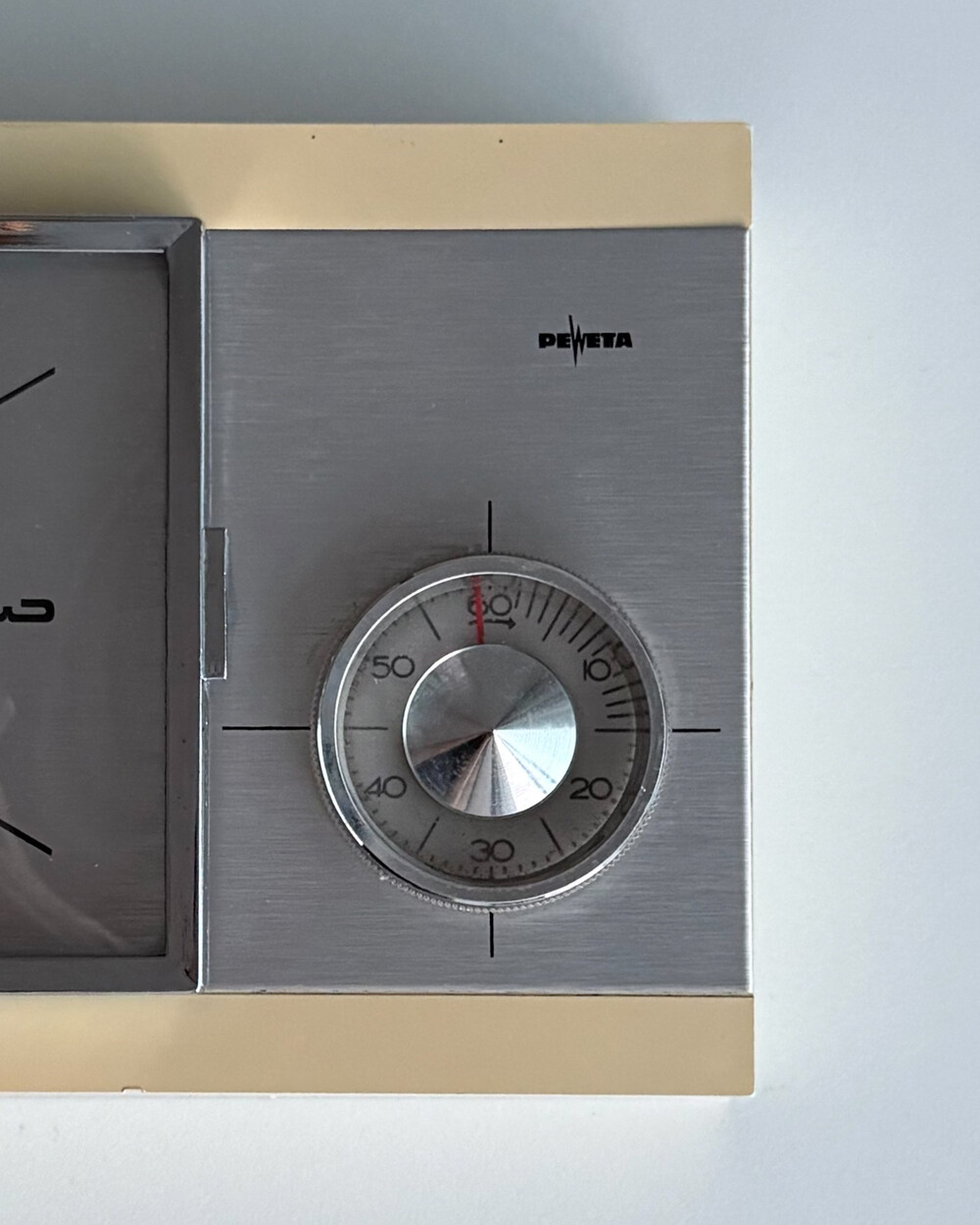 70년도 독일 PEWETA사에서 생산된 빈티지 벽 시계입니다. 직사각형 프레임의 태닝된 크림 베이스와 매탈릭한 실버 패널로 이루어진 매력적인 디자인입니다. 우측 하단에는 주방에서 활용도 있게 사용할 수 있는 60분 타이머가 달려있습니다.
