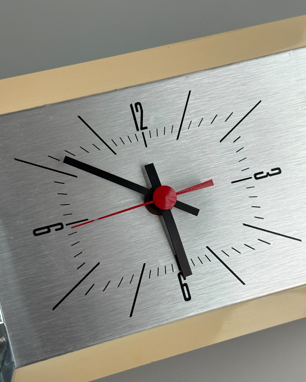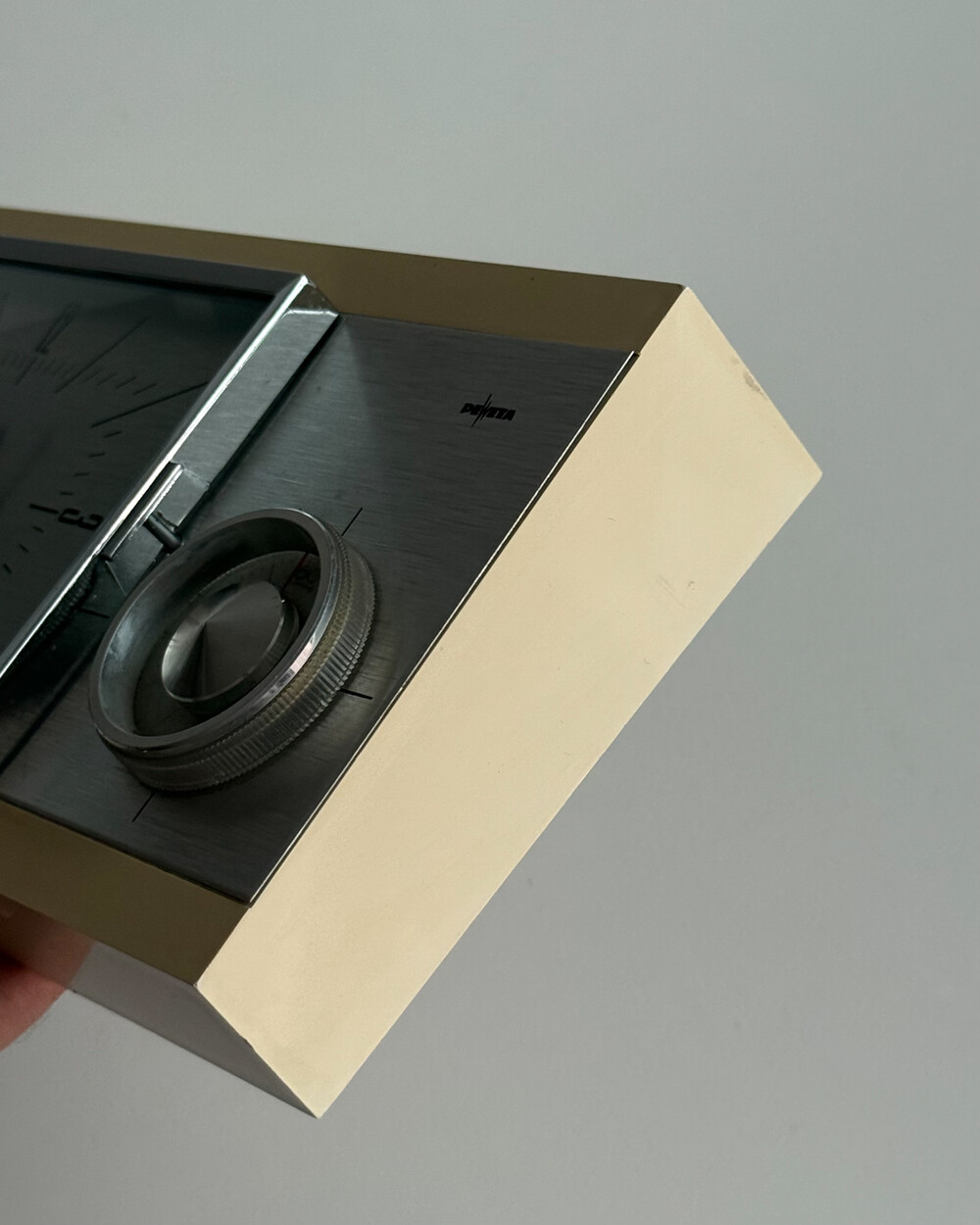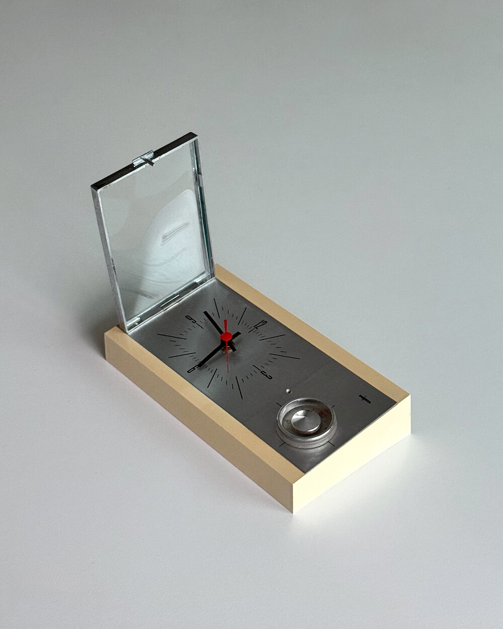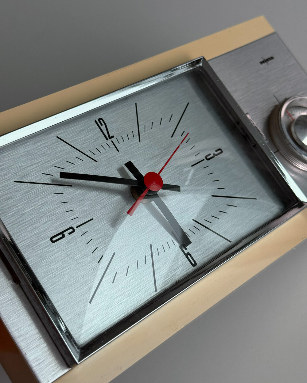 70년도 독일 PEWETA사에서 생산된 빈티지 벽 시계입니다. 직사각형 프레임의 태닝된 크림 베이스와 매탈릭한 실버 패널로 이루어진 매력적인 디자인입니다. 우측 하단에는 주방에서 활용도 있게 사용할 수 있는 60분 타이머가 달려있습니다.