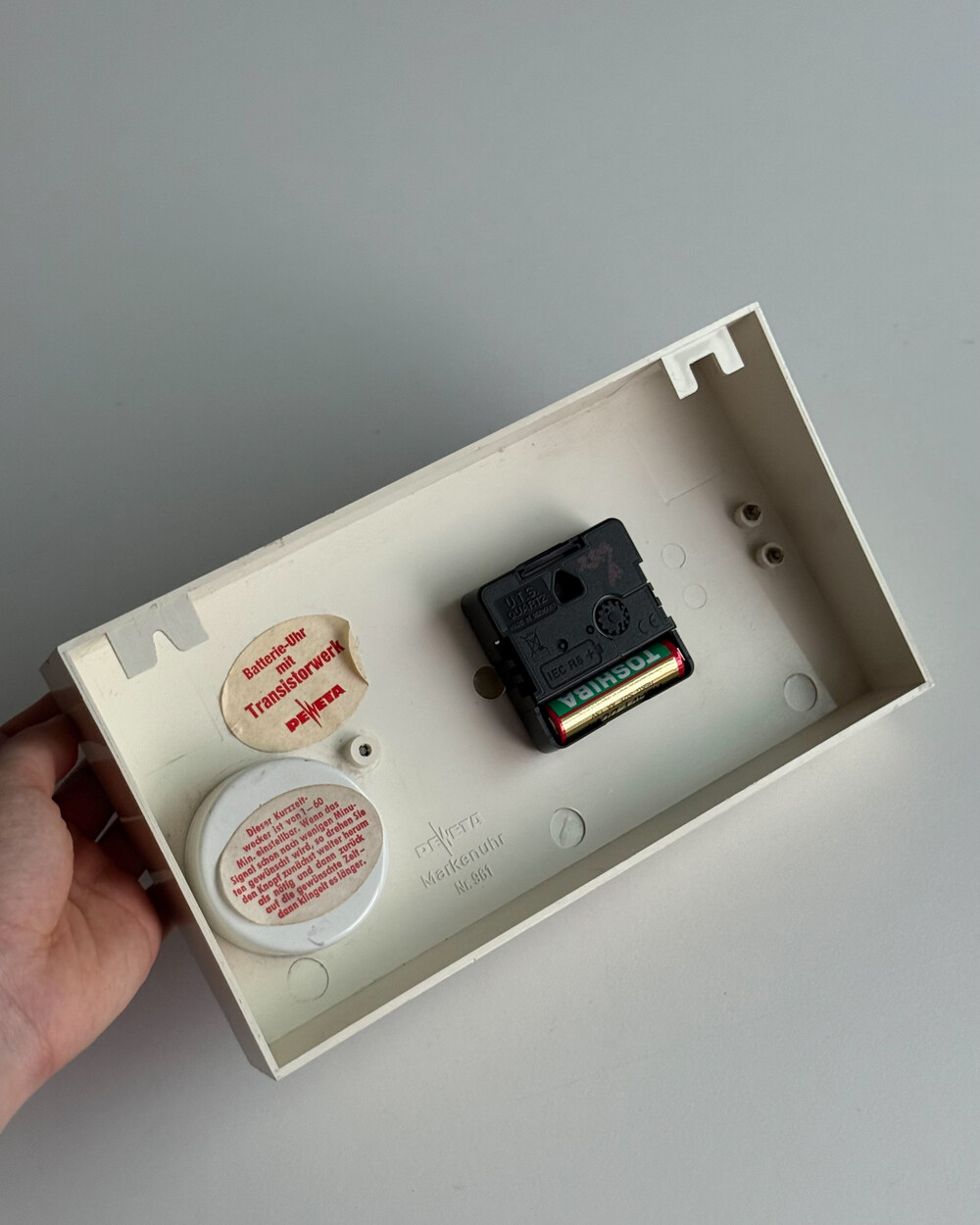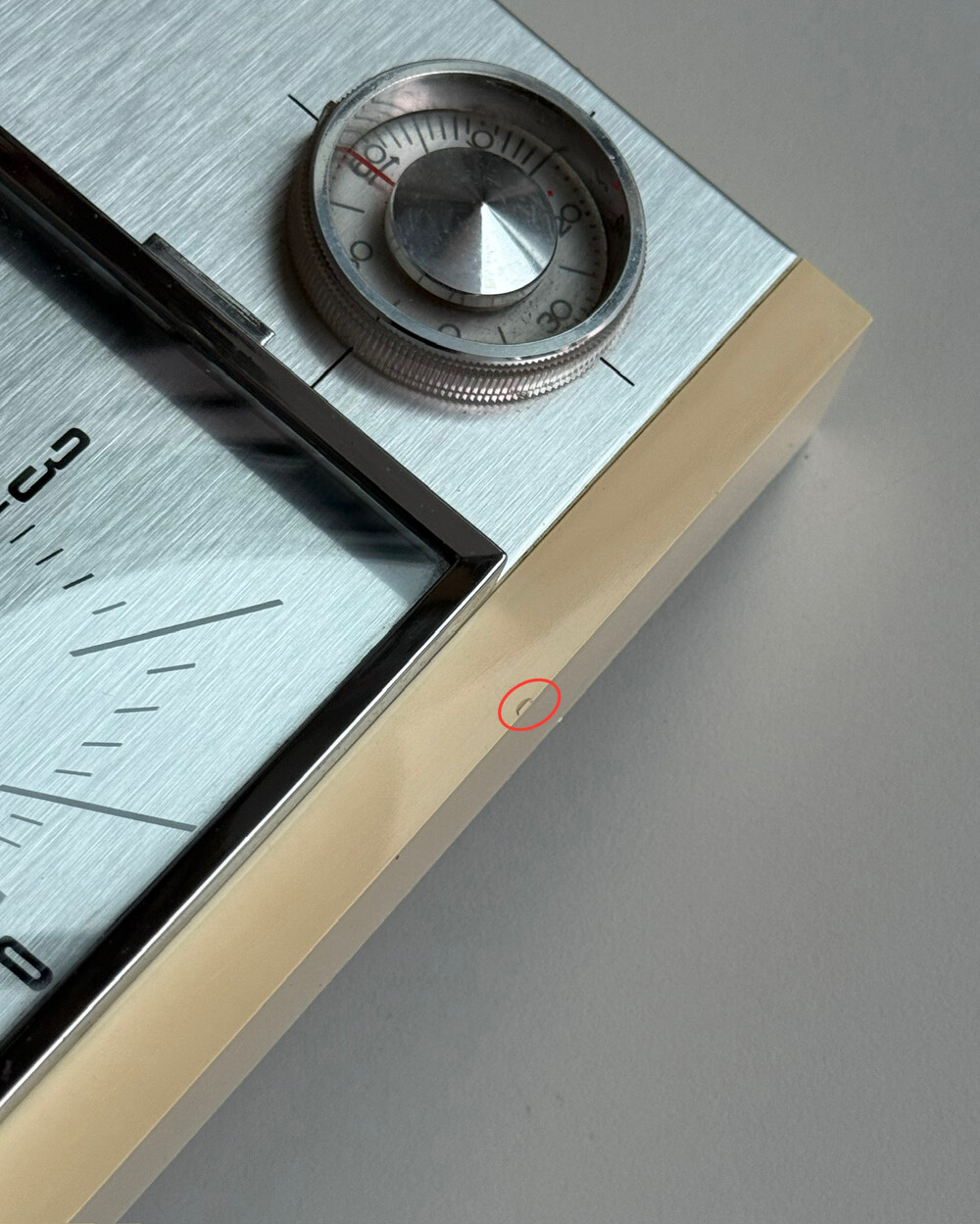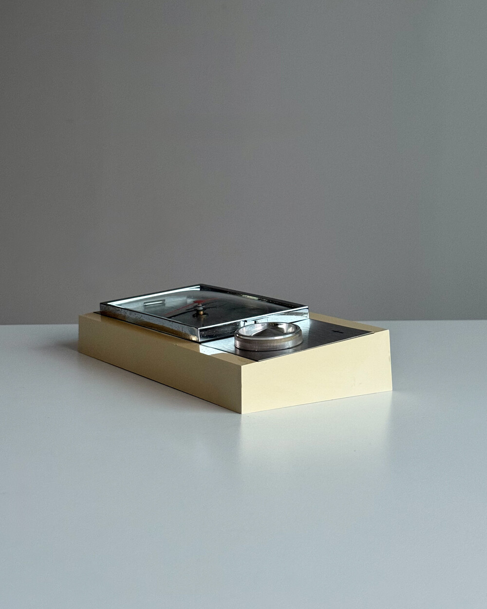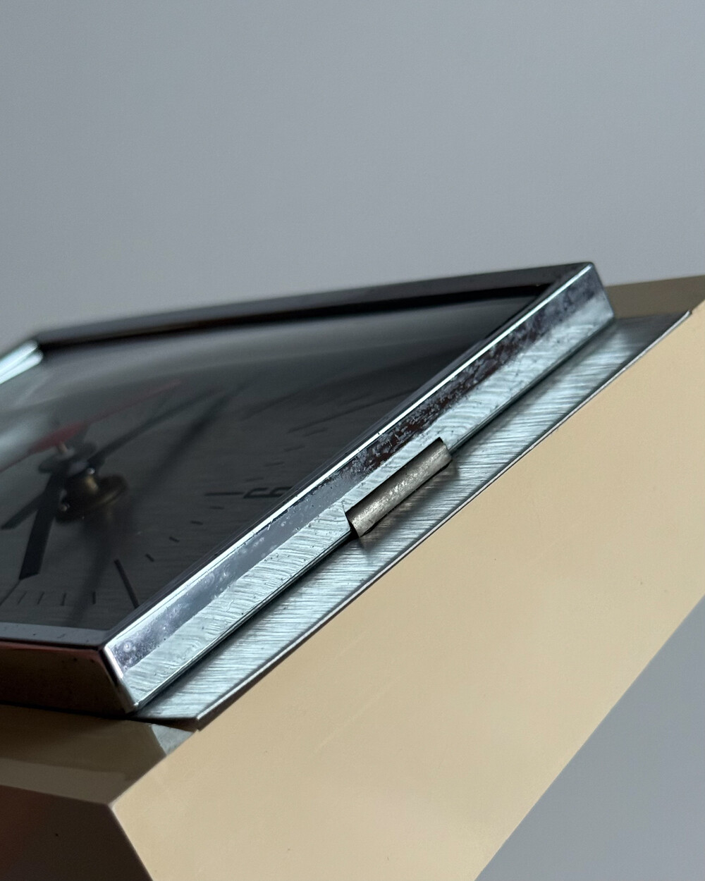70년도 독일 PEWETA사에서 생산된 빈티지 벽 시계입니다. 직사각형 프레임의 태닝된 크림 베이스와 매탈릭한 실버 패널로 이루어진 매력적인 디자인입니다. 우측 하단에는 주방에서 활용도 있게 사용할 수 있는 60분 타이머가 달려있습니다.