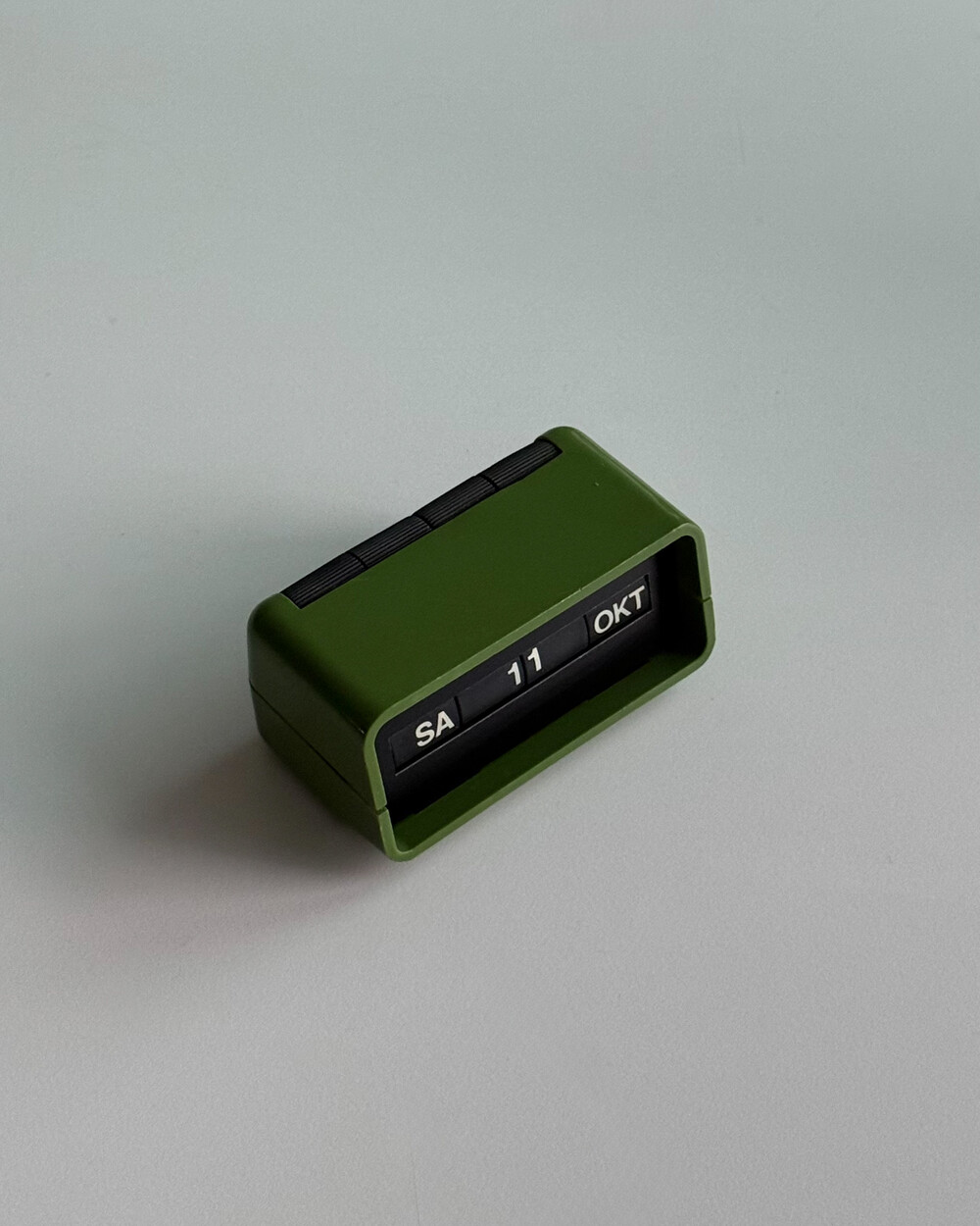 1970년대 독일 데스크용품회사인 Arlac에서 제작된 빈티지 퍼페추얼 데스크 캘린더 Dati 입니다. 배터리 없이 수동으로 넘겨가며 사용하는 만년 캘린더로, 상단에 있는 4개의 상단의 다이얼을 돌려 요일/일/월 을 설정할 수 있어 셋팅과 사용에 제한이 없습니다.