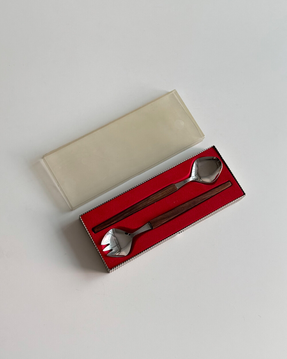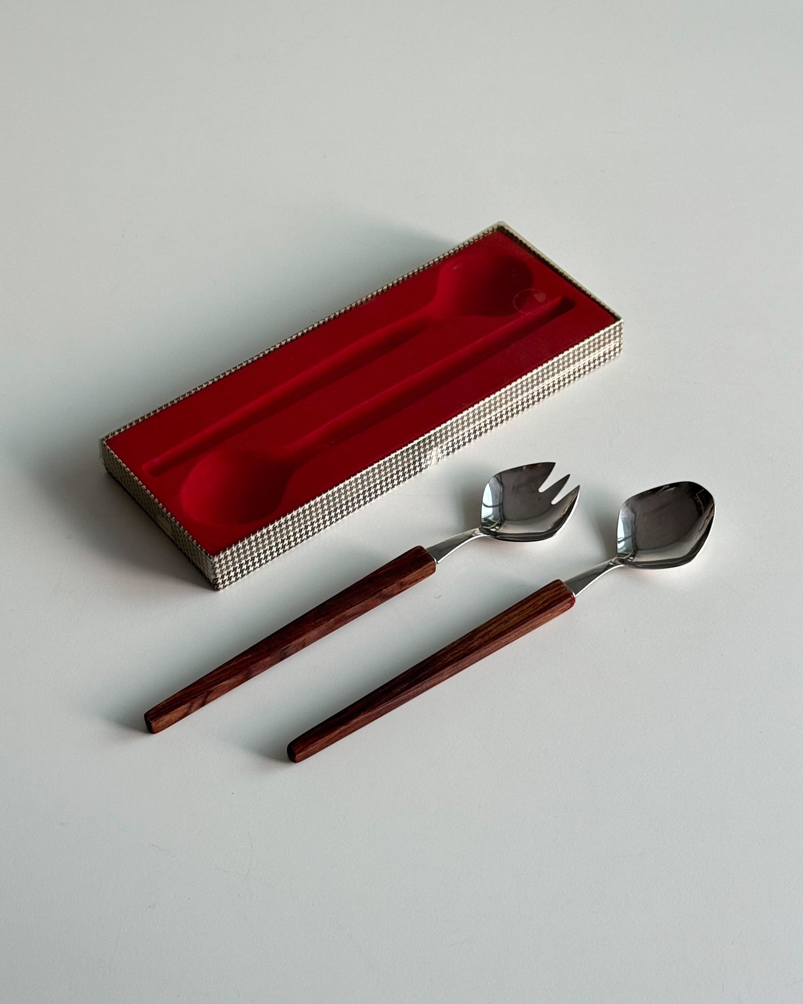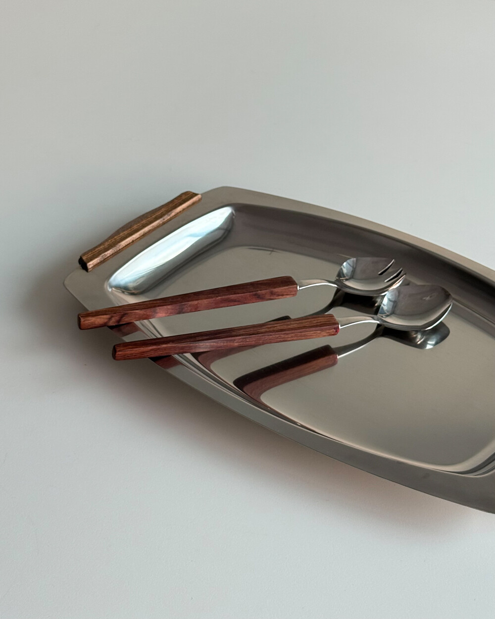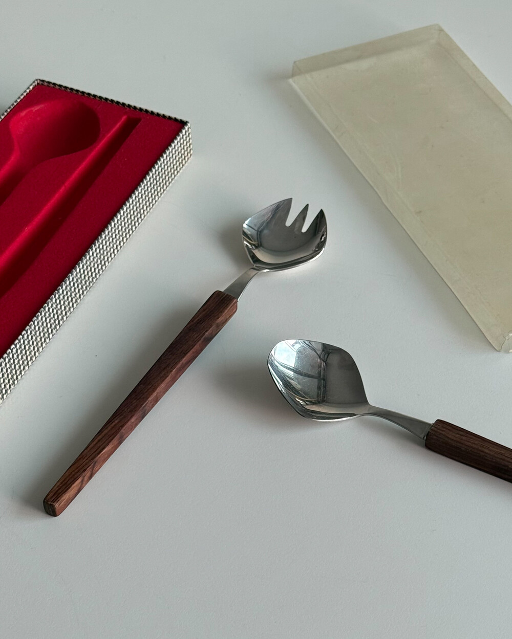 1970년대 생산되었던 빈티지 독일 서빙 커트러리 세트 입니다. 독일에서 제작된 견고한 고품질 제품으로, 고급스러운 로즈우드 핸들과 내구성이 좋은 고급 크로마간 소재로 이루어져 있습니다. 포크와 스푼 모두 17cm의 크기로, 1인 디너 커트러리로 사용하기 적합한 사이즈 입니다.