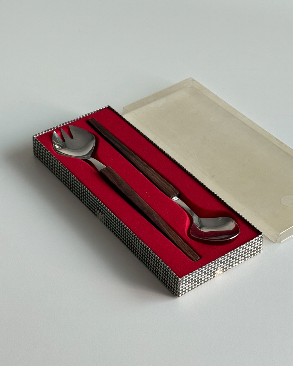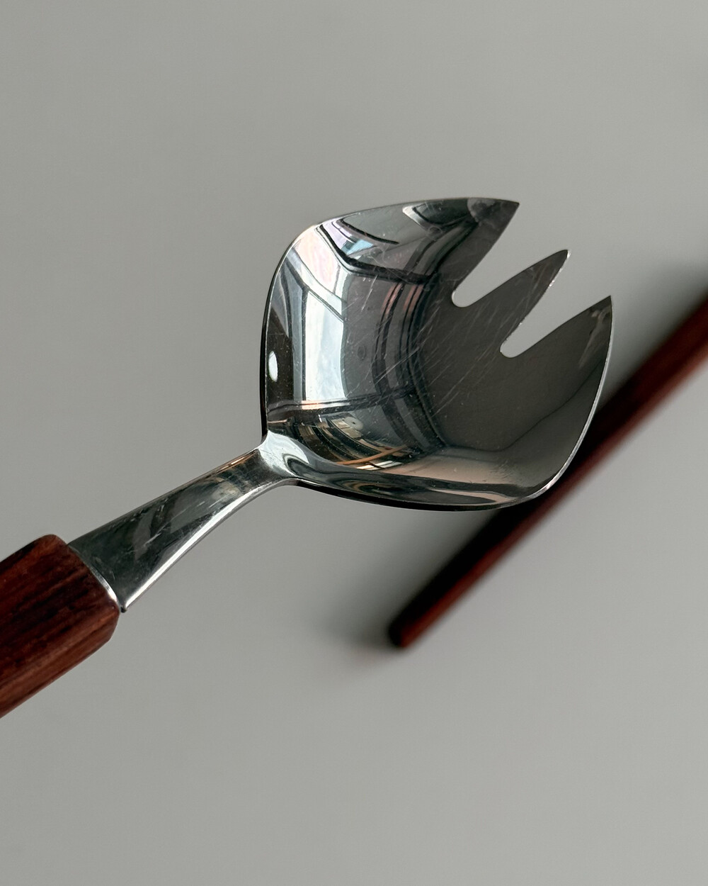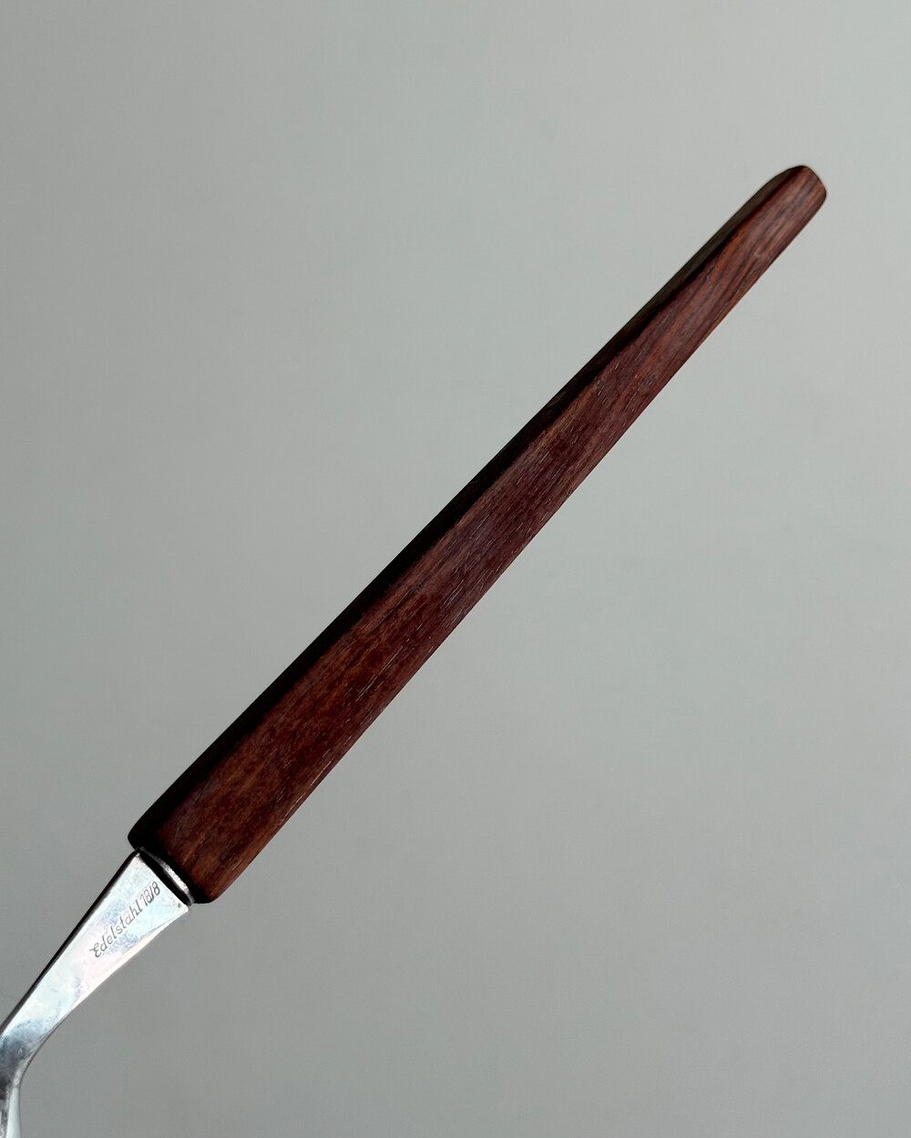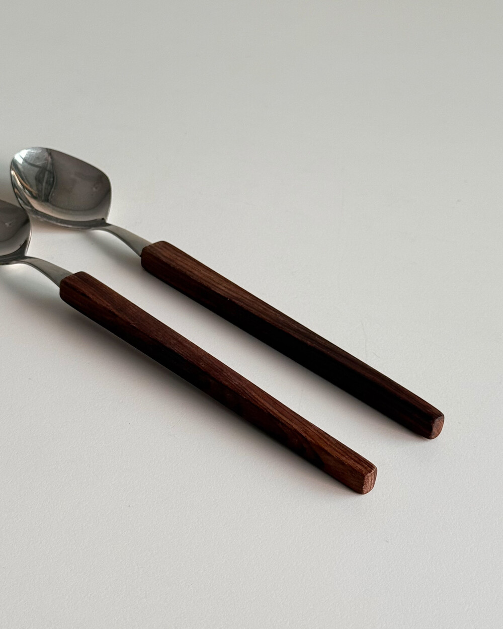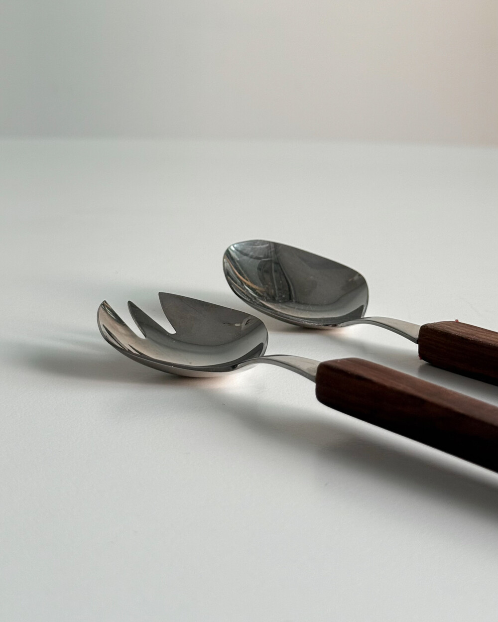 1970년대 생산되었던 빈티지 독일 서빙 커트러리 세트 입니다. 독일에서 제작된 견고한 고품질 제품으로, 고급스러운 로즈우드 핸들과 내구성이 좋은 고급 크로마간 소재로 이루어져 있습니다. 포크와 스푼 모두 17cm의 크기로, 1인 디너 커트러리로 사용하기 적합한 사이즈 입니다.