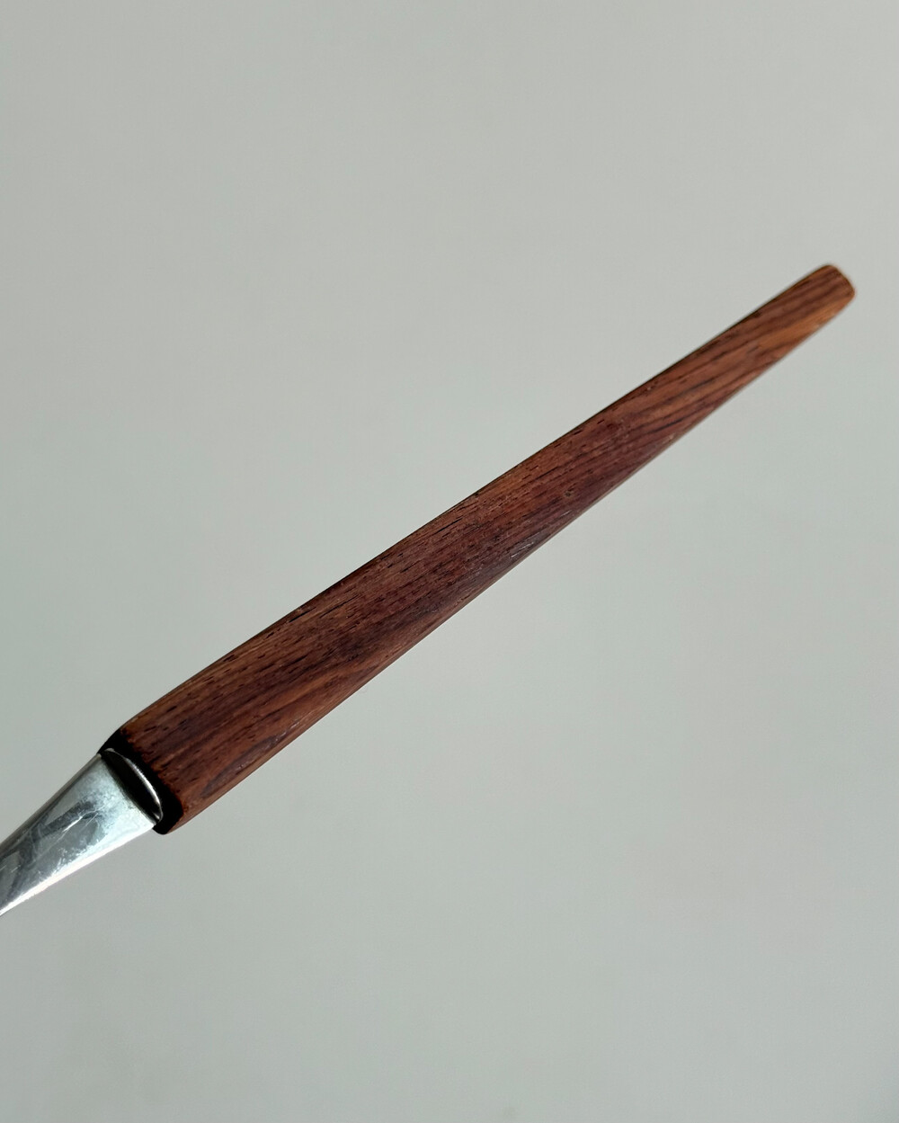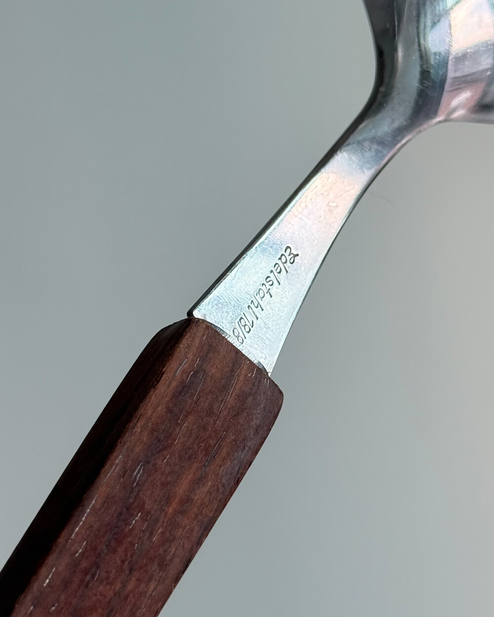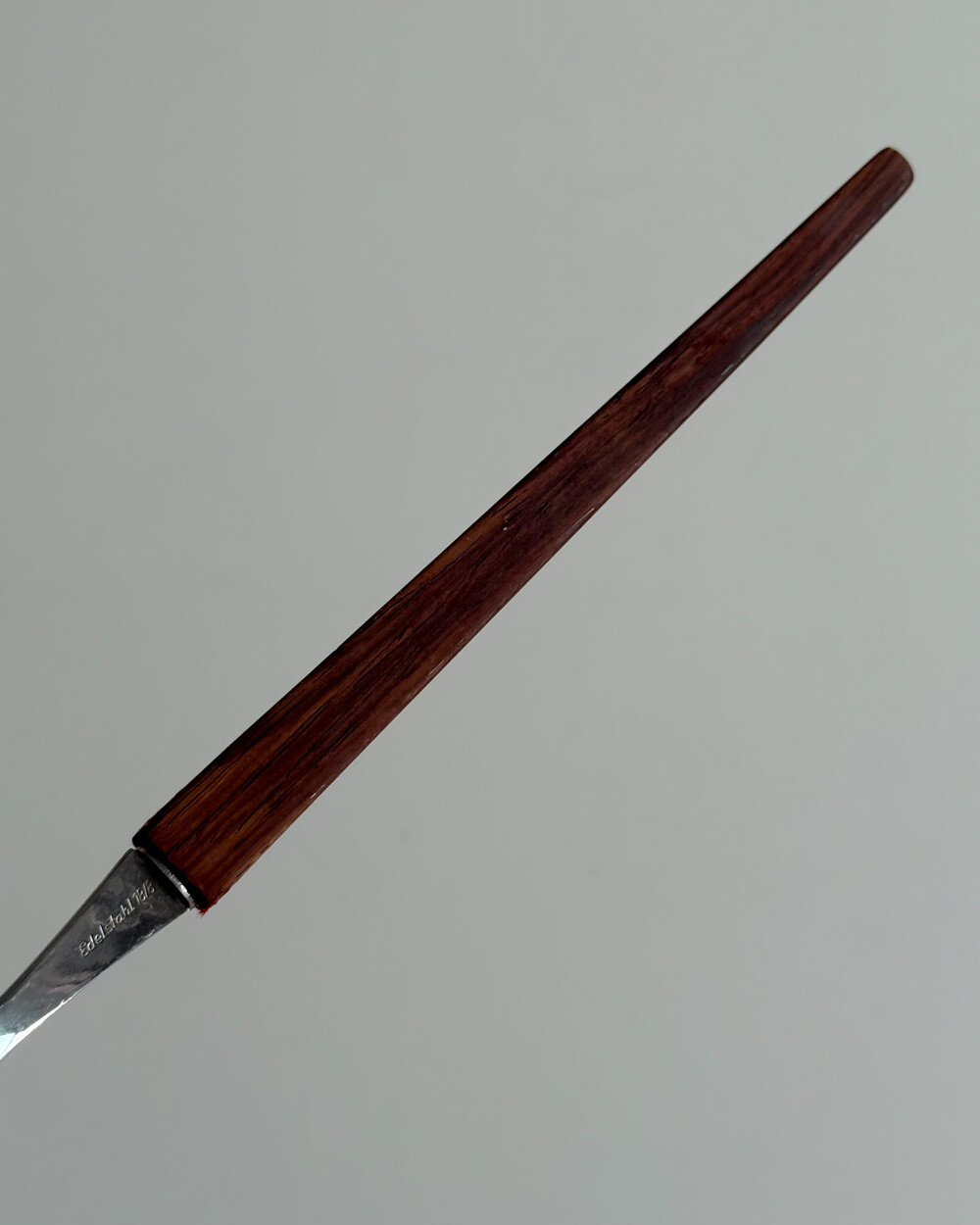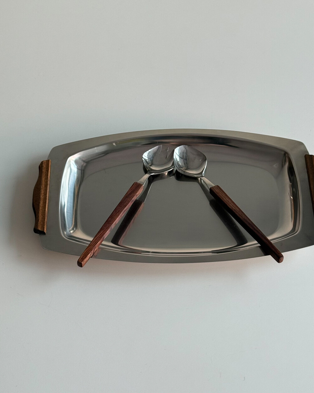 1970년대 생산되었던 빈티지 독일 서빙 커트러리 세트 입니다. 독일에서 제작된 견고한 고품질 제품으로, 고급스러운 로즈우드 핸들과 내구성이 좋은 고급 크로마간 소재로 이루어져 있습니다. 포크와 스푼 모두 17cm의 크기로, 1인 디너 커트러리로 사용하기 적합한 사이즈 입니다.