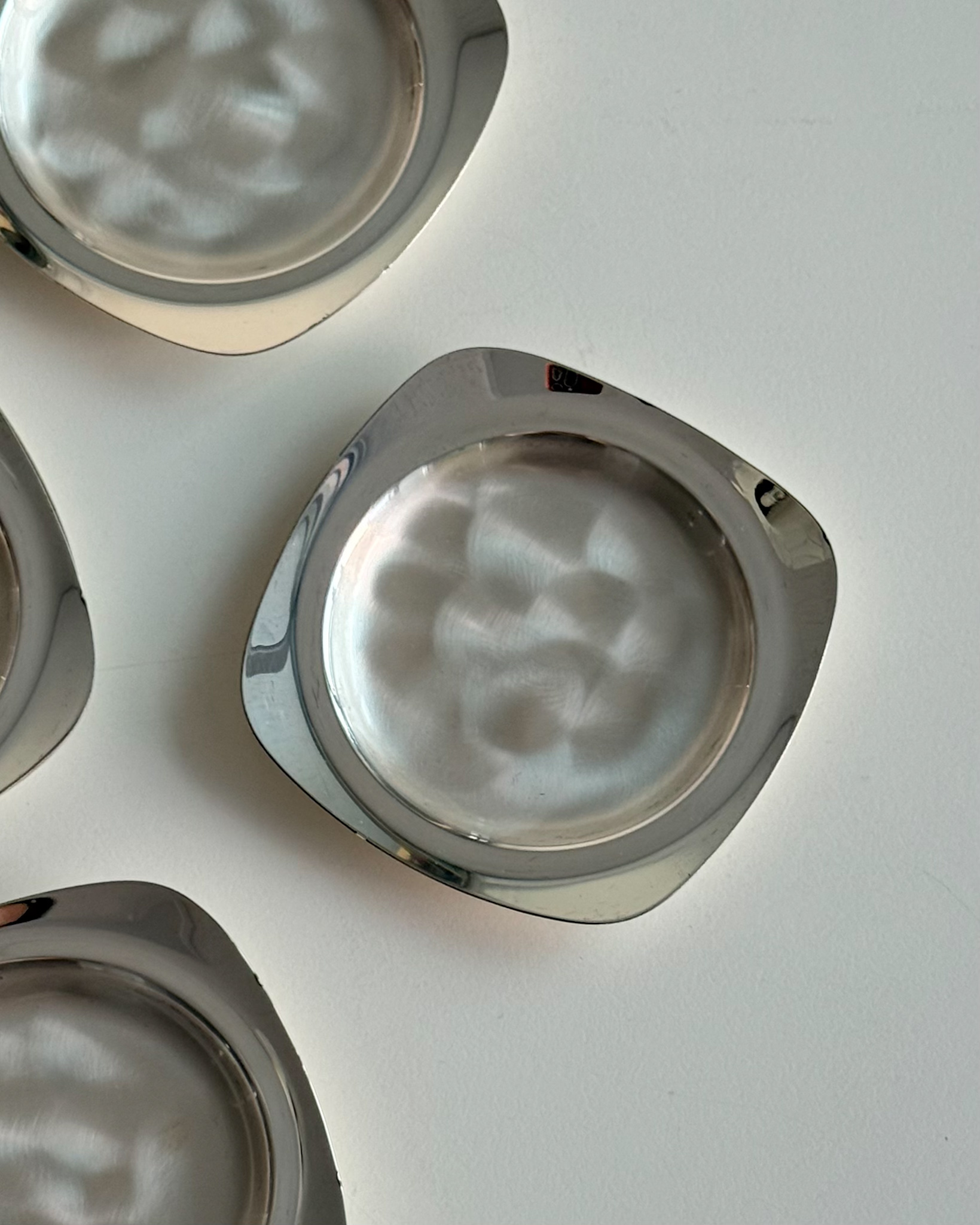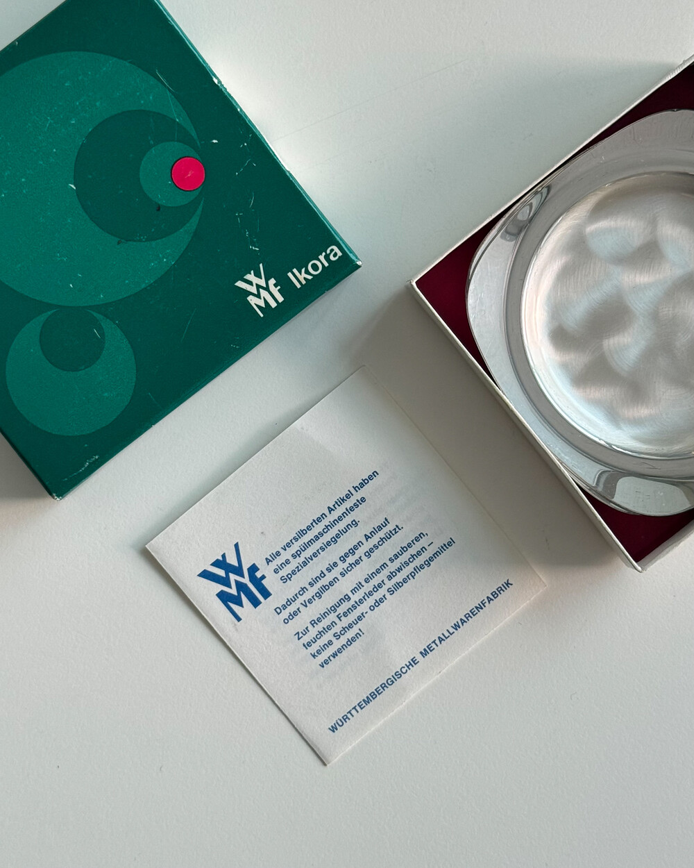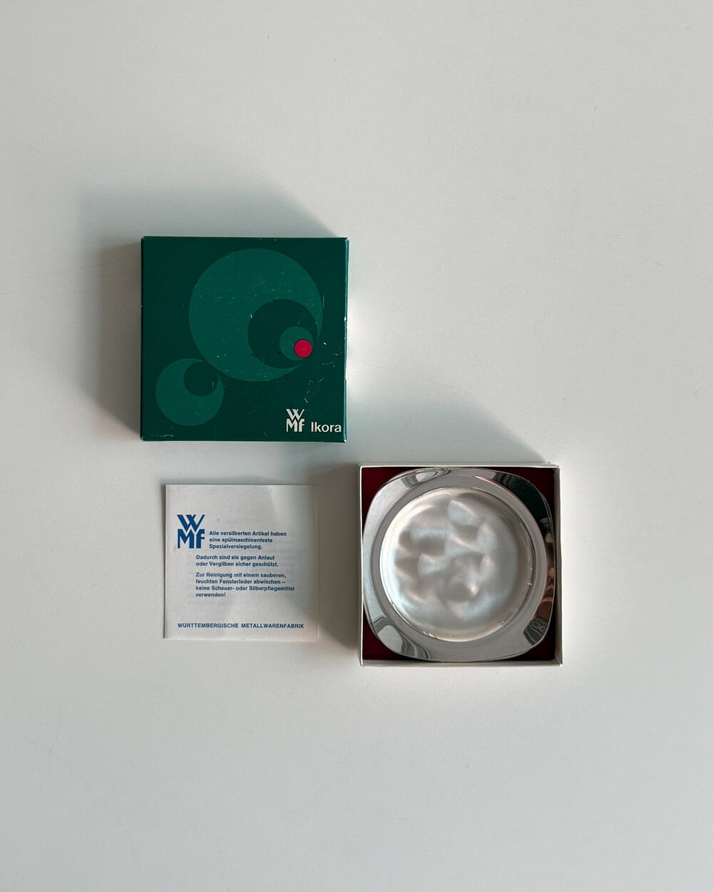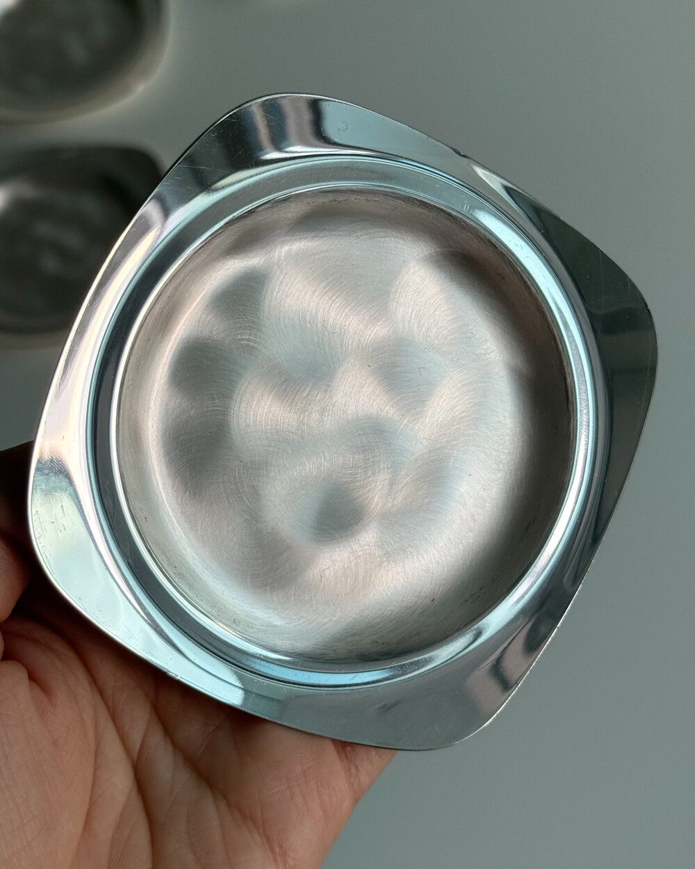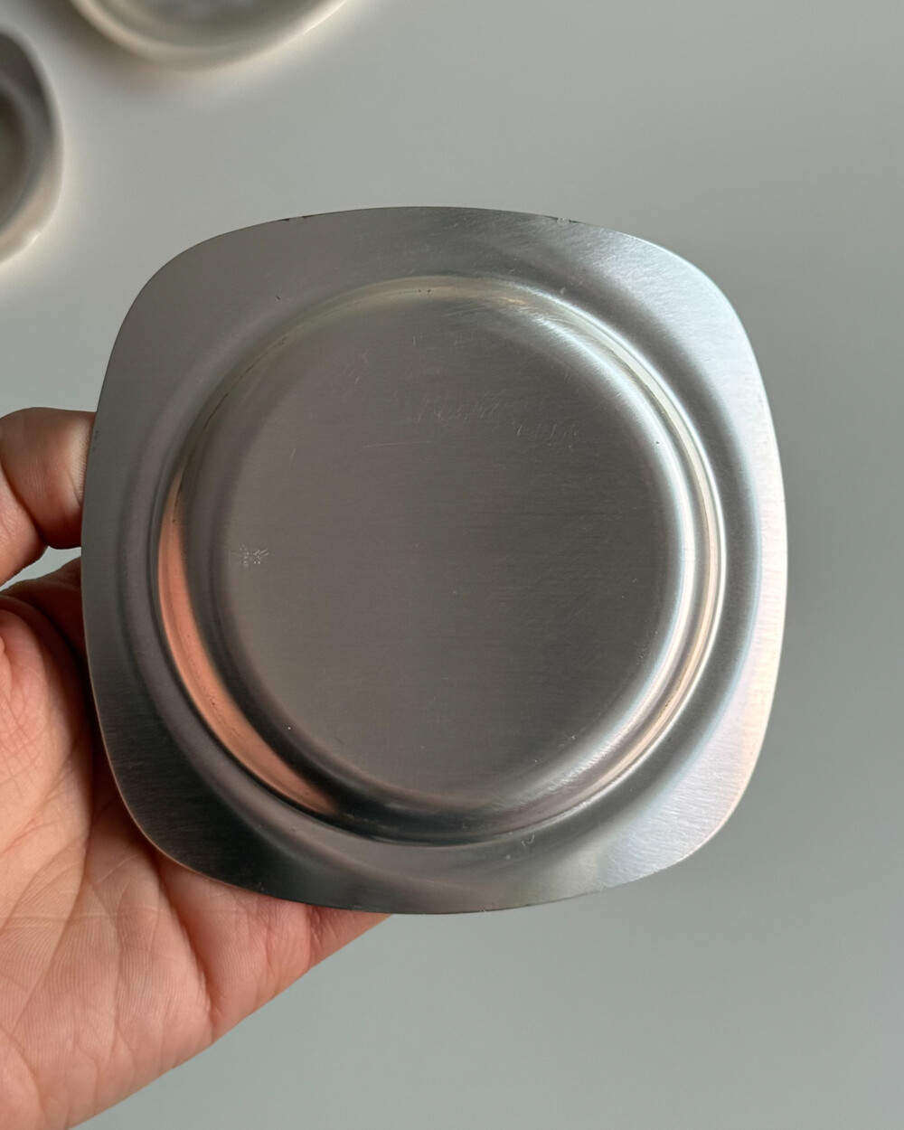 1970년도 WMF IKORA 라인의 코스터 세트 입니다. 중앙 부분의 독특한 질감 처리와 우아한 곡선미가 돋보이는 이 제품은 찻잔 받침, 액세서리 트레이, 또는 장식용 미니 접시 등 다양한 용도로 활용하기 좋습니다.