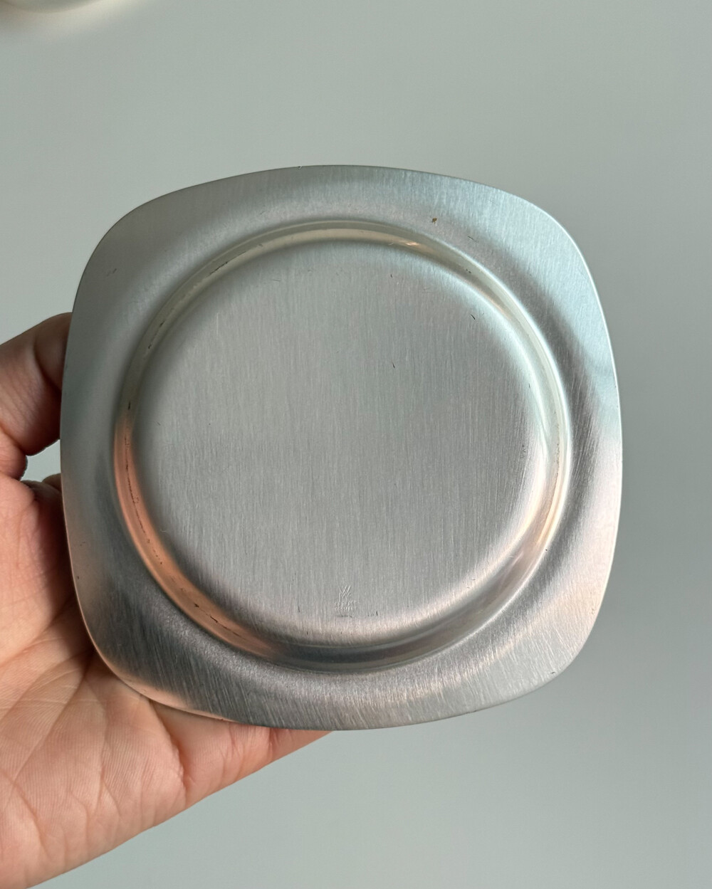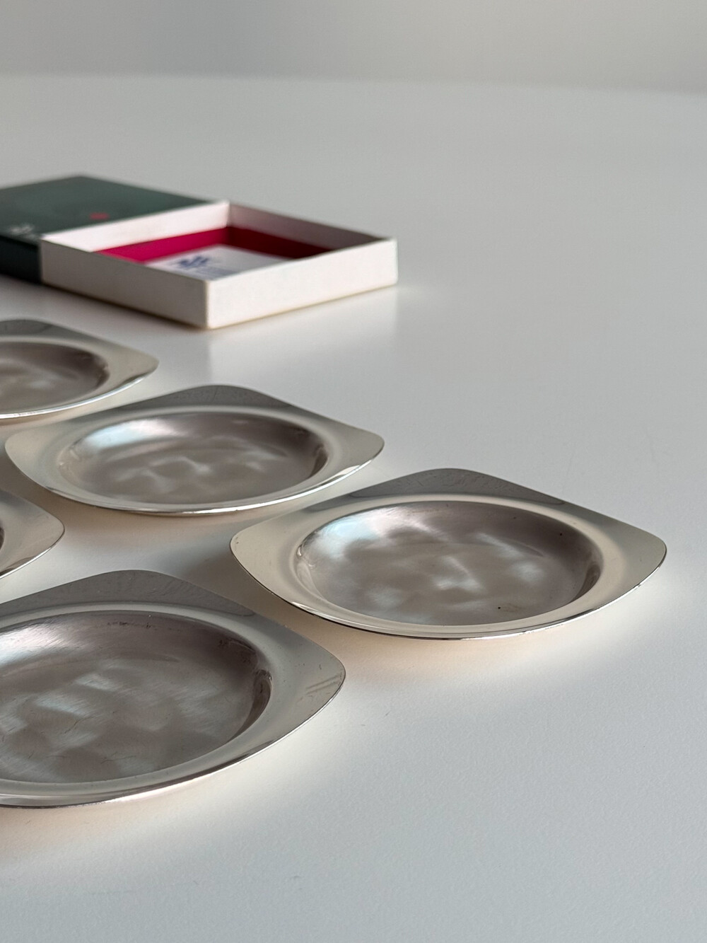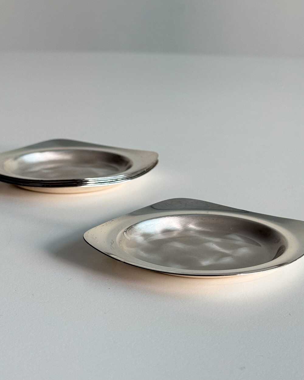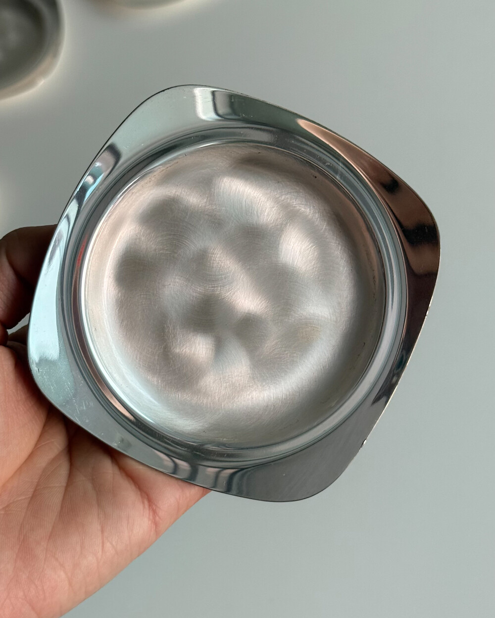 1970년도 WMF IKORA 라인의 코스터 세트 입니다. 중앙 부분의 독특한 질감 처리와 우아한 곡선미가 돋보이는 이 제품은 찻잔 받침, 액세서리 트레이, 또는 장식용 미니 접시 등 다양한 용도로 활용하기 좋습니다.