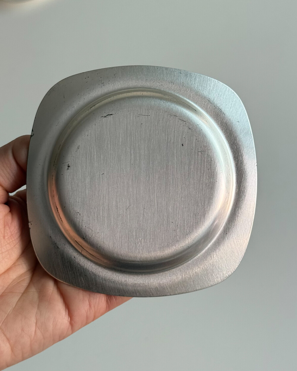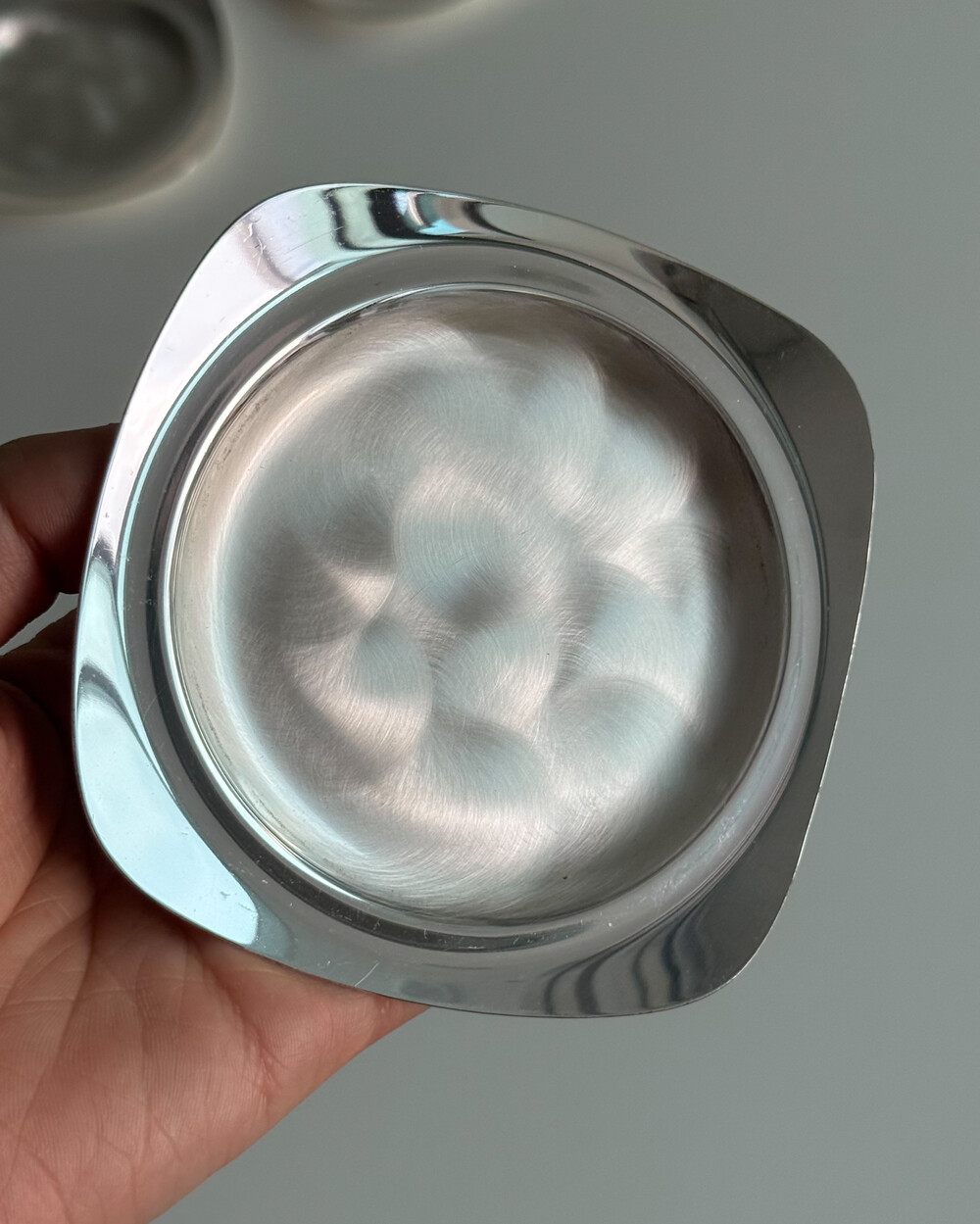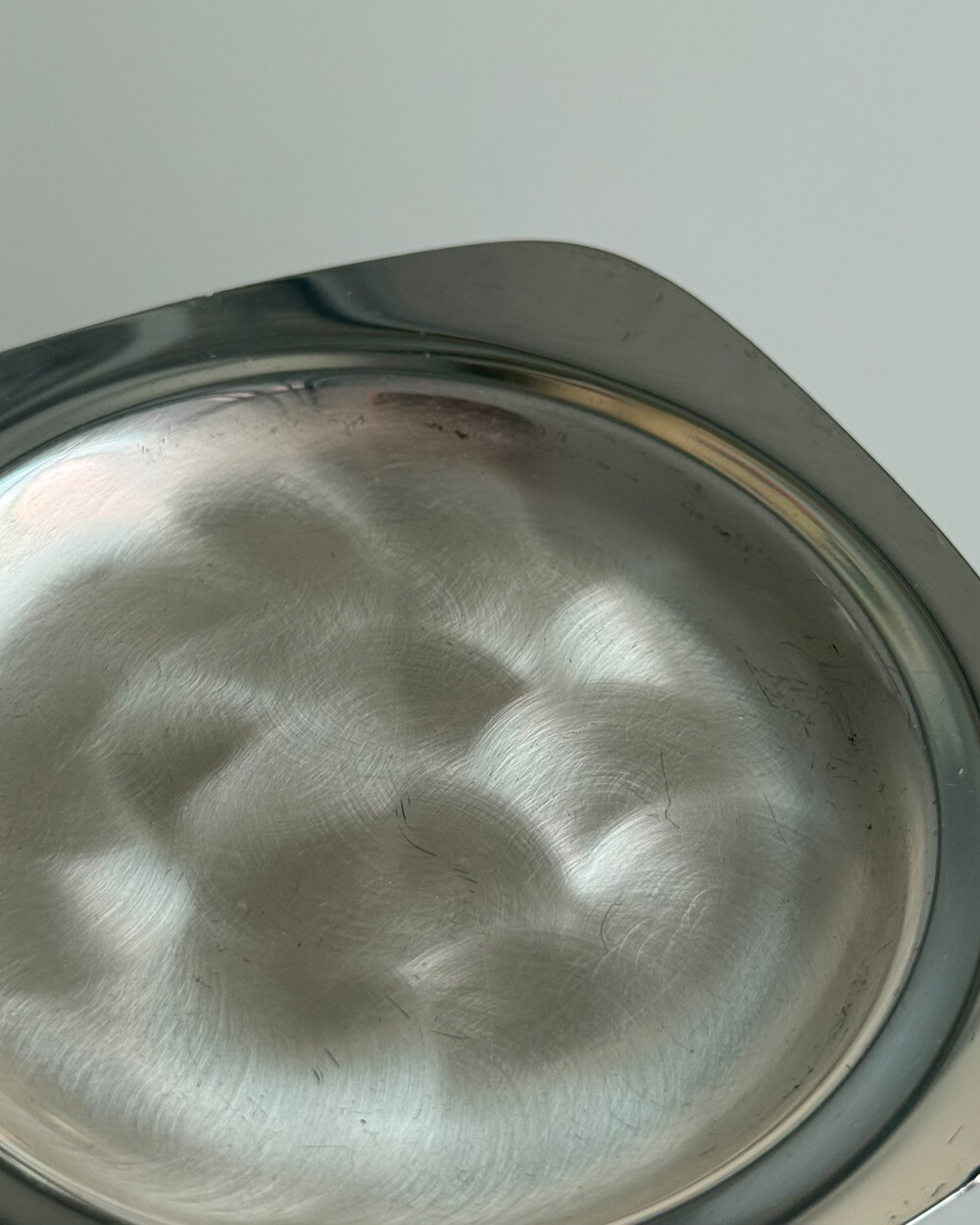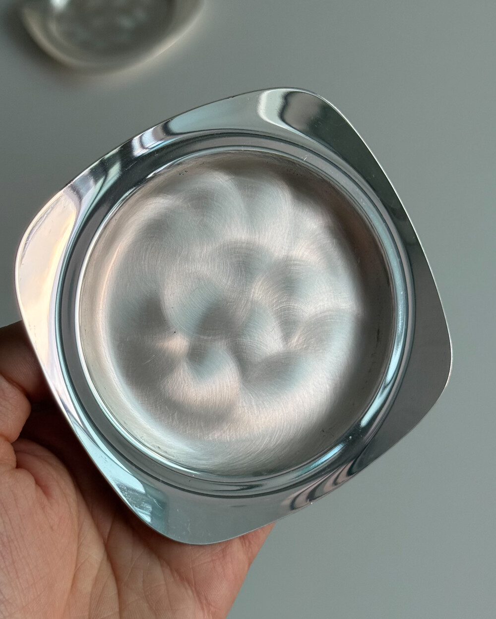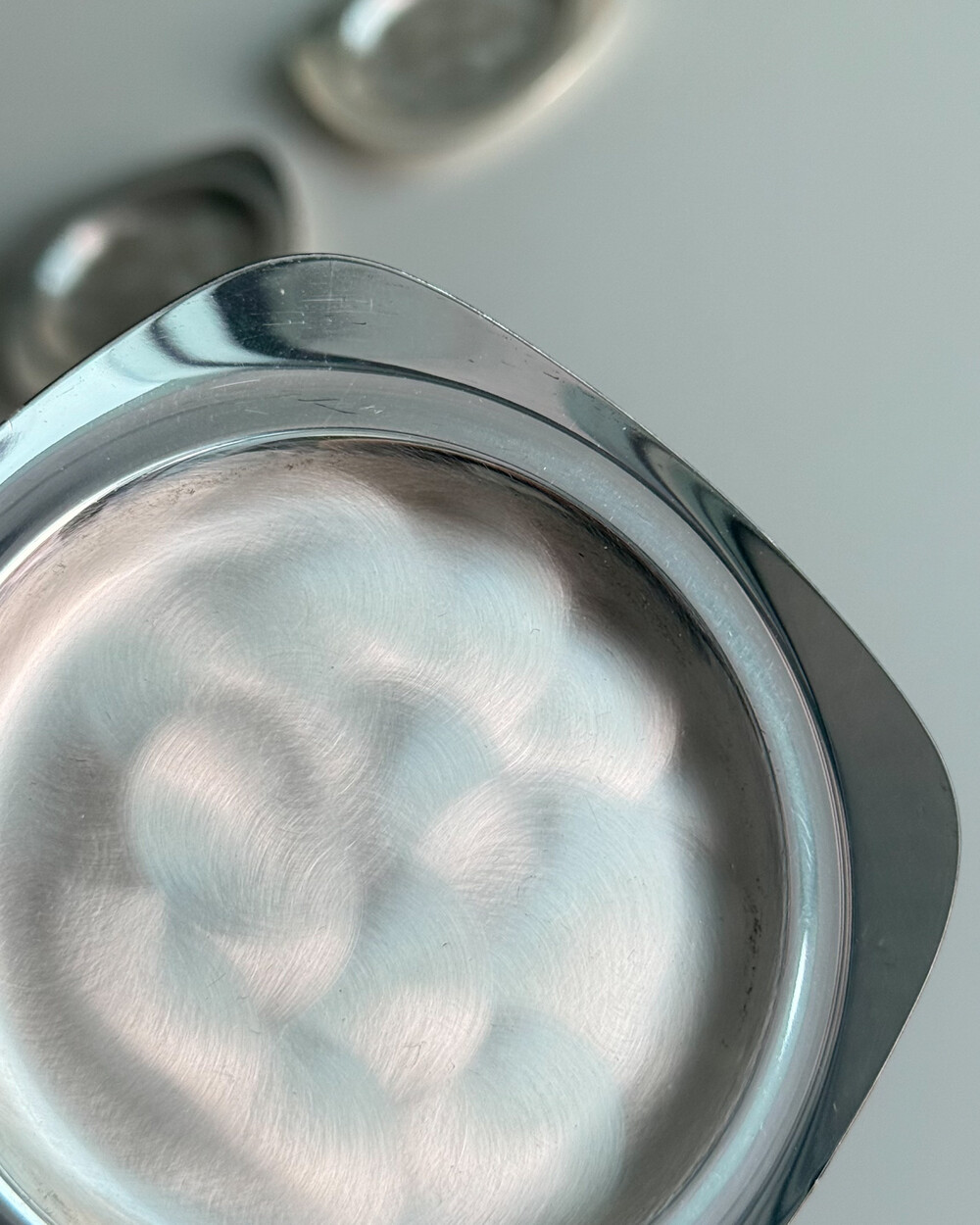 1970년도 WMF IKORA 라인의 코스터 세트 입니다. 중앙 부분의 독특한 질감 처리와 우아한 곡선미가 돋보이는 이 제품은 찻잔 받침, 액세서리 트레이, 또는 장식용 미니 접시 등 다양한 용도로 활용하기 좋습니다.